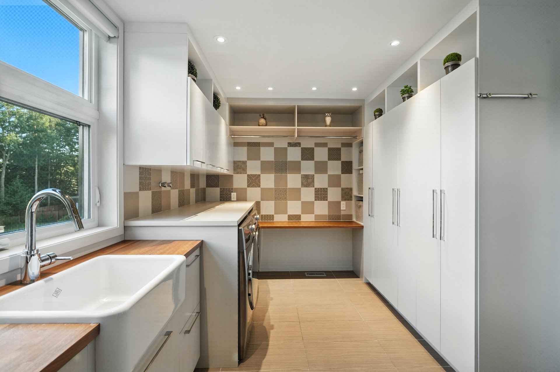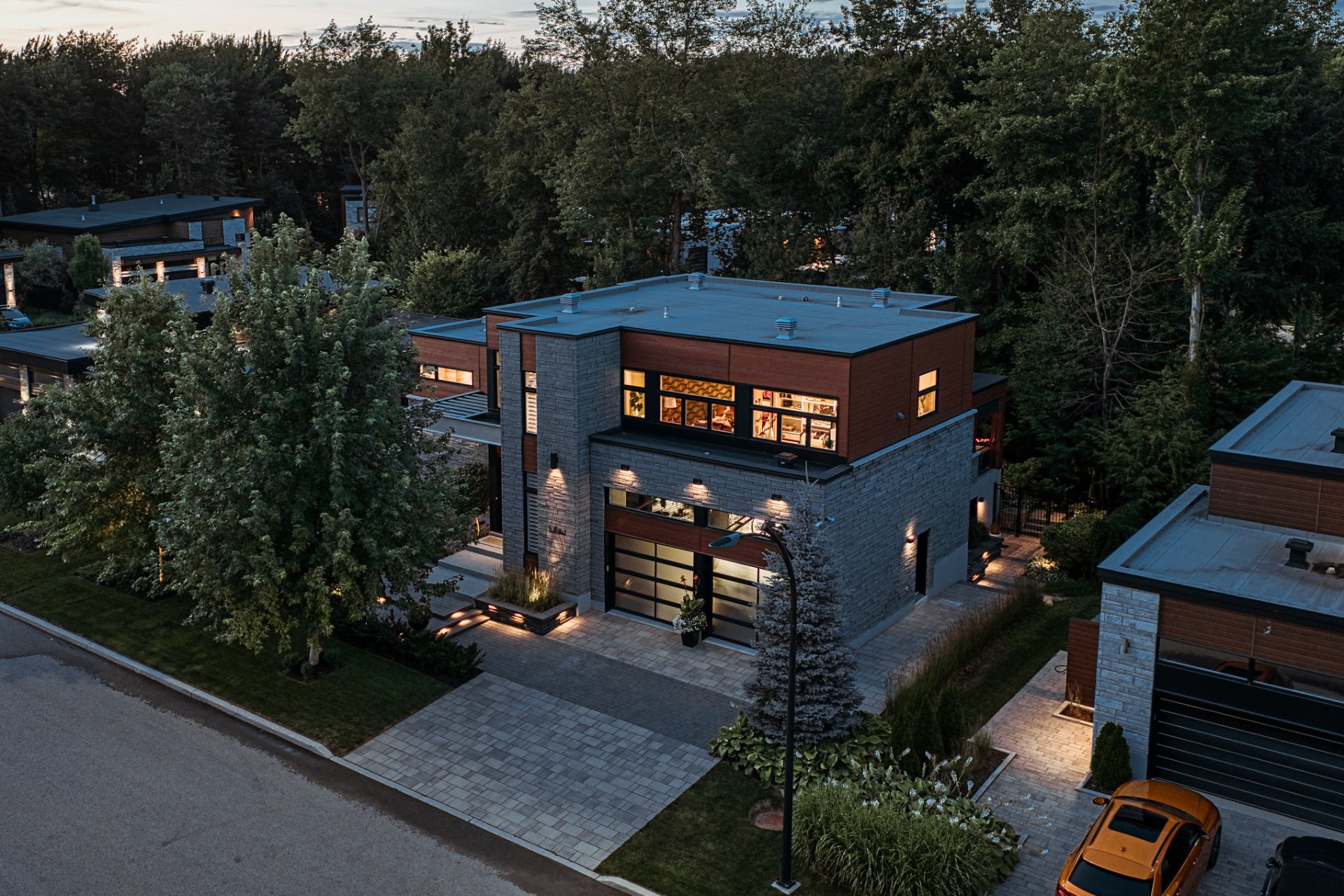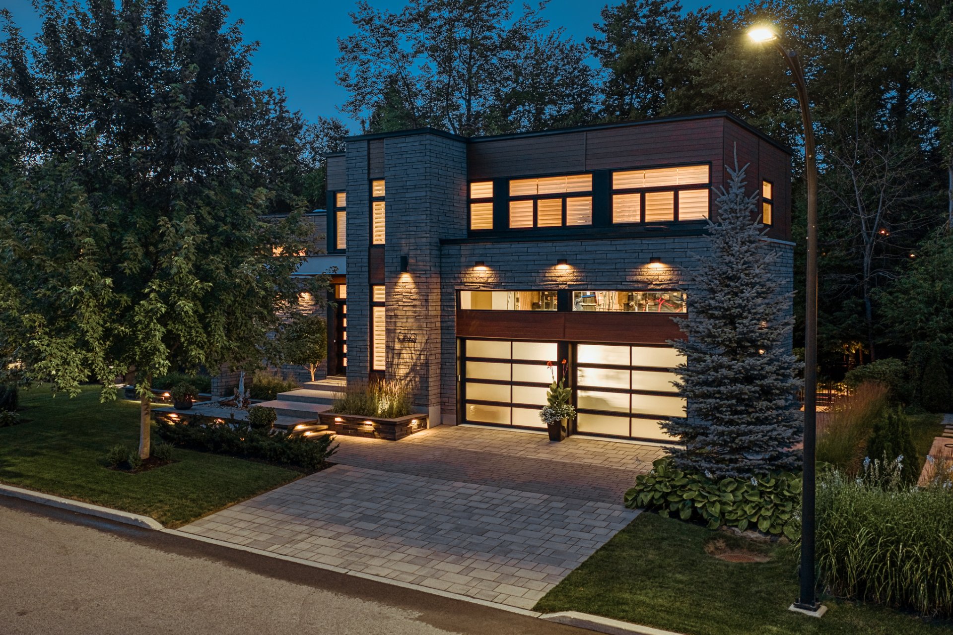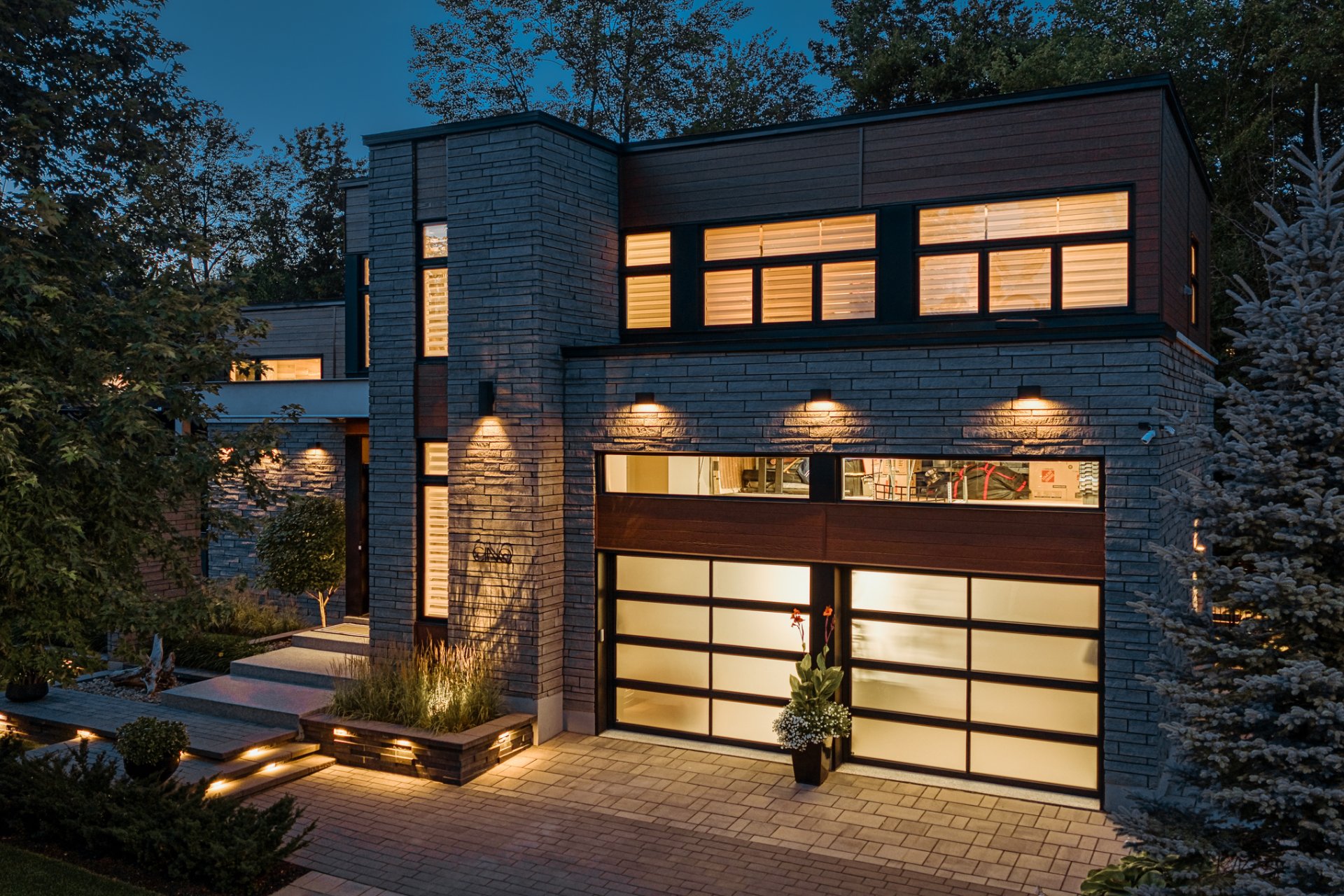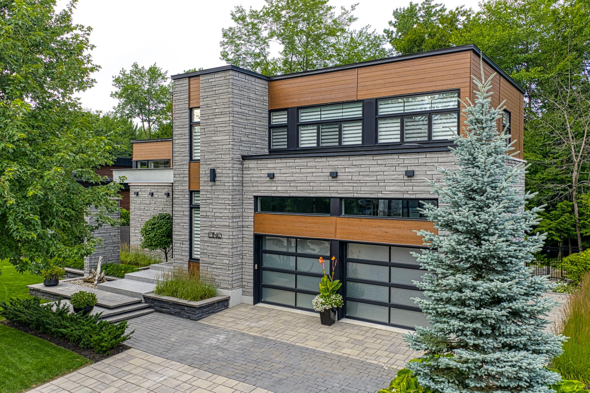 The original wood siding has been replaced with premium Maibec CanExel, ensuring zero maintenance. The immaculate double garage features epoxy flooring, ceramic walls, and mezzanine storage.
