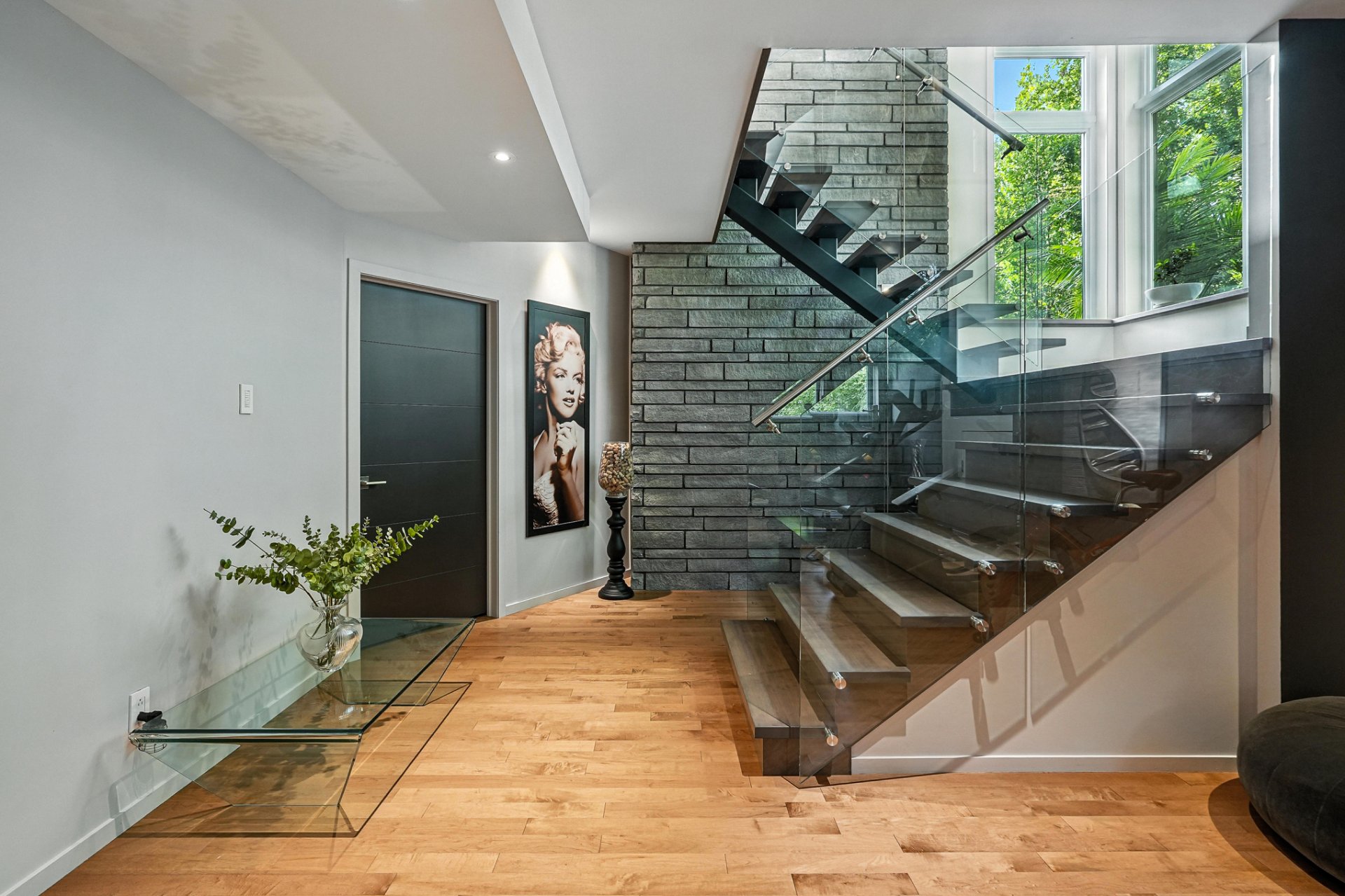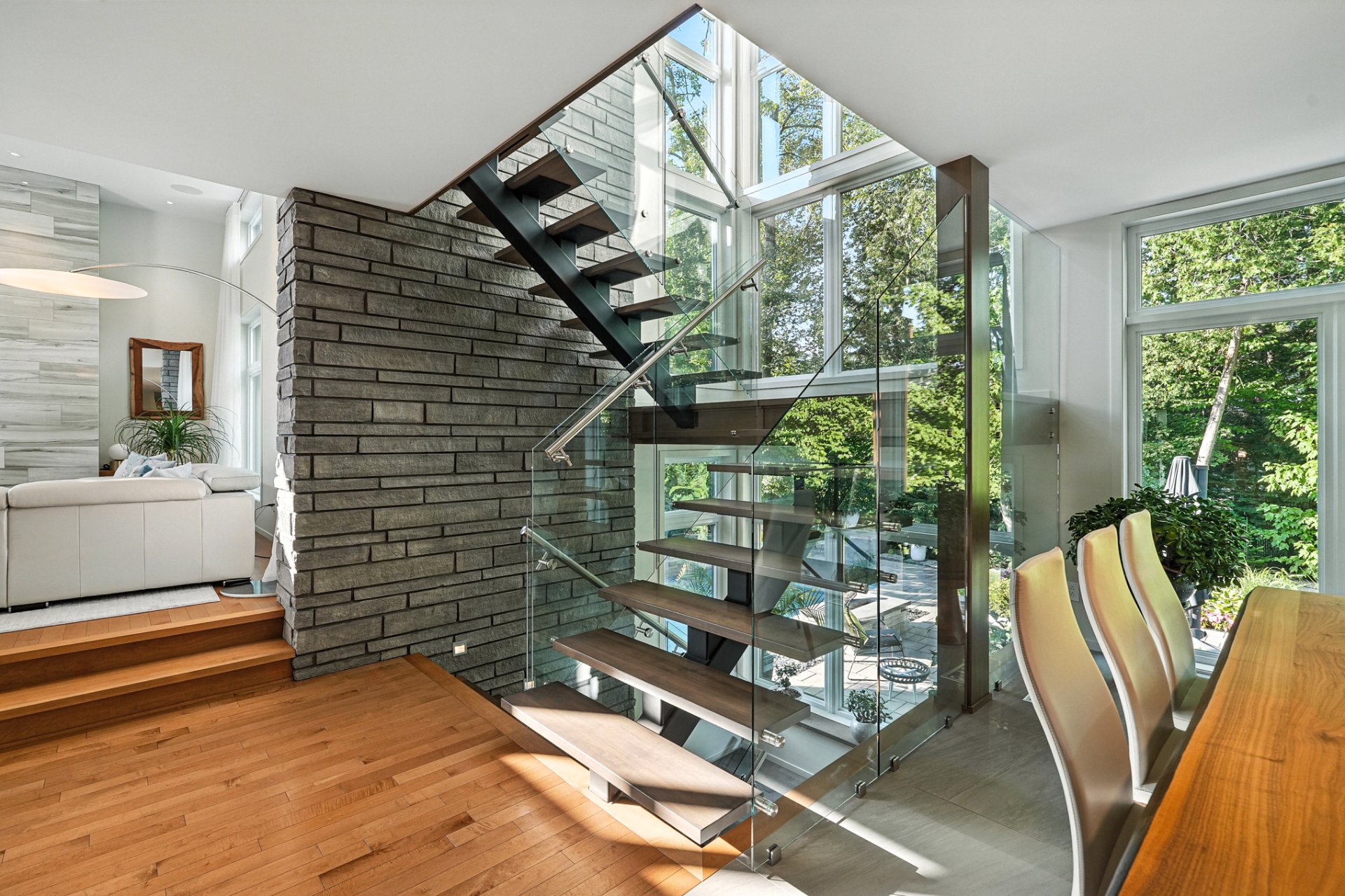 Signature staircase with glass railings and stone wall spanning three levels.