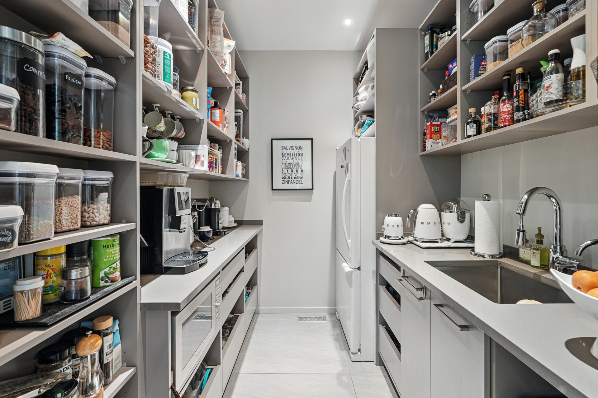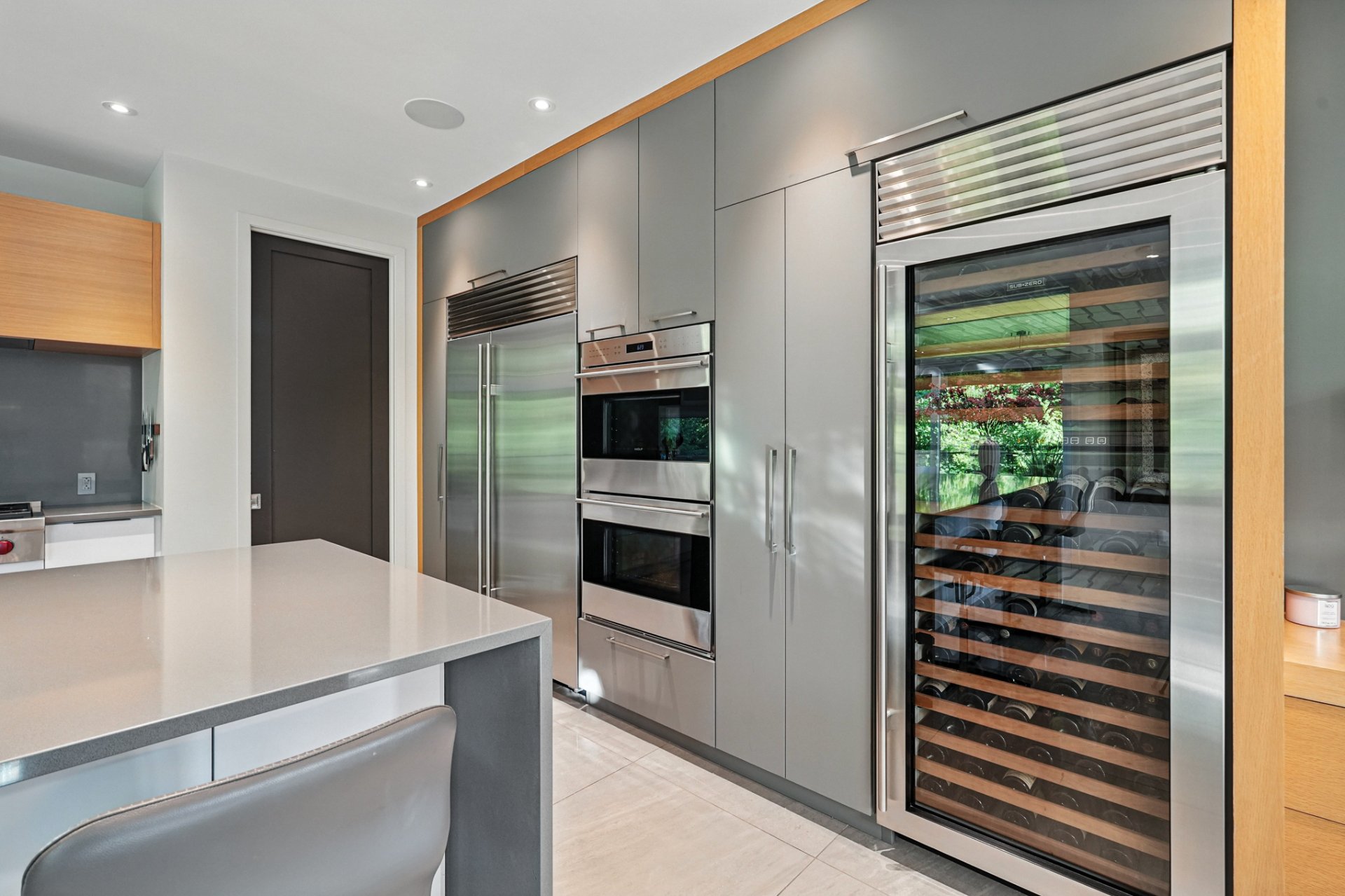 Practical entrance hall with mud room and direct garage access. Majestic living room with over 12-ft ceilings and natural gas fireplace. Gourmet kitchen featuring Wolf, Sub-Zero, and Miele appliances, dual-zone wine cellar, double wall oven, and walk-in pantry with sink.