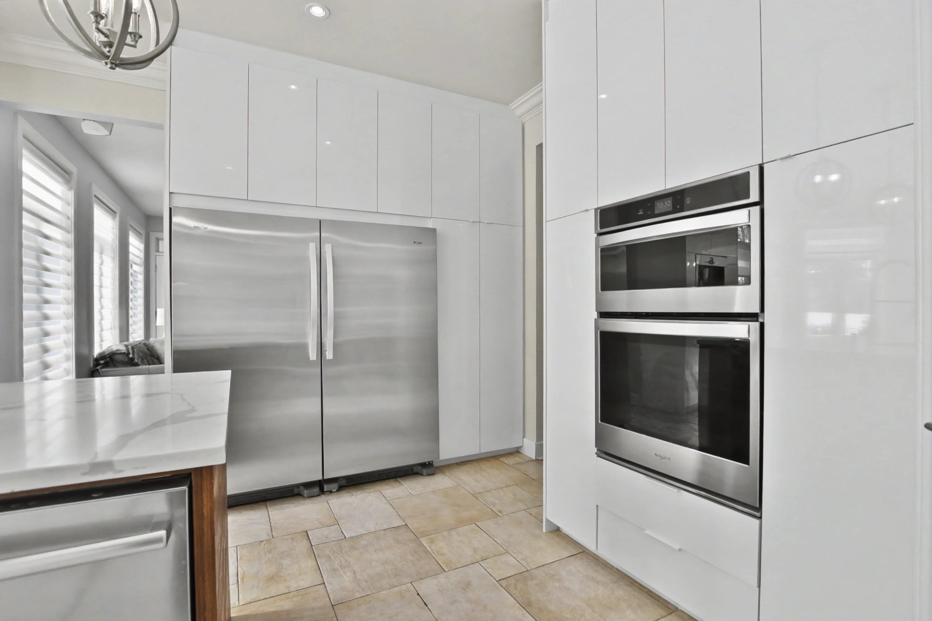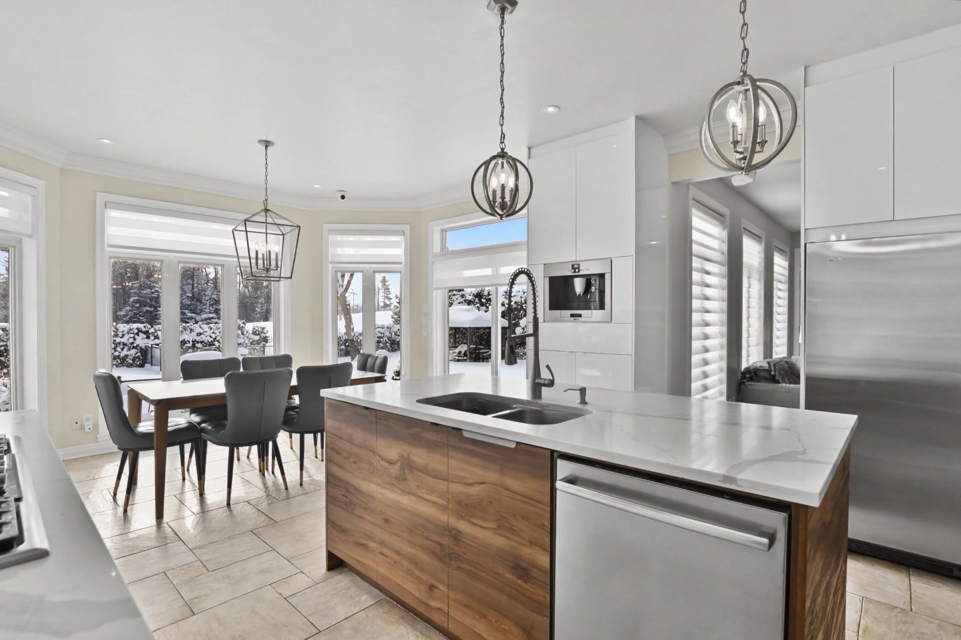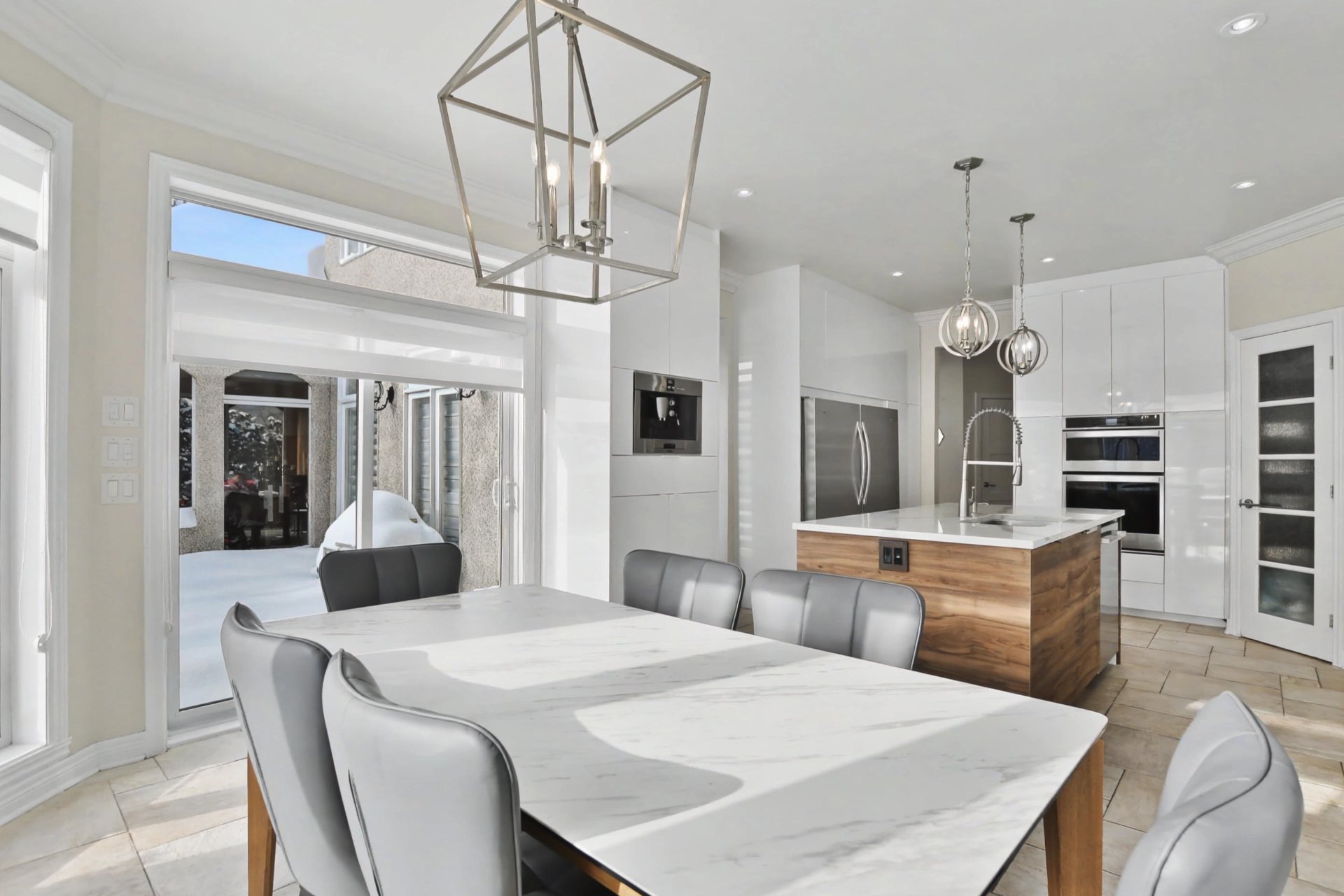 The kitchen, completely renovated in 2020, is equipped with high-end appliances and stands out for its refined design, superior materials, and exceptional functionality, creating an elegant and inviting space ideal for entertaining.