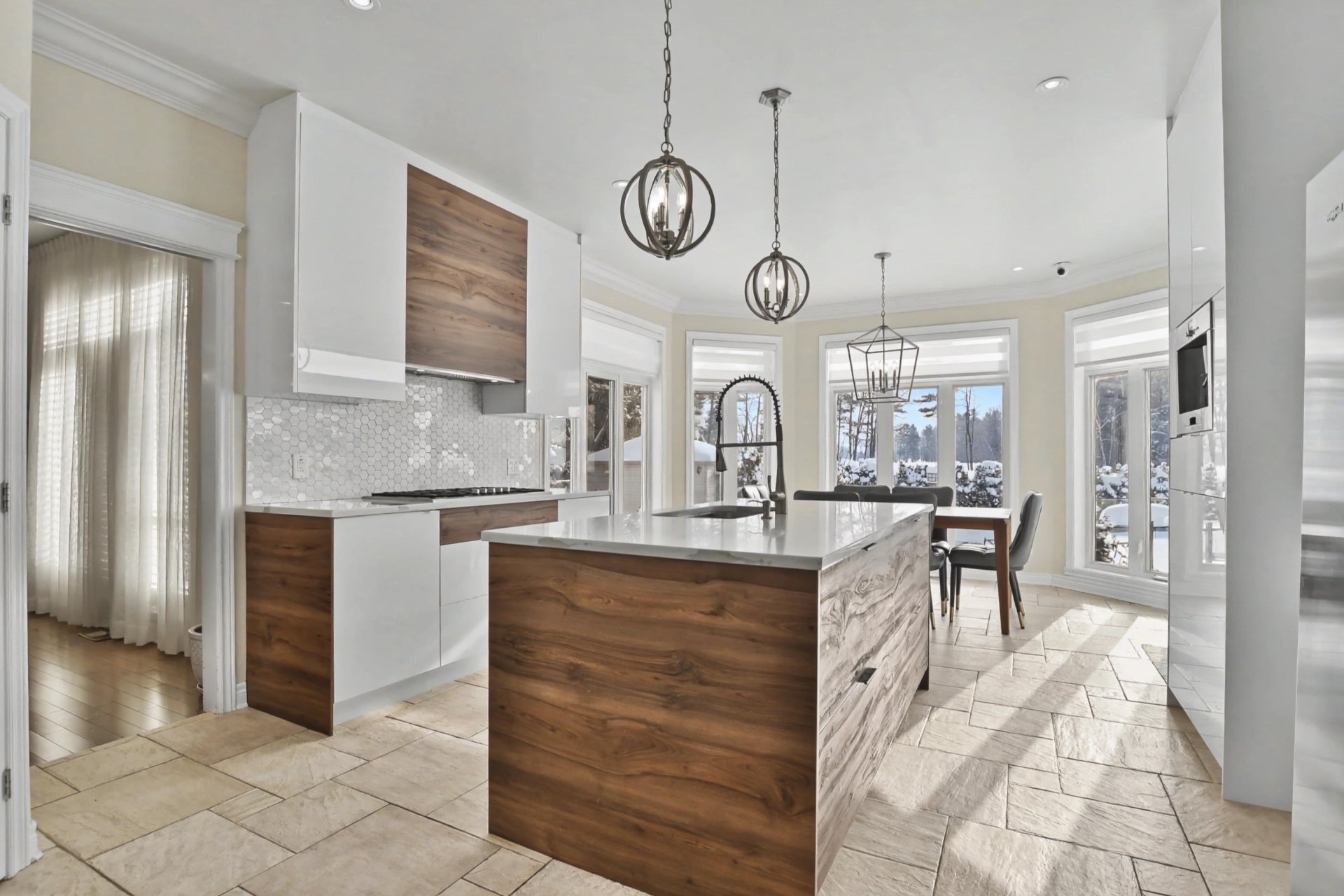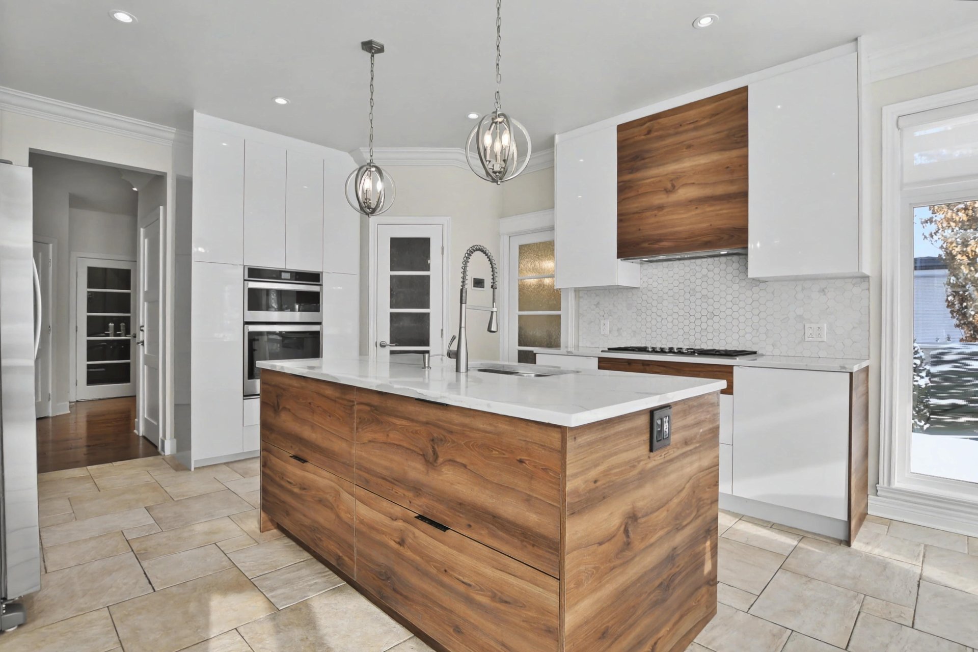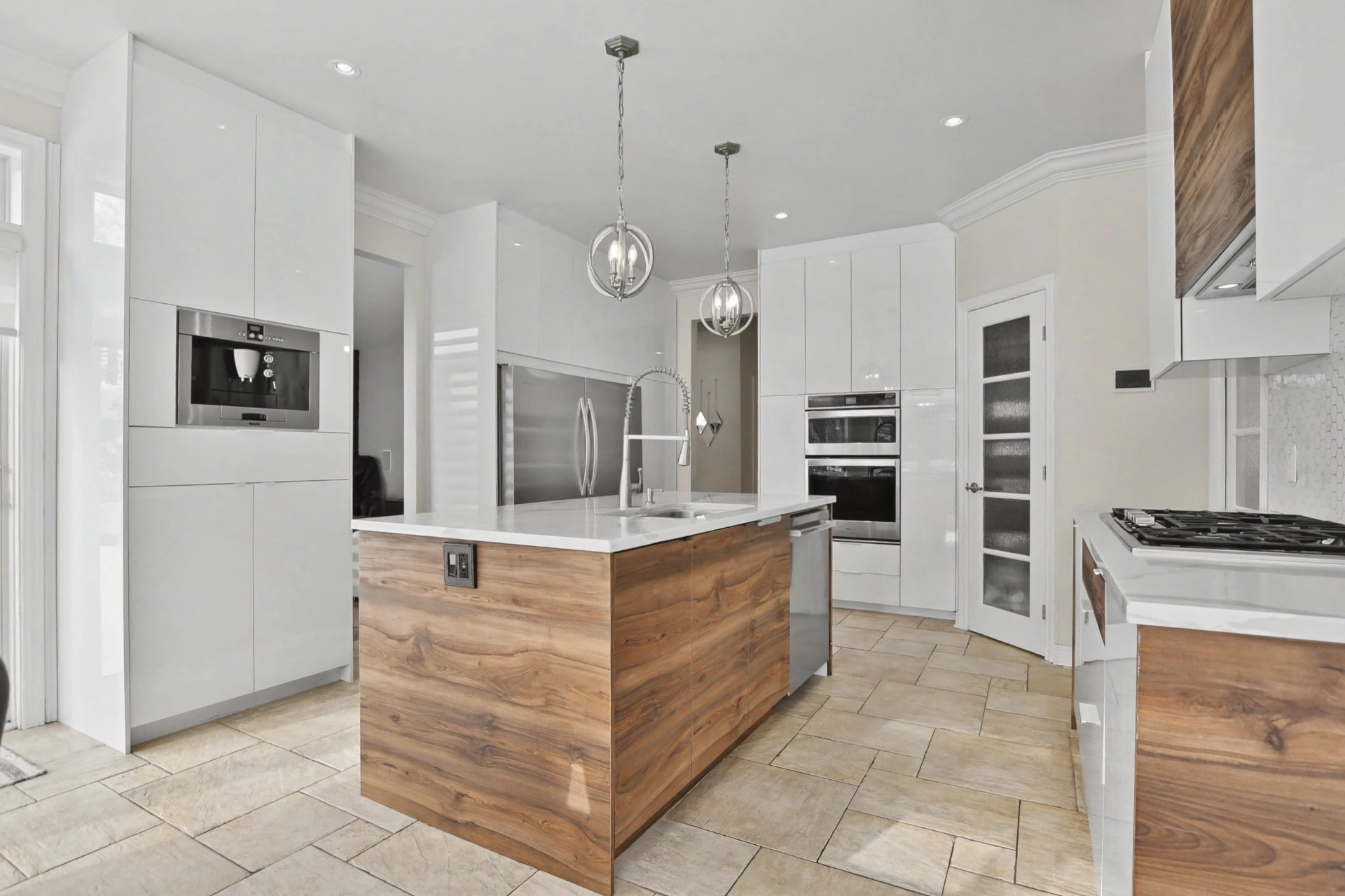 The kitchen, completely renovated in 2020, is equipped with high-end appliances and stands out for its refined design, superior materials, and exceptional functionality, creating an elegant and inviting space ideal for entertaining.