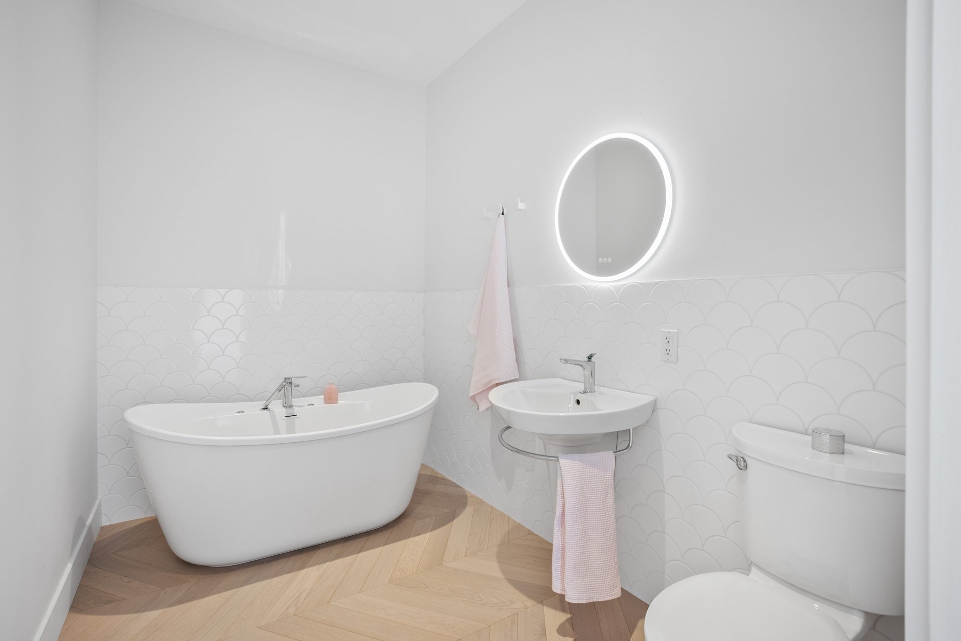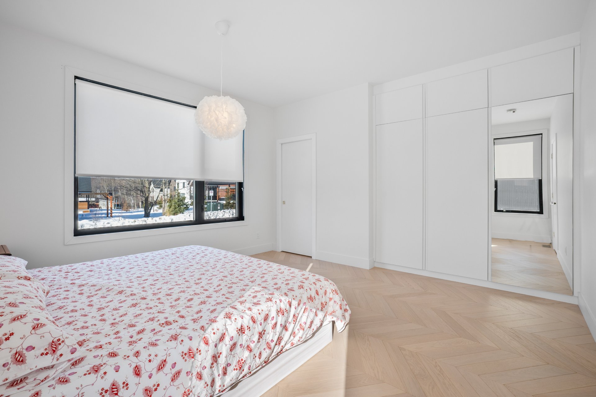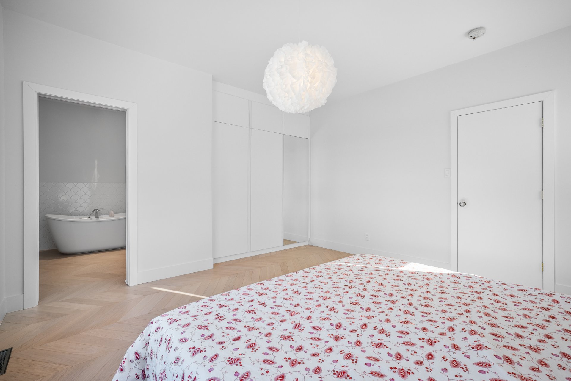 The master bedroom, located on the ground floor, features built-in closets and an elegant en-suite bathroom with a freestanding bathtub. The white oak herringbone flooring adds a touch of timeless refinement.