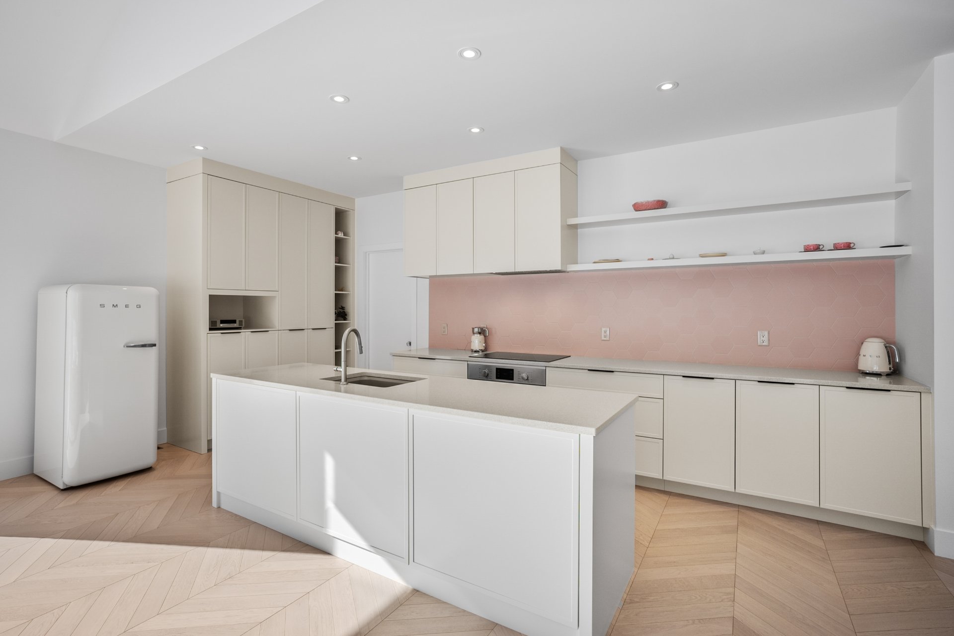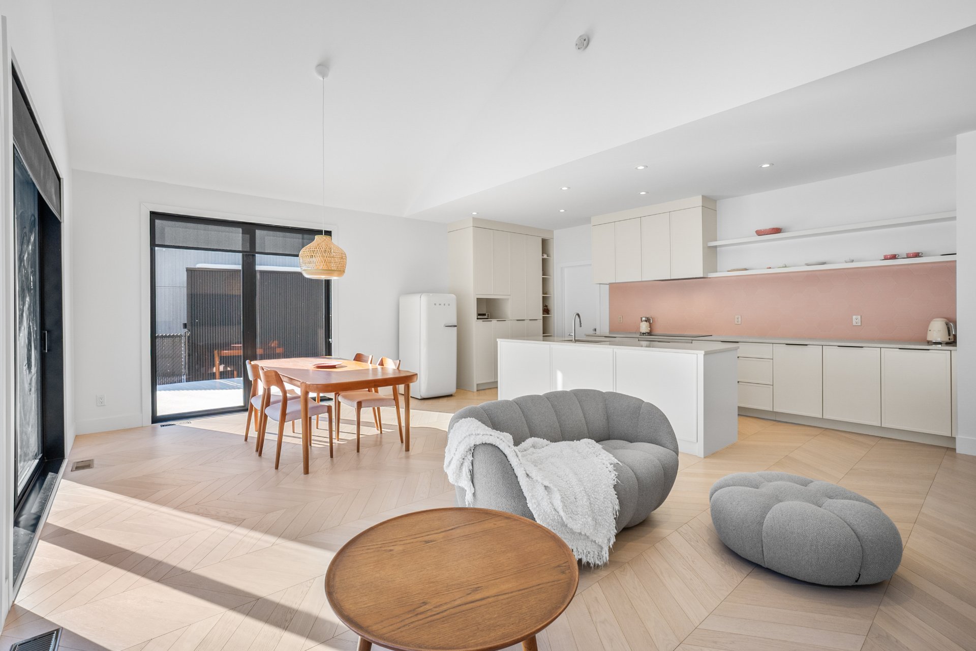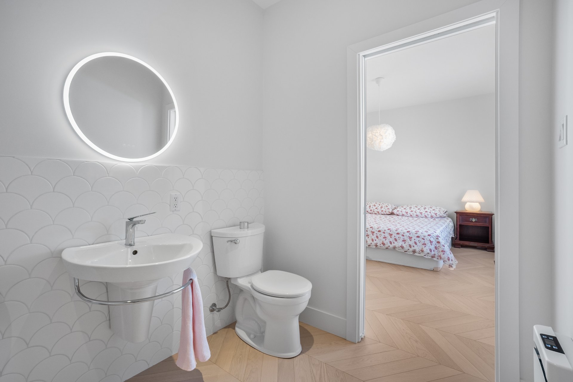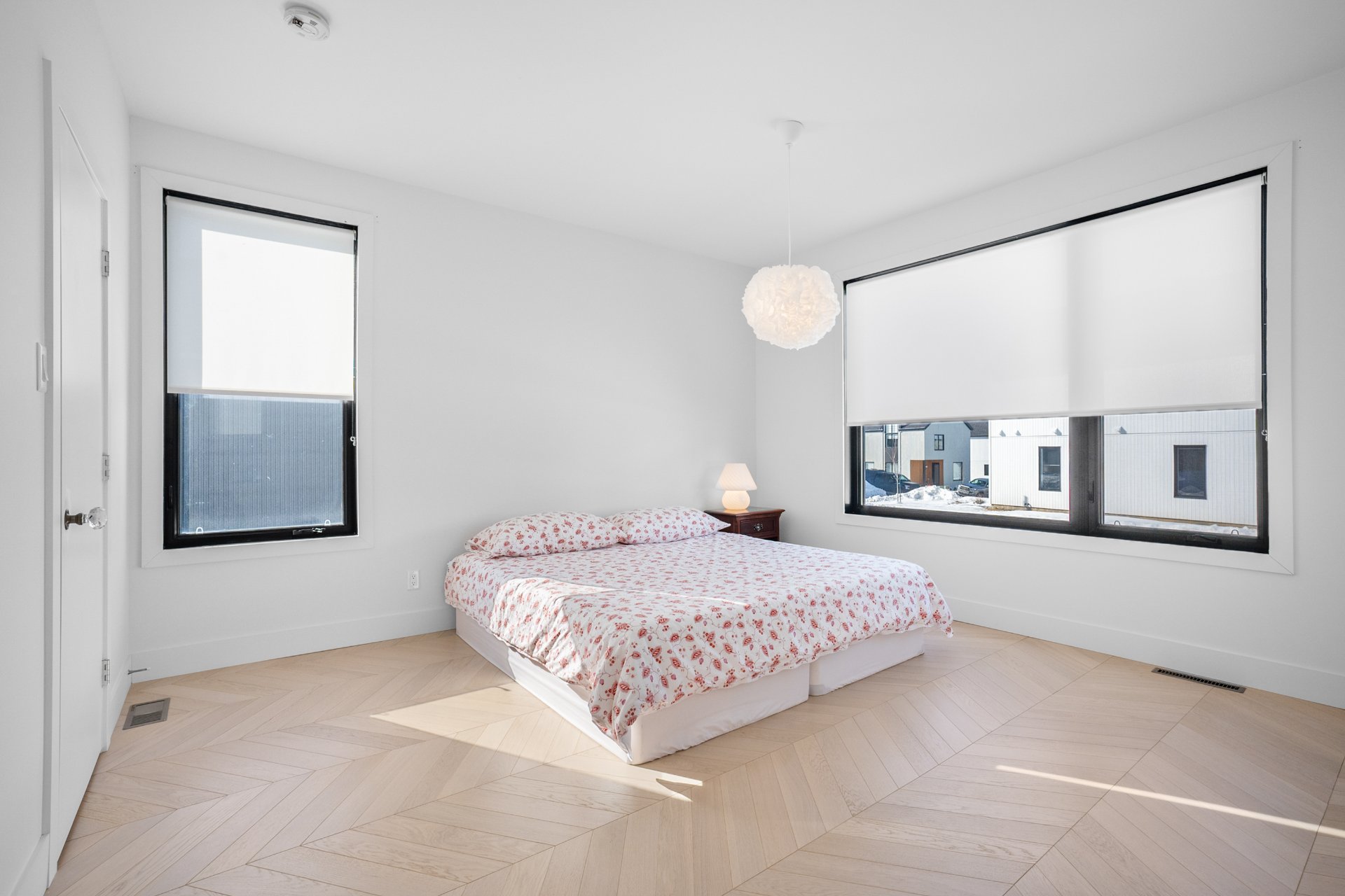 The master bedroom, located on the ground floor, features built-in closets and an elegant en-suite bathroom with a freestanding bathtub. The white oak herringbone flooring adds a touch of timeless refinement.