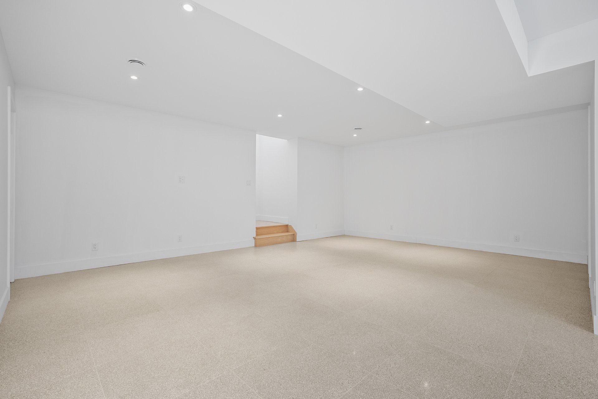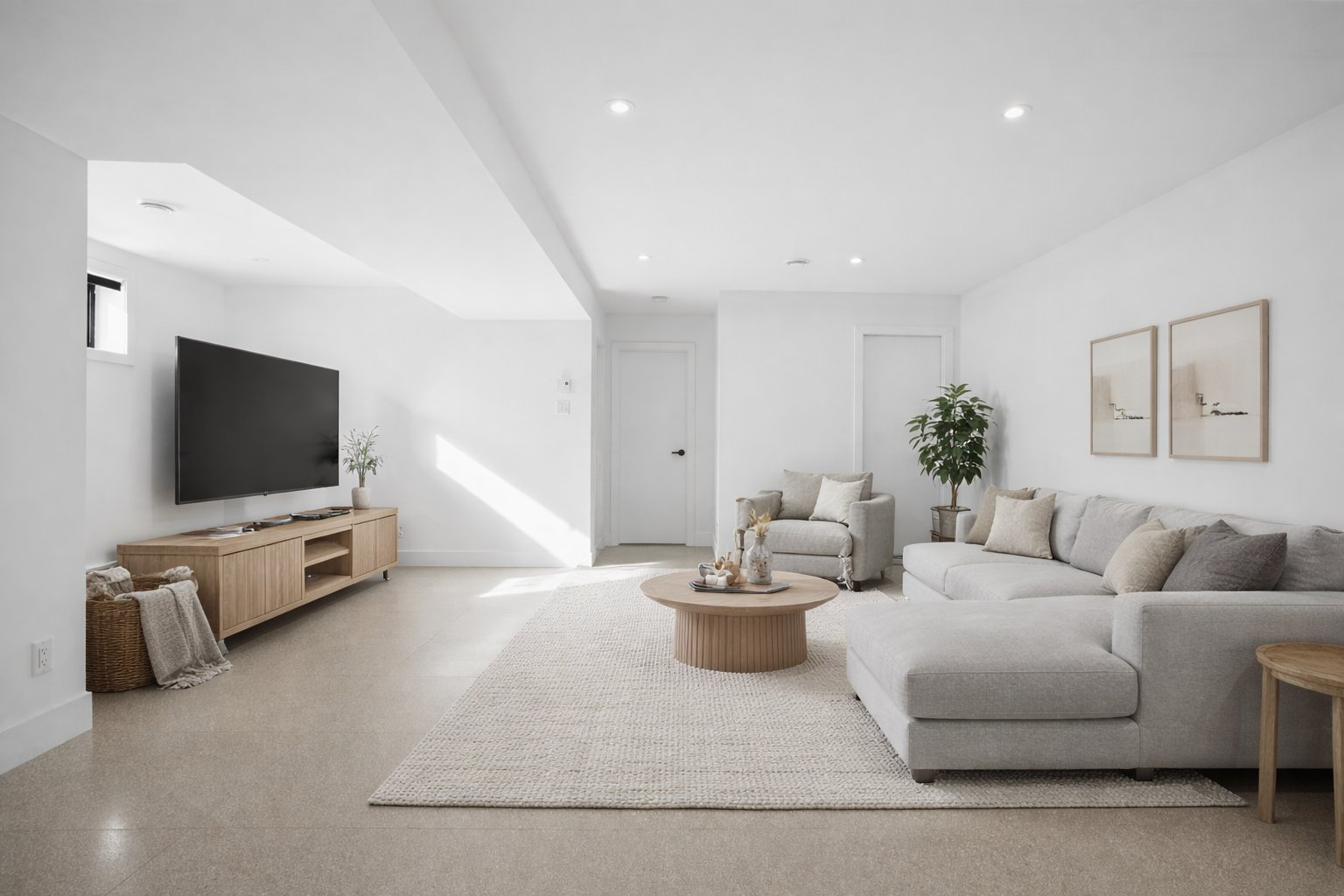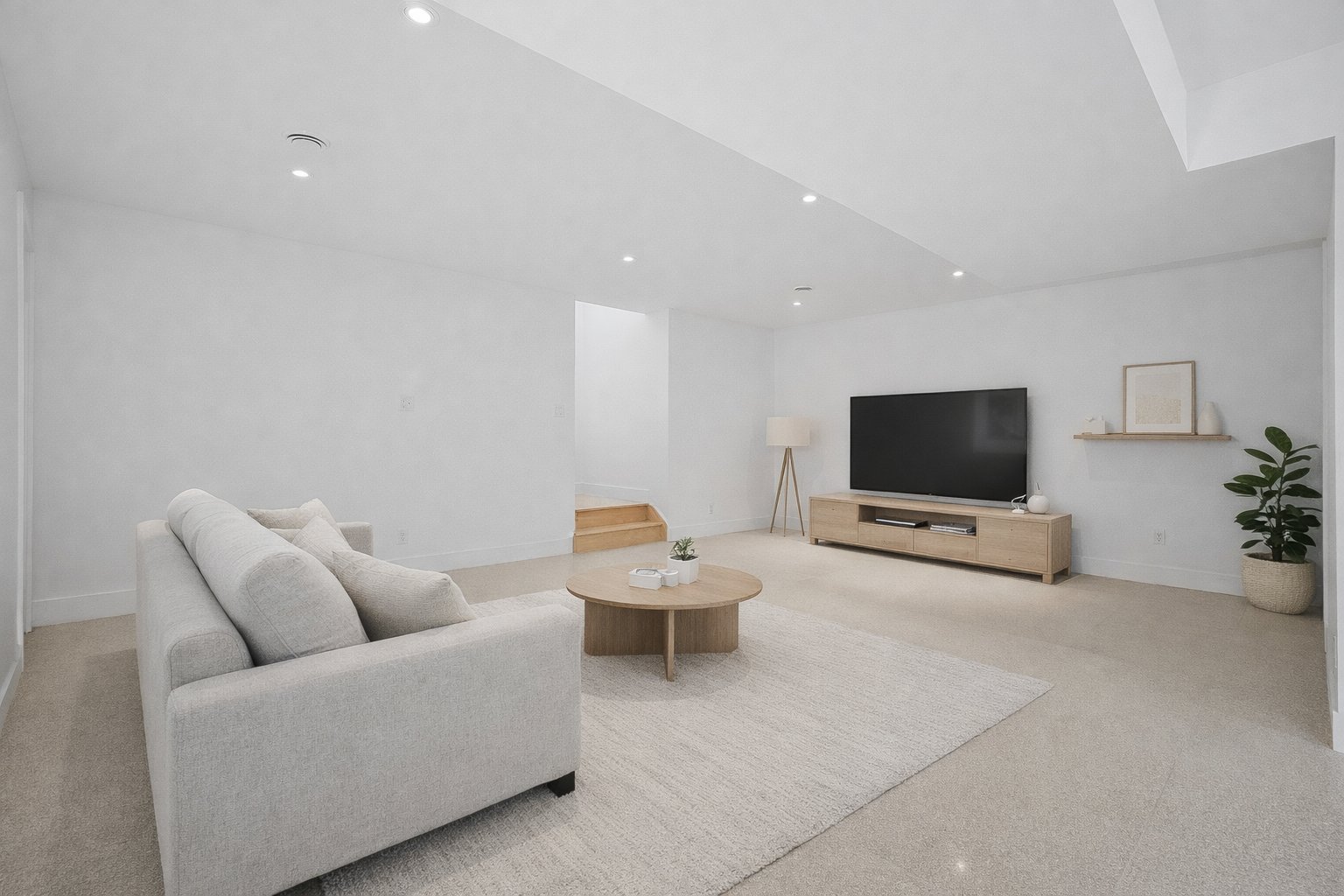 The family room in the basement was furnished using AI.