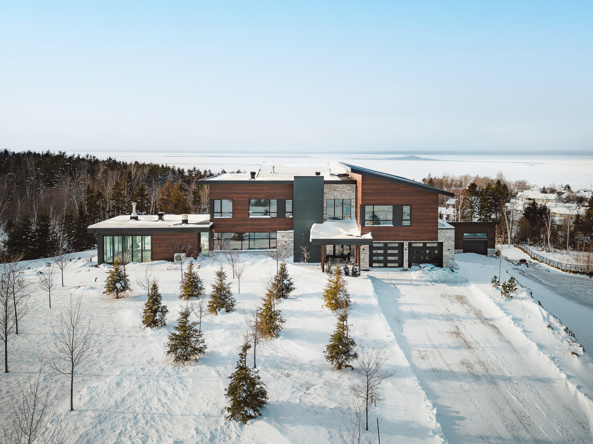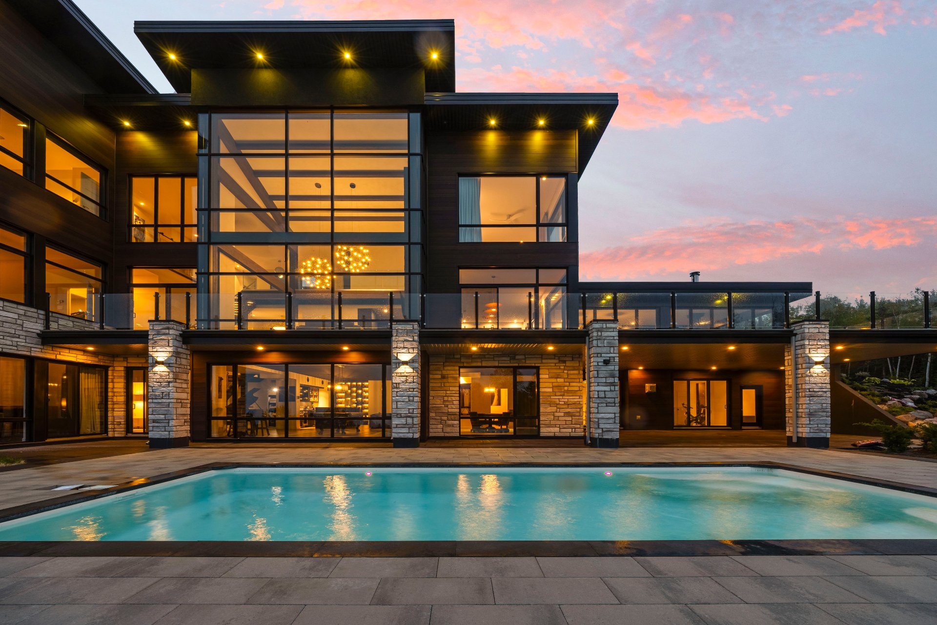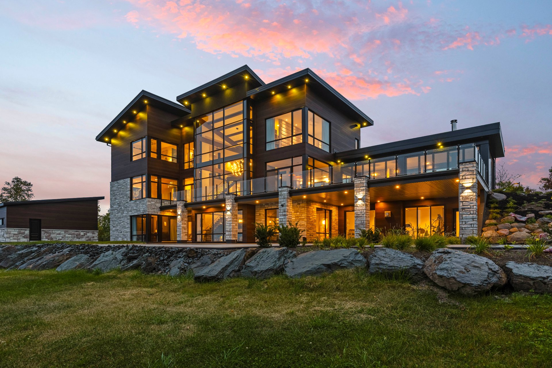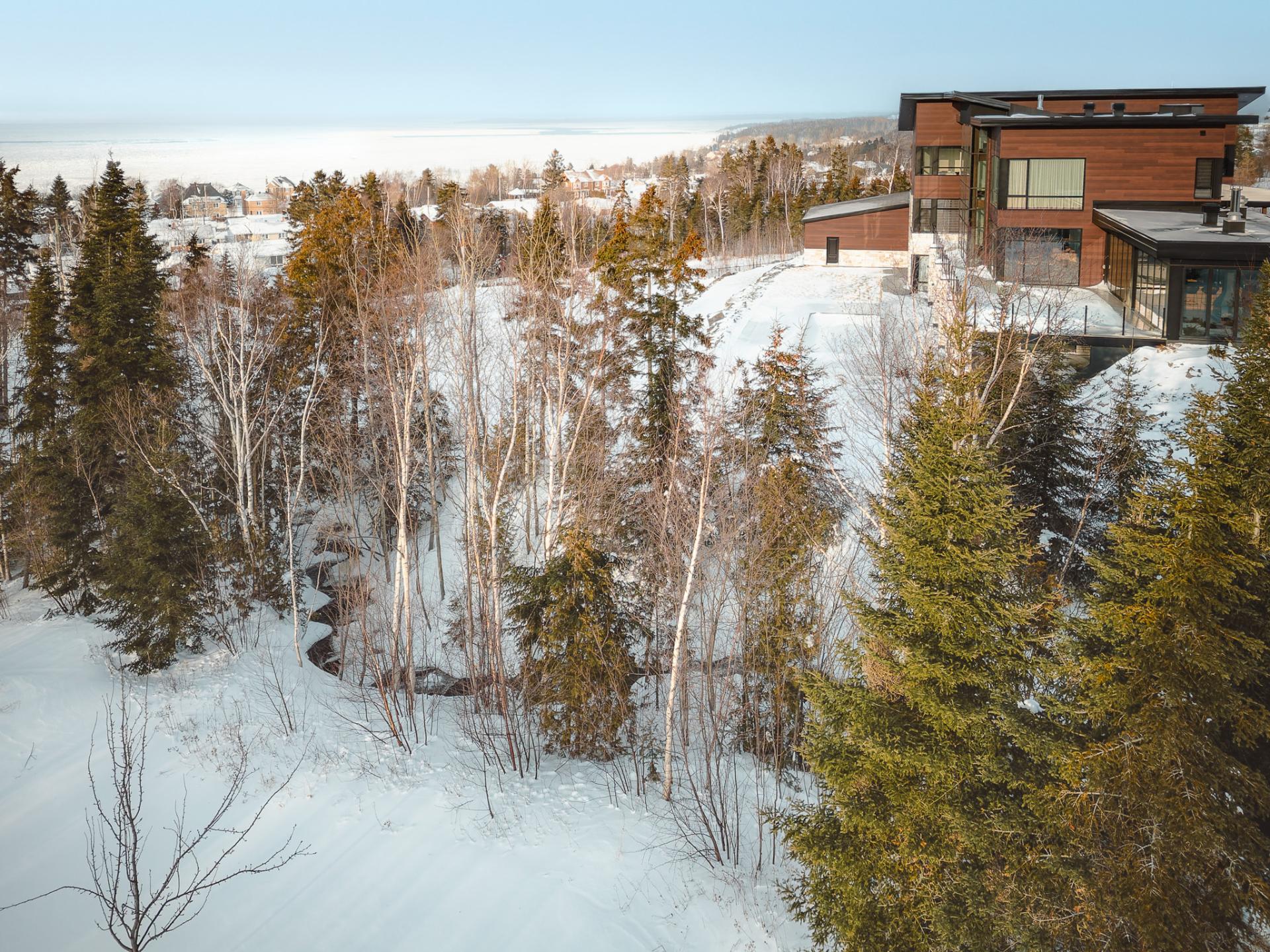 Nestled on an exceptional private site, this uniquely designed estate offers an unparalleled panorama of the St. Lawrence River. Featuring 20-foot ceilings, a central slate fireplace, an ultra-modern Gaggenau kitchen, Sonneman Constellation light fixtures, and a 4-season outdoor kitchen enclosed with removable Nanawall walls opening onto a terrace. The property includes 7 spacious bedrooms, 4 bathrooms, 2 powder rooms, a library, bar, cinema, gym, sauna, and full home automation. The 1,540,000-square-foot grounds are fully landscaped and feature a natural waterfall, 1 km walking trails, a swimming pool, irrigation system and fruit trees.