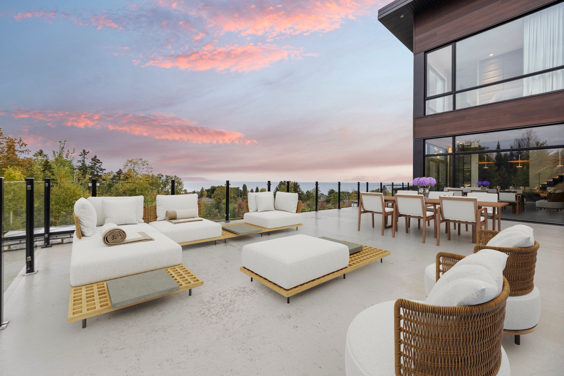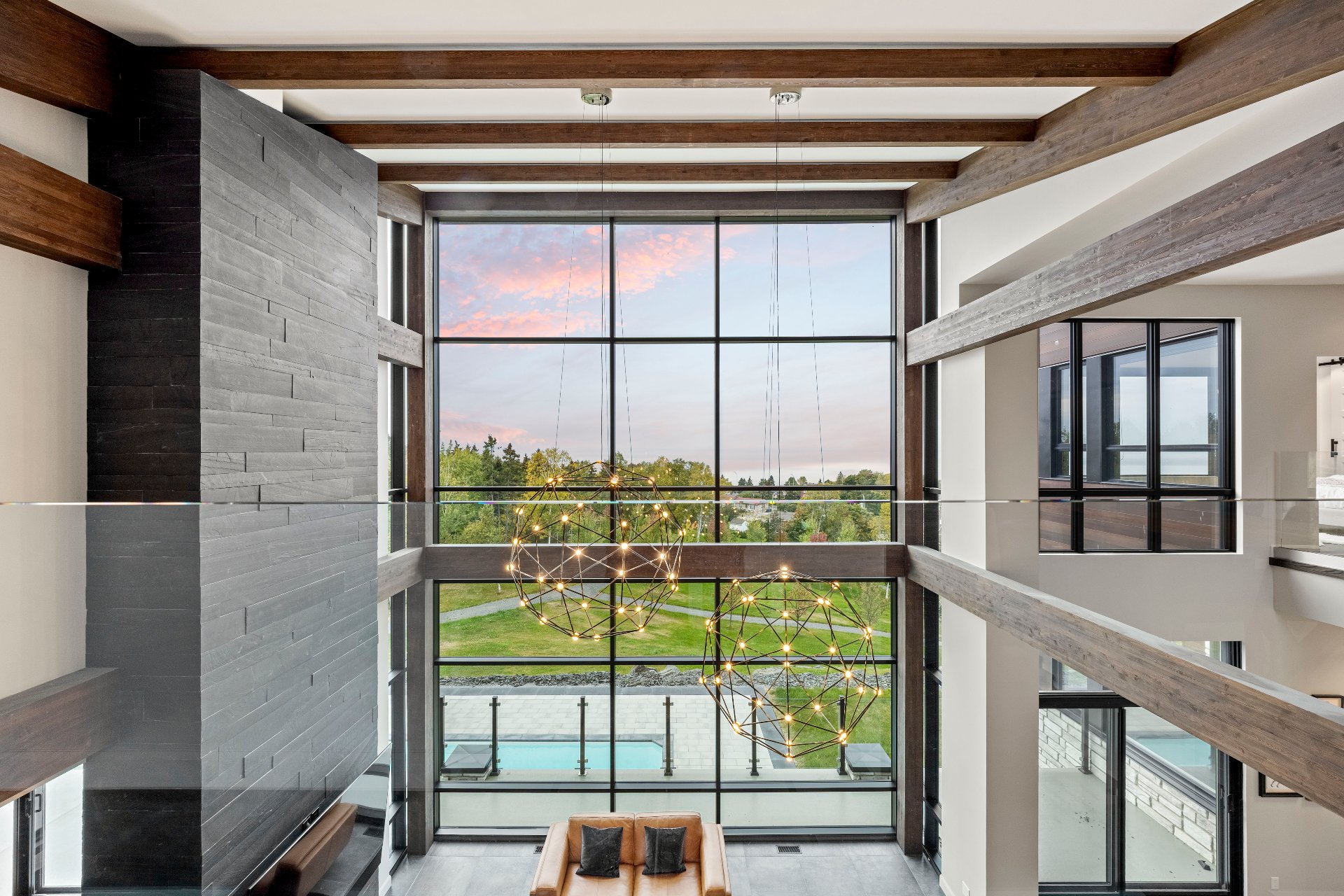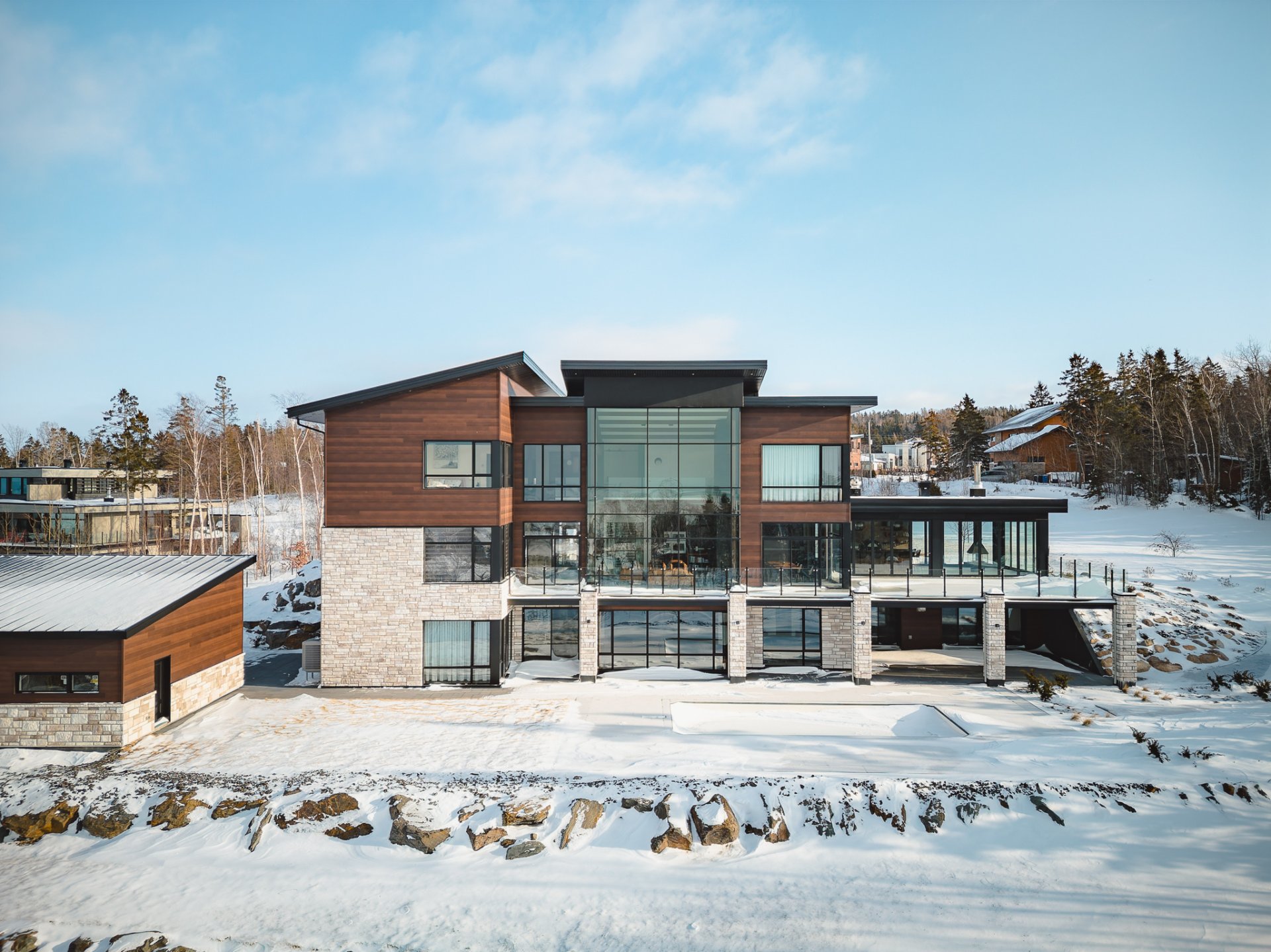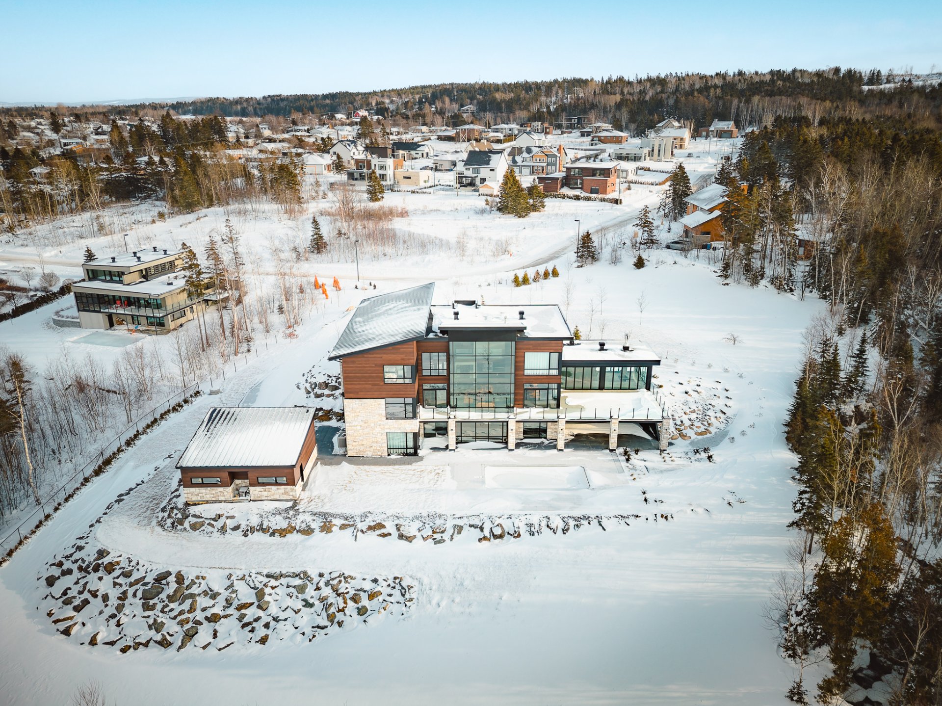 Nestled on an exceptional private site, this uniquely designed estate offers an unparalleled panorama of the St. Lawrence River. Featuring 20-foot ceilings, a central slate fireplace, an ultra-modern Gaggenau kitchen, Sonneman Constellation light fixtures, and a 4-season outdoor kitchen enclosed with removable Nanawall walls opening onto a terrace. The property includes 7 spacious bedrooms, 4 bathrooms, 2 powder rooms, a library, bar, cinema, gym, sauna, and full home automation. The 1,540,000-square-foot grounds are fully landscaped and feature a natural waterfall, 1 km walking trails, a swimming pool, irrigation system and fruit trees.
