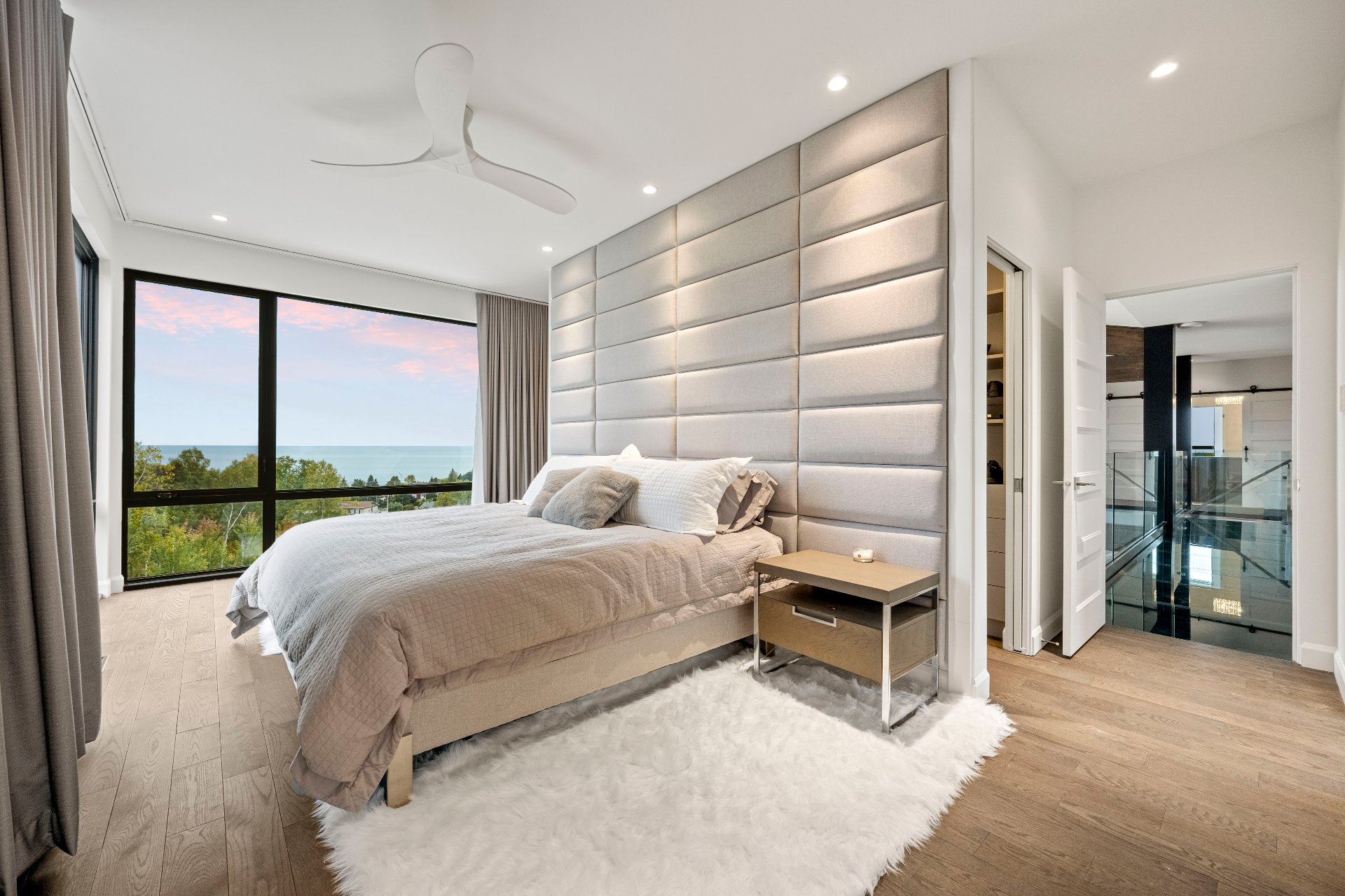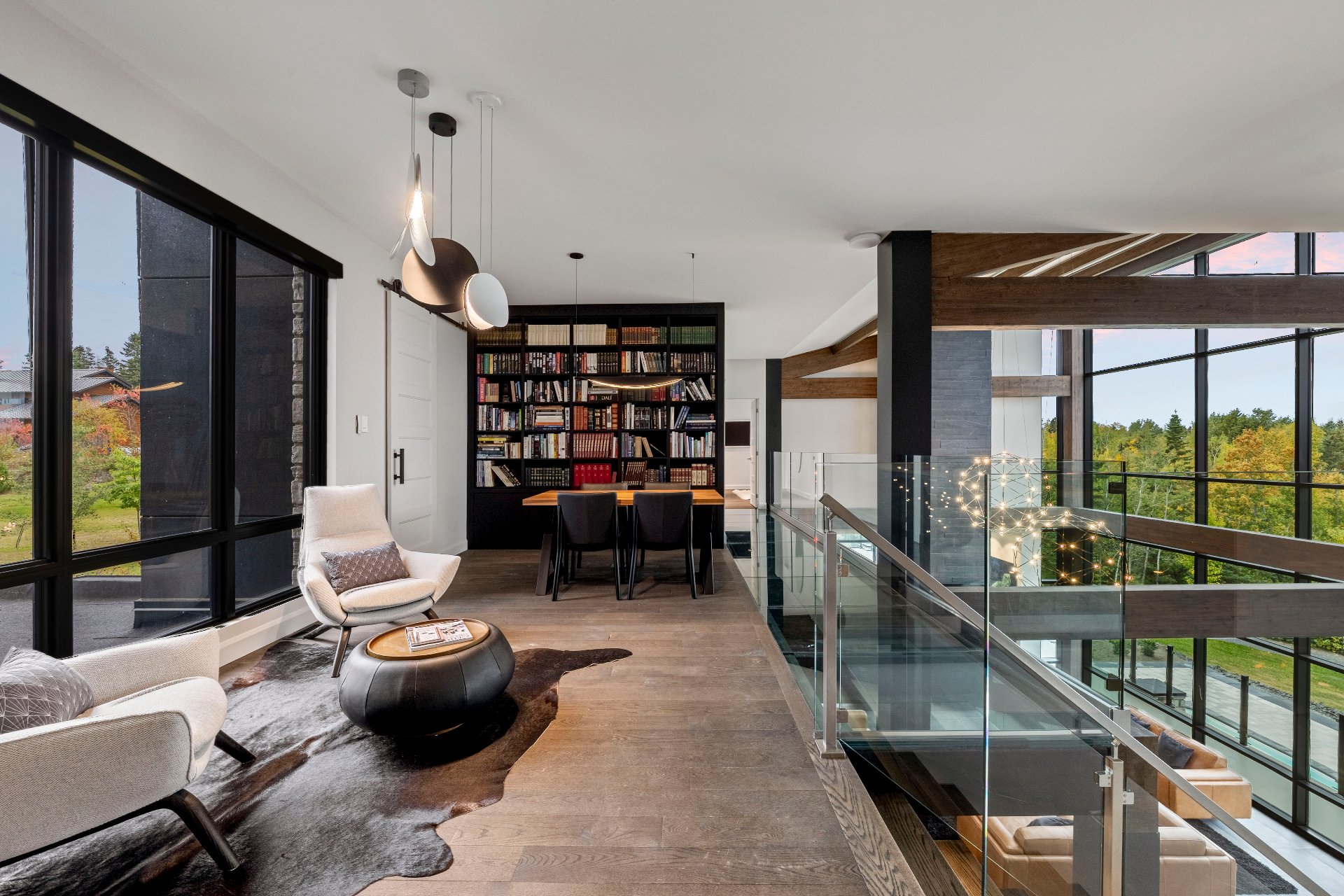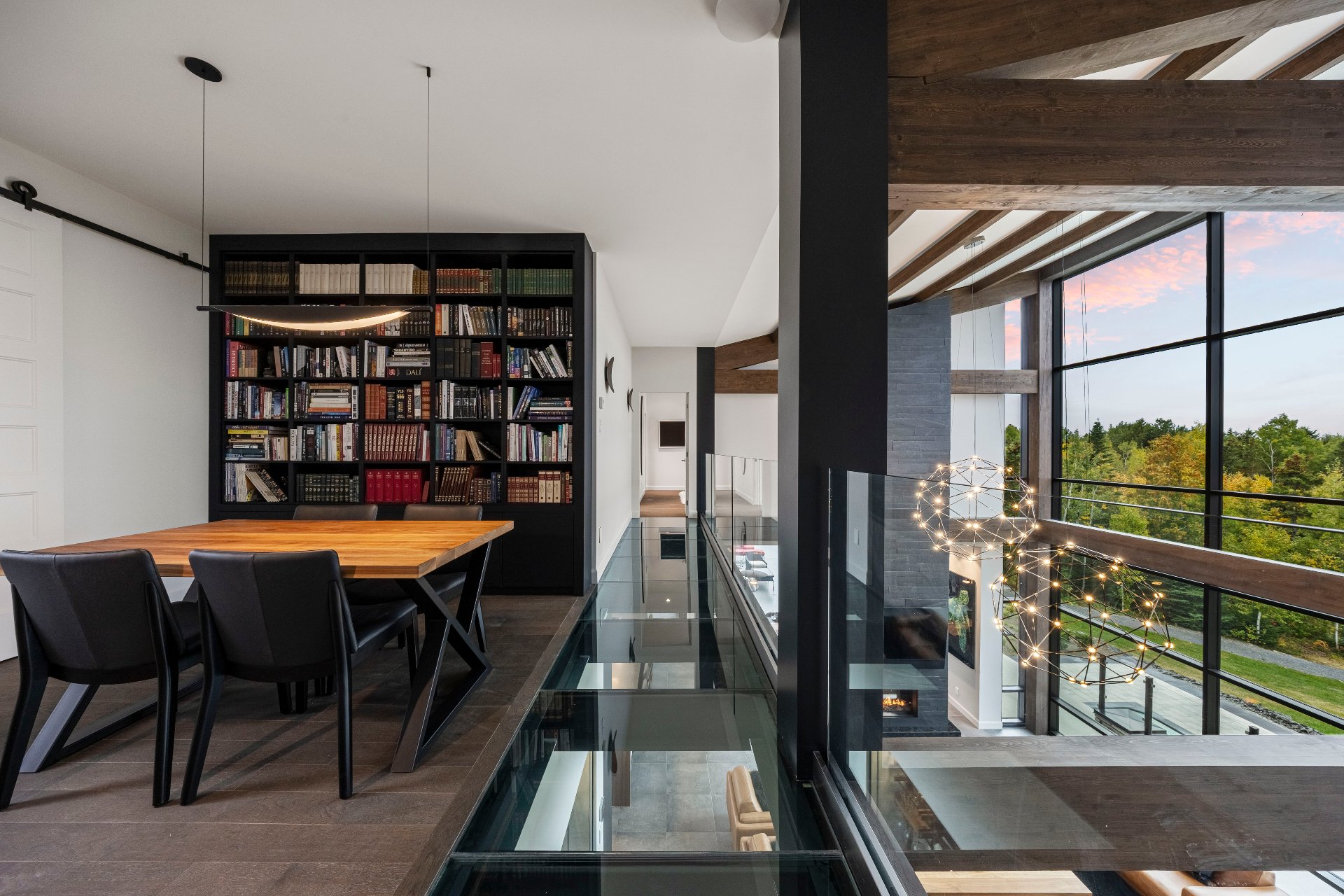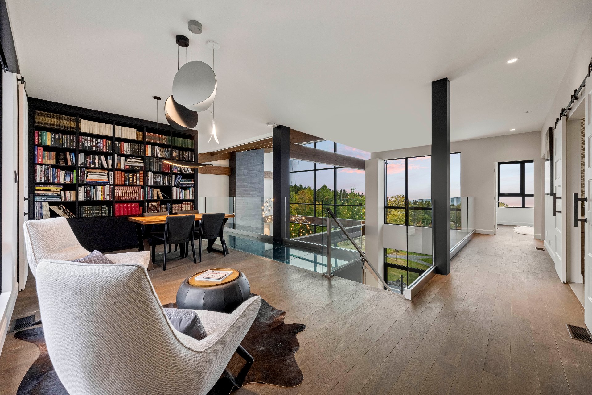 -A reading nook with a library leads, via a glass floor, to the primary bedroom with panoramic views, an ensuite bathroom, and two walk-in closets.