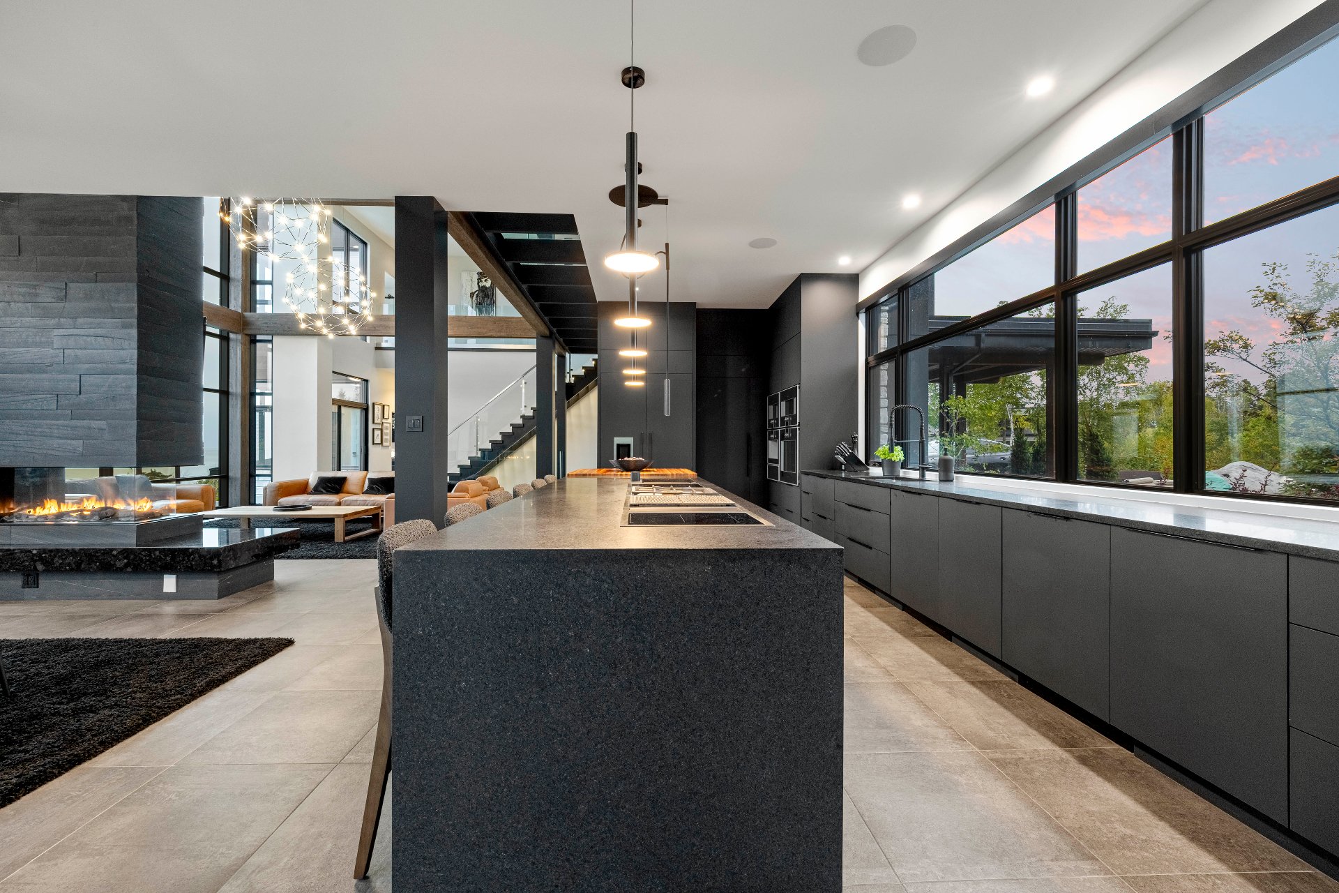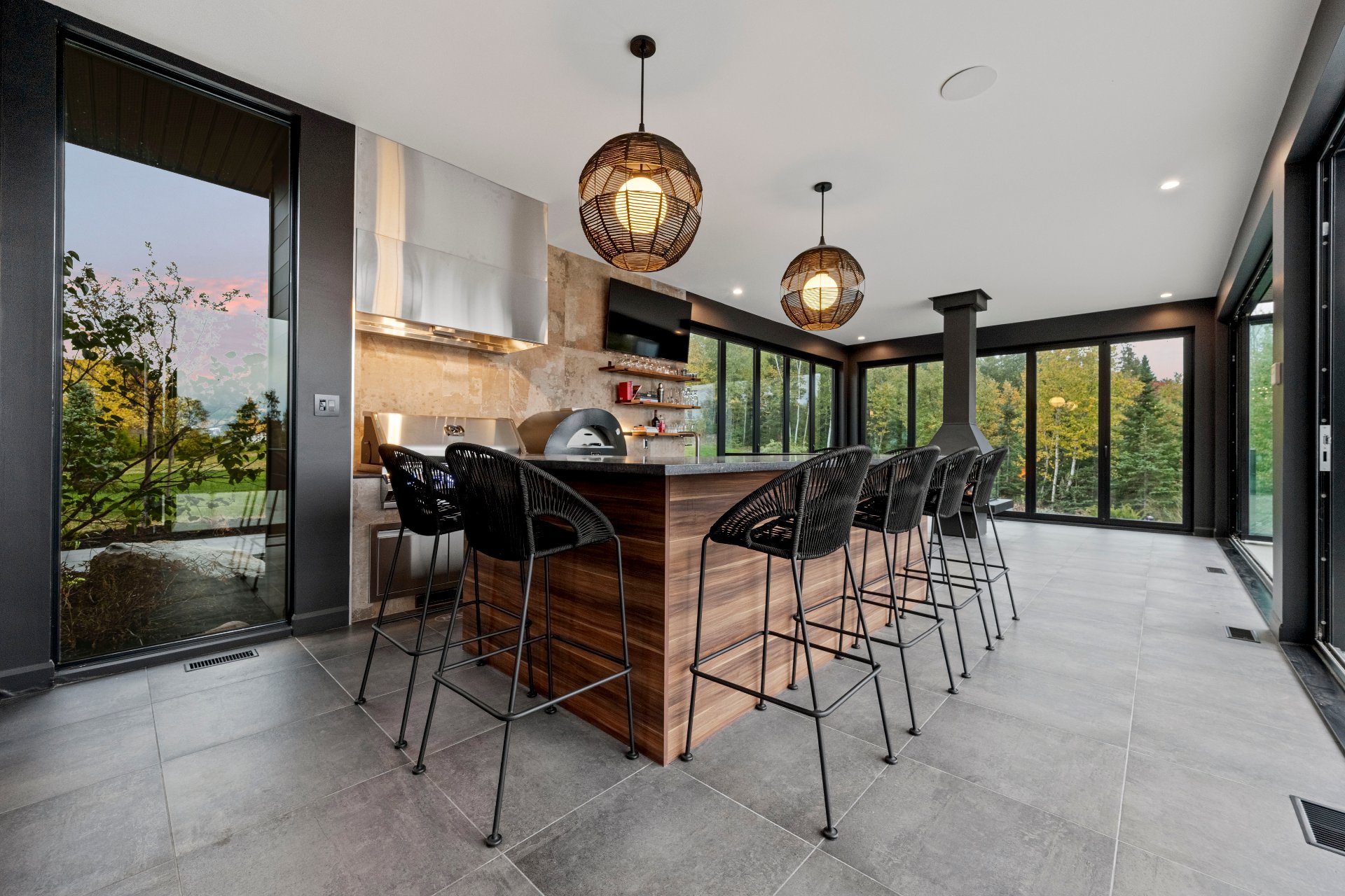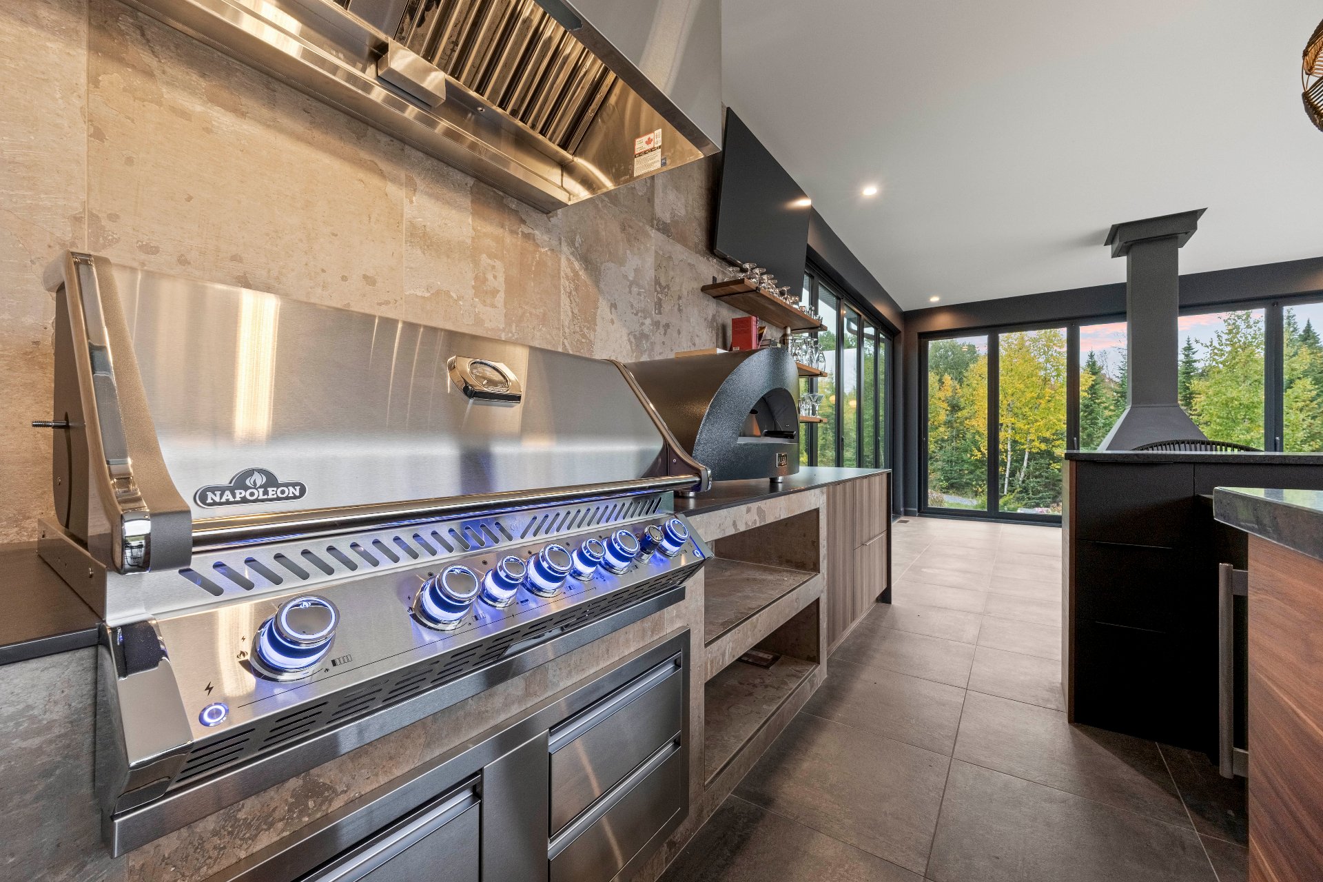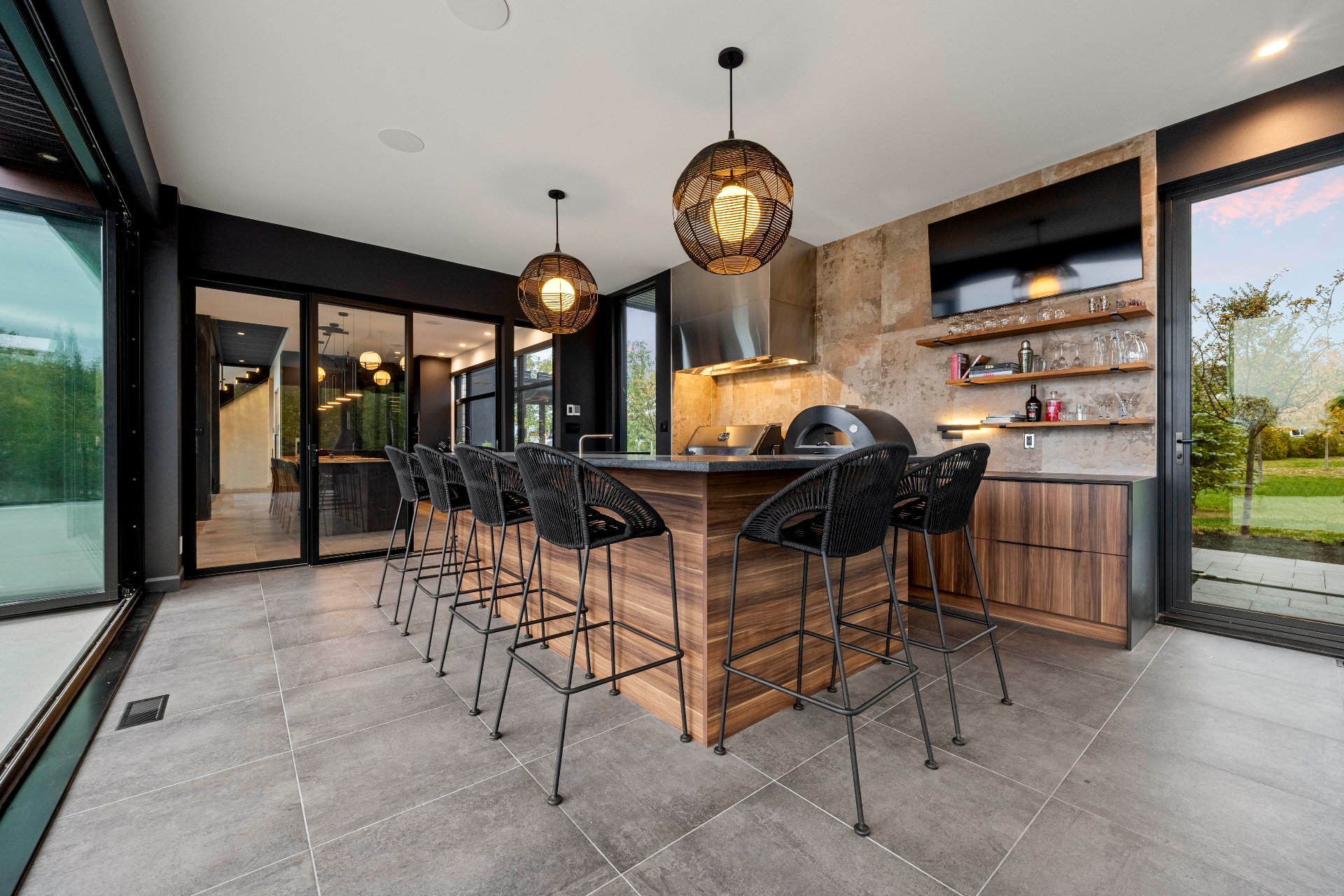 -The outdoor kitchen includes a built-in BBQ, wood-fired pizza oven, Dekton countertops, a granite island, a four-sided fireplace, and removable glass walls opening onto a 700 sq. ft. terrace.