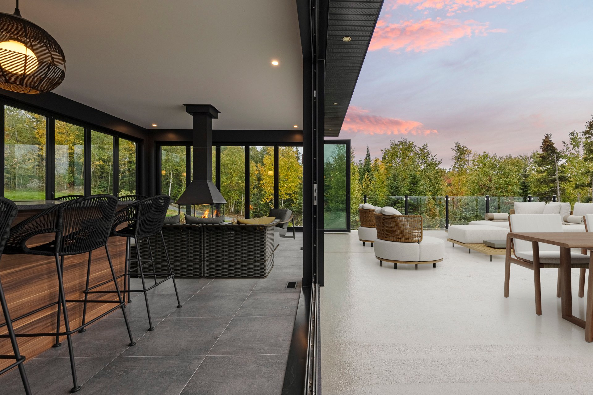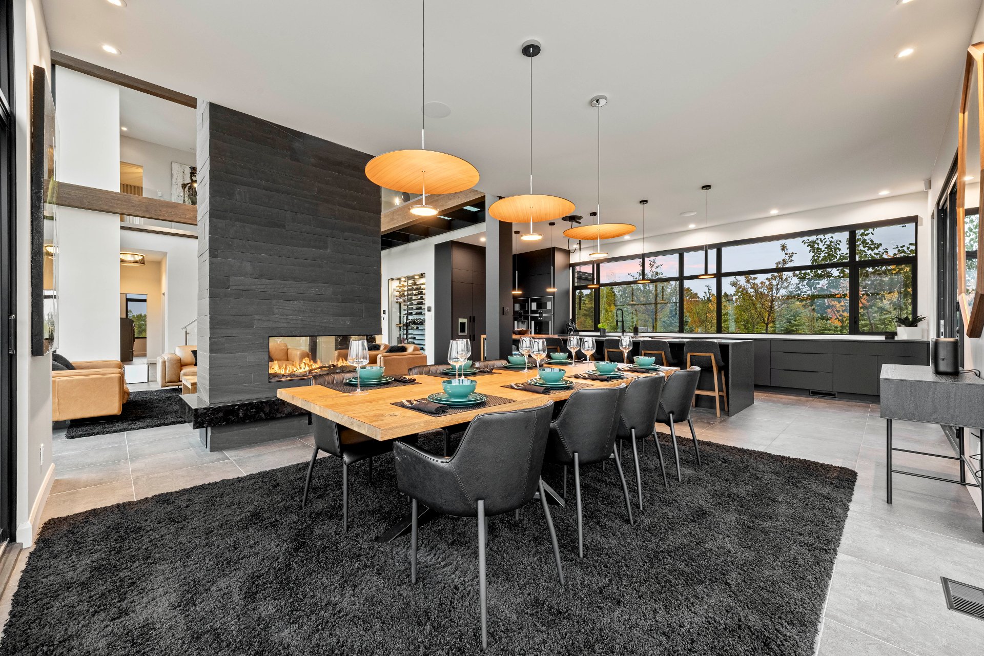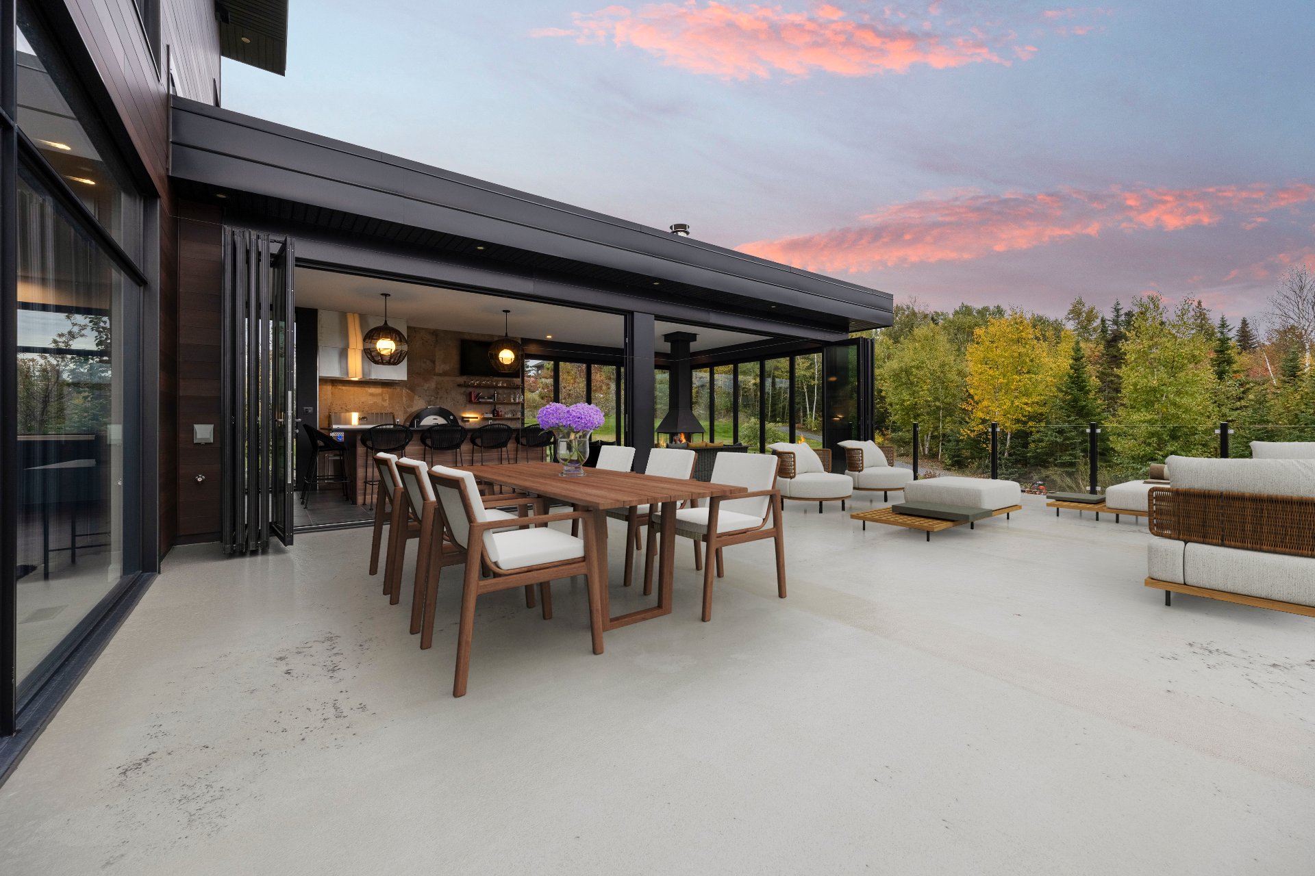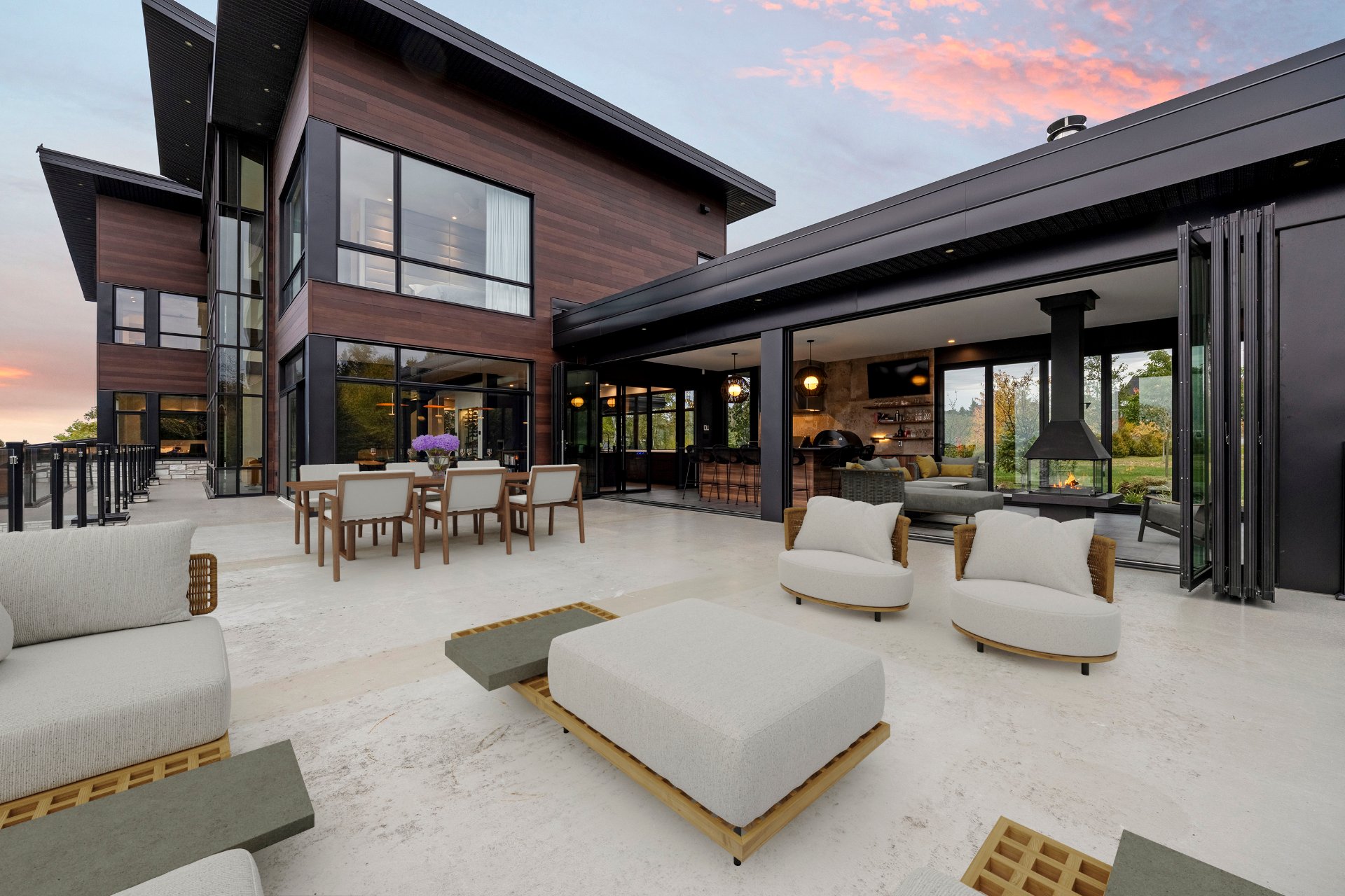-The outdoor kitchen includes a built-in BBQ, wood-fired pizza oven, Dekton countertops, a granite island, a four-sided fireplace, and removable glass walls opening onto a 700 sq. ft. terrace.