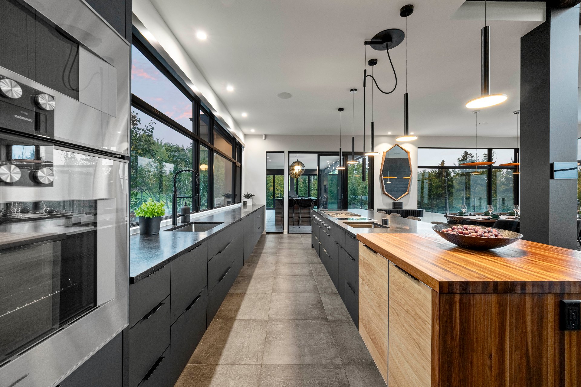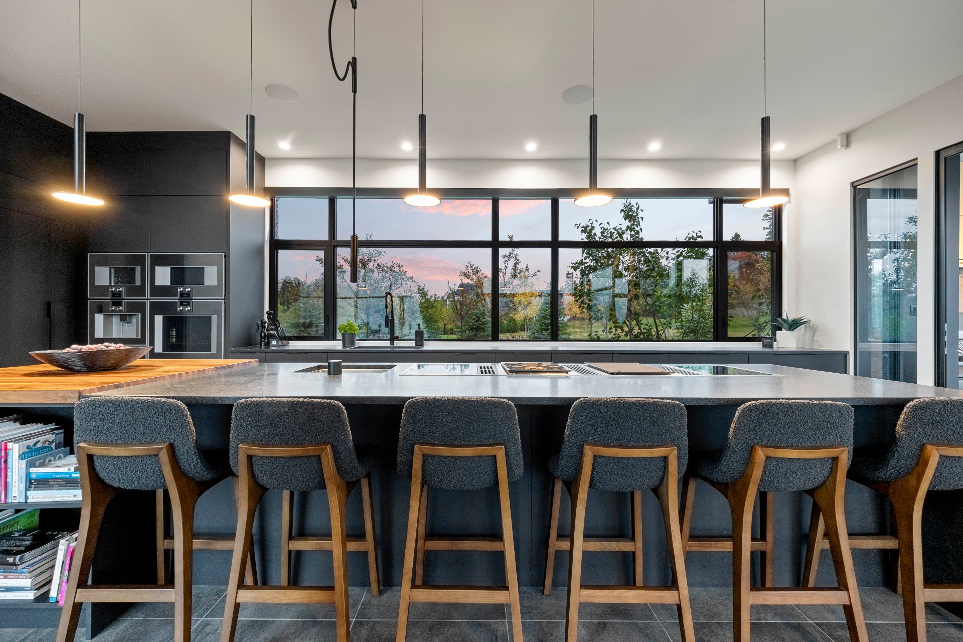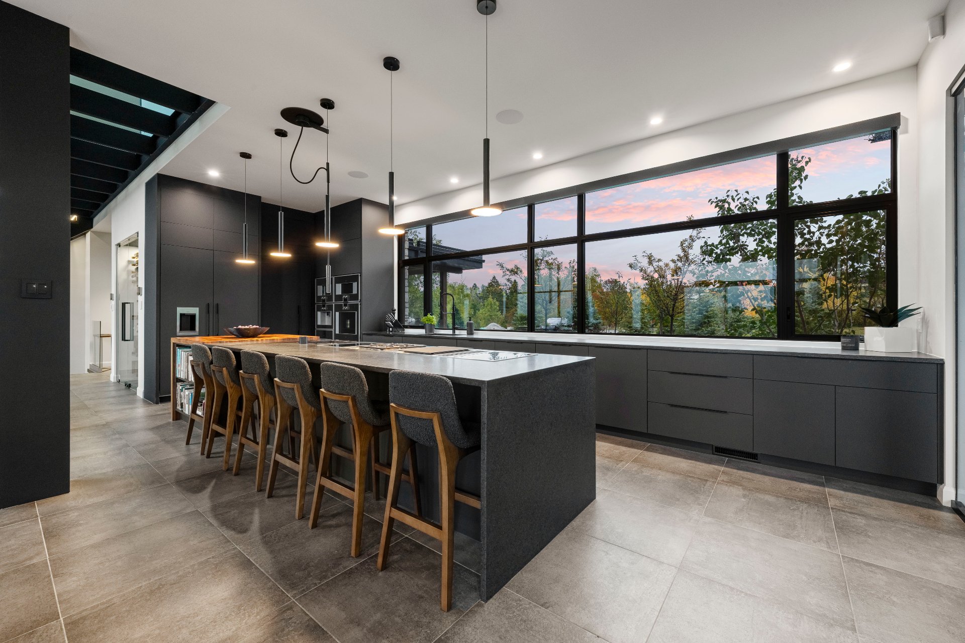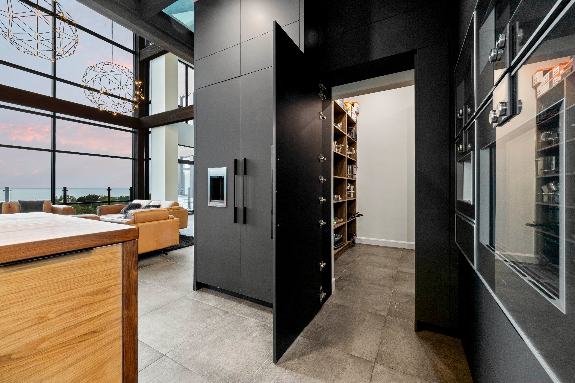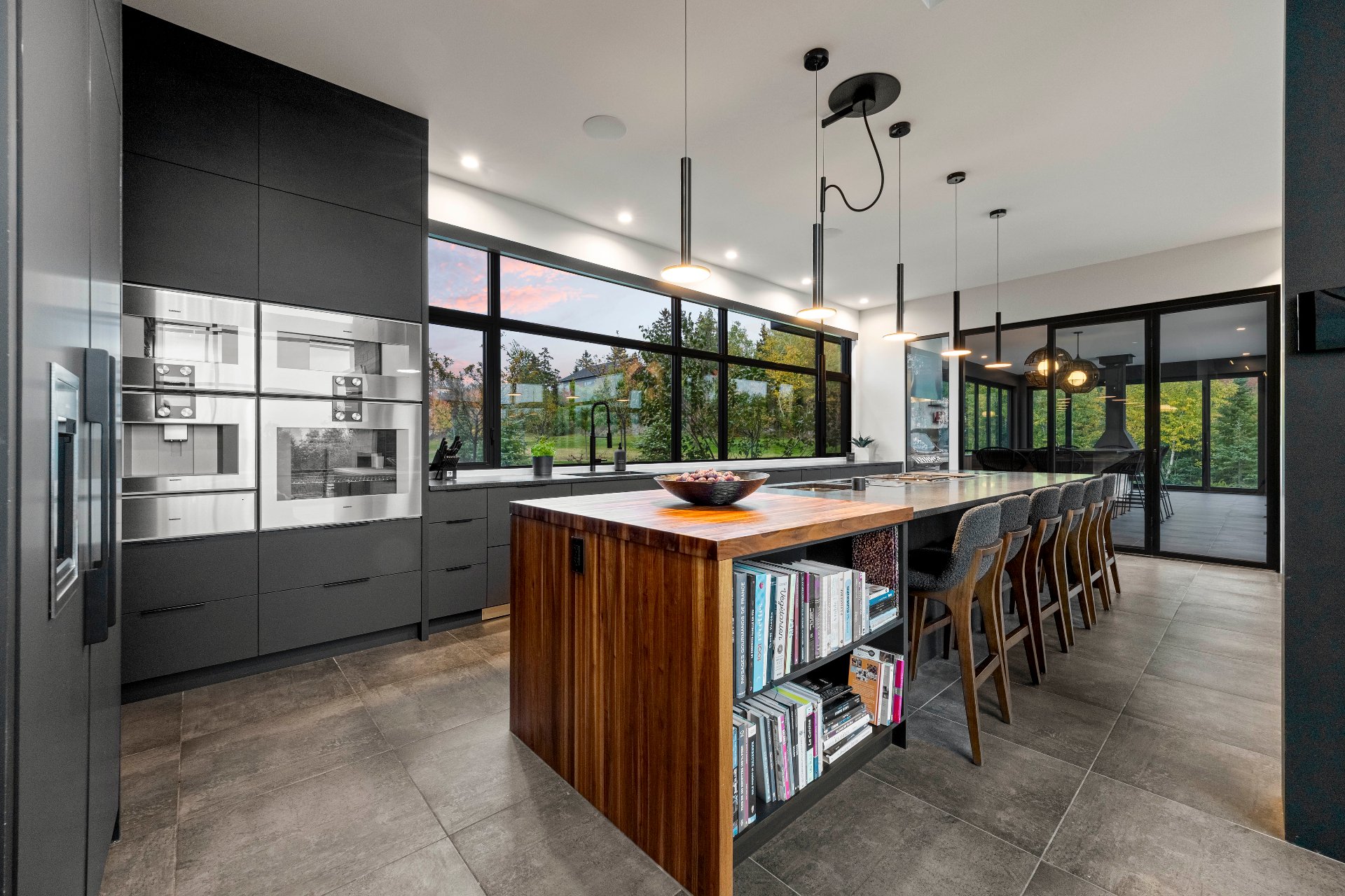 -The outdoor kitchen includes a built-in BBQ, wood-fired pizza oven, Dekton countertops, a granite island, a four-sided fireplace, and removable glass walls opening onto a 700 sq. ft. terrace.