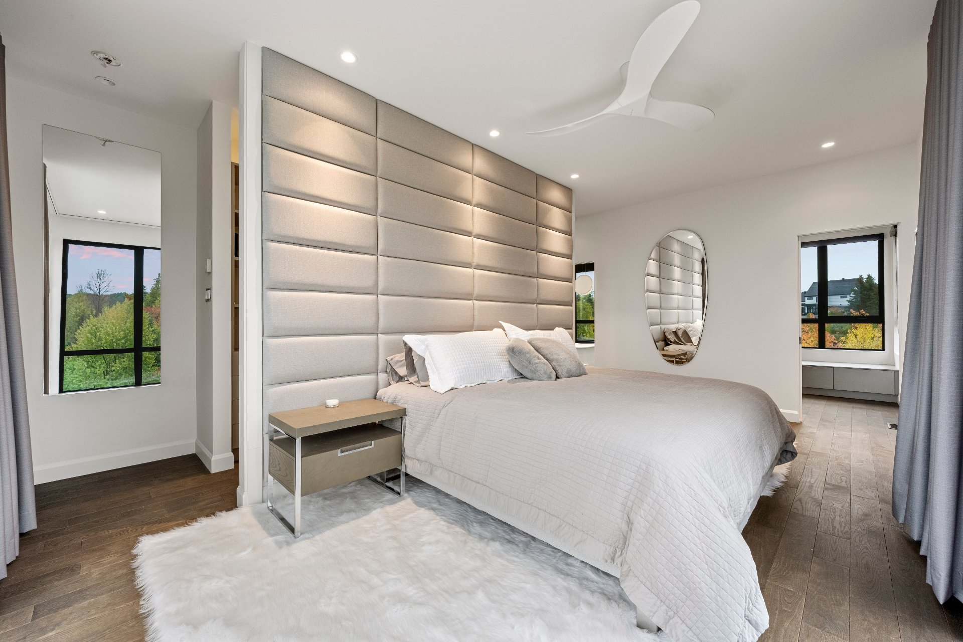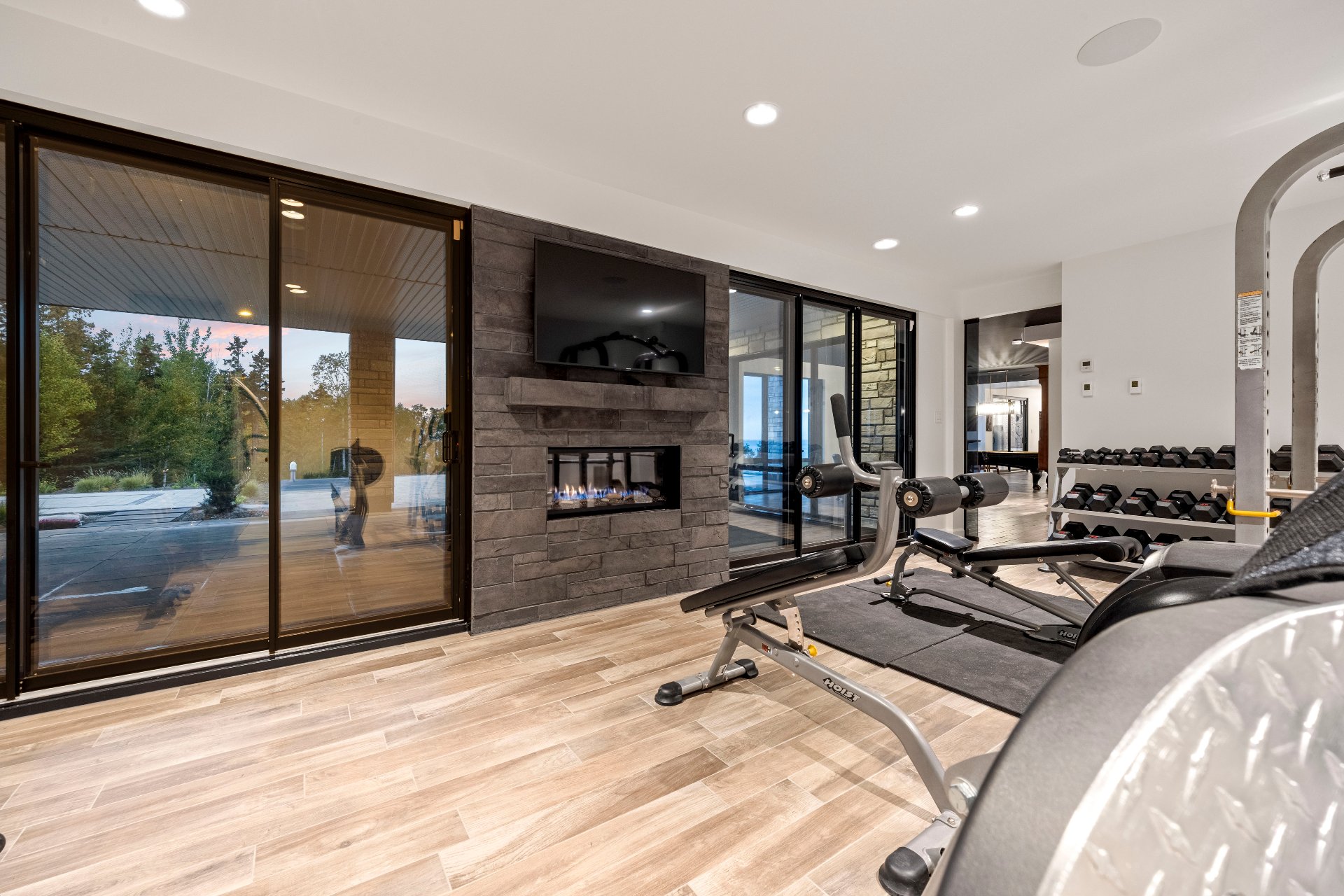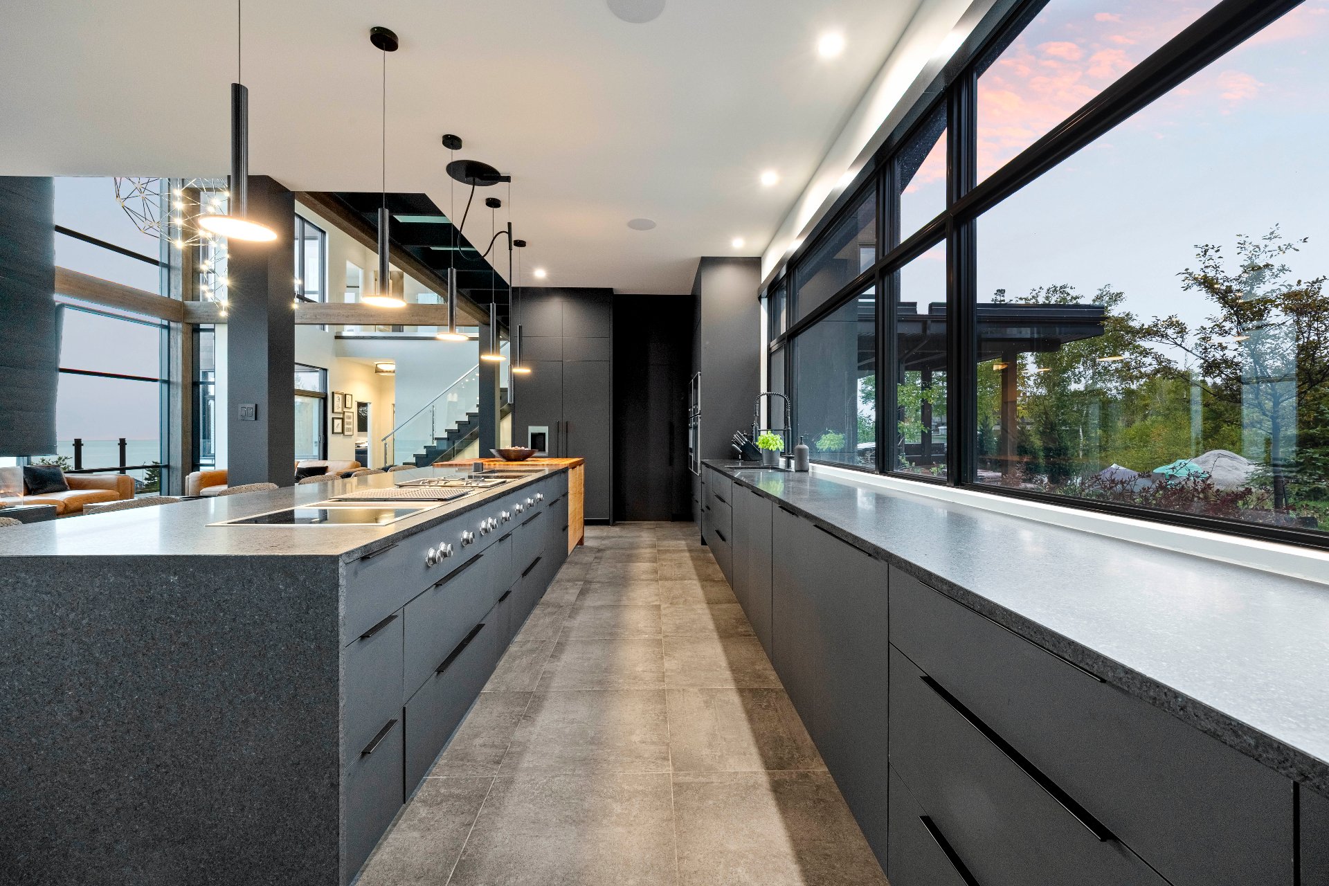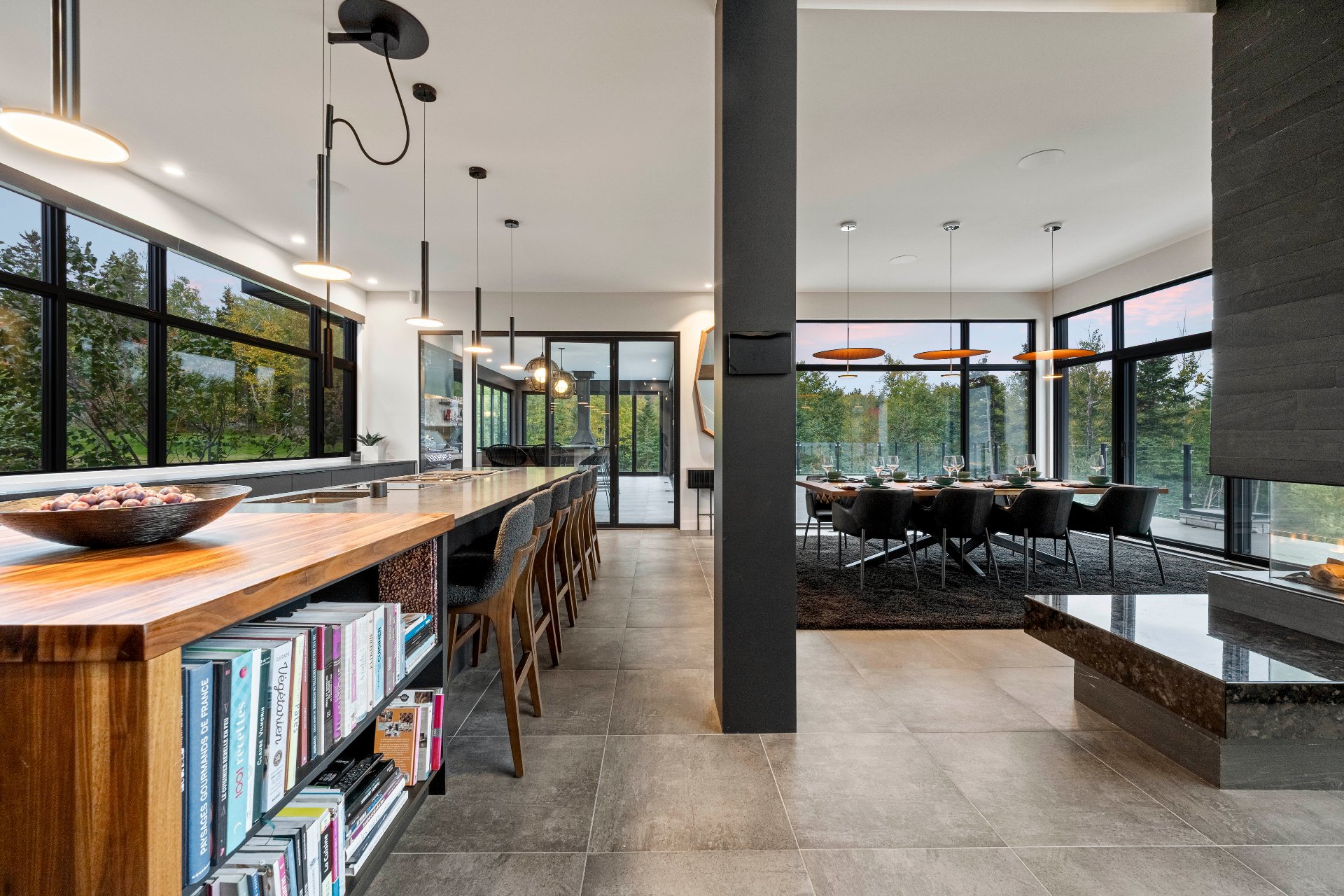 -The outdoor kitchen includes a built-in BBQ, wood-fired pizza oven, Dekton countertops, a granite island, a four-sided fireplace, and removable glass walls opening onto a 700 sq. ft. terrace.