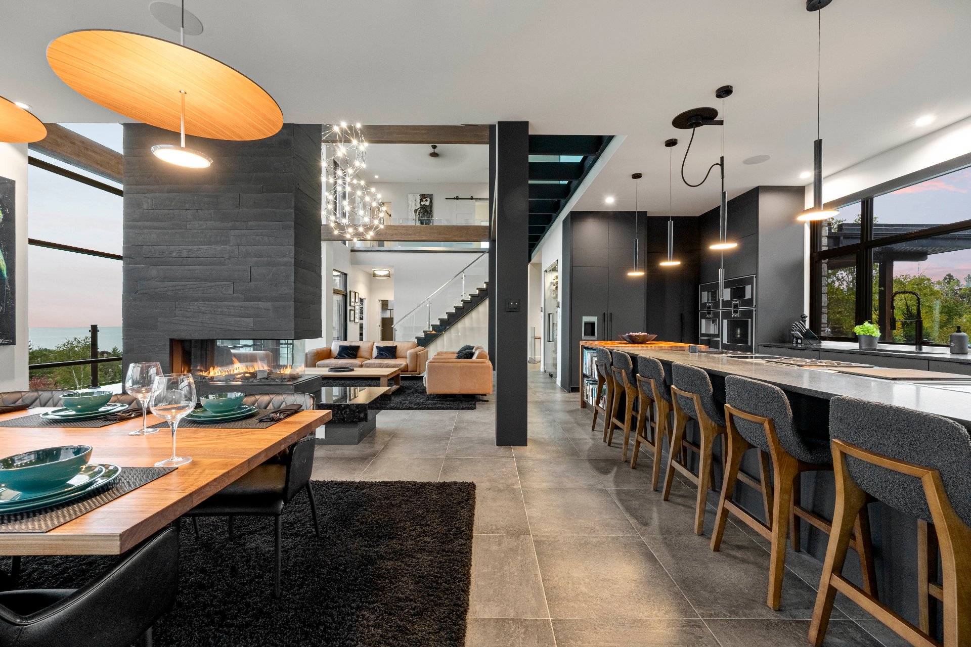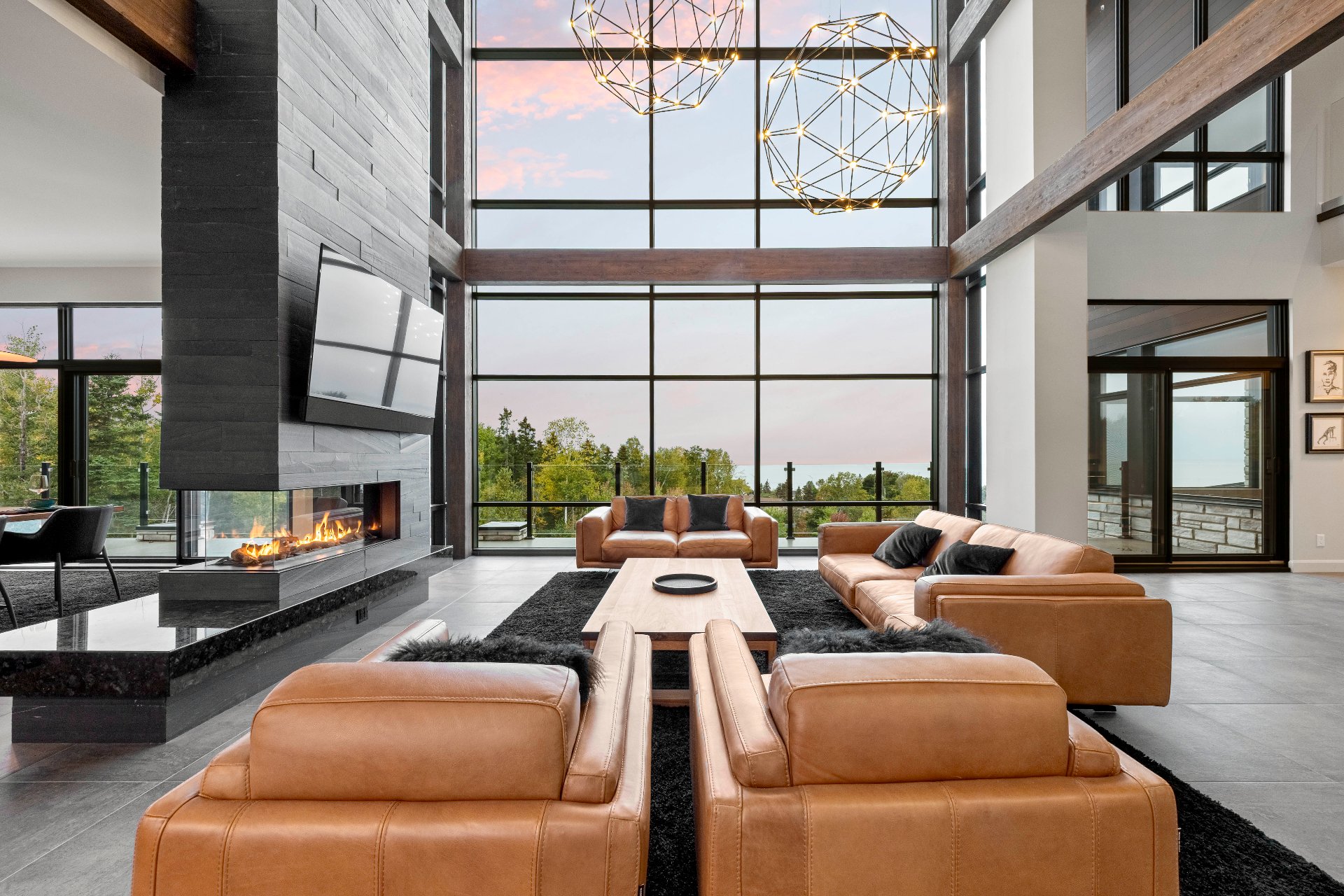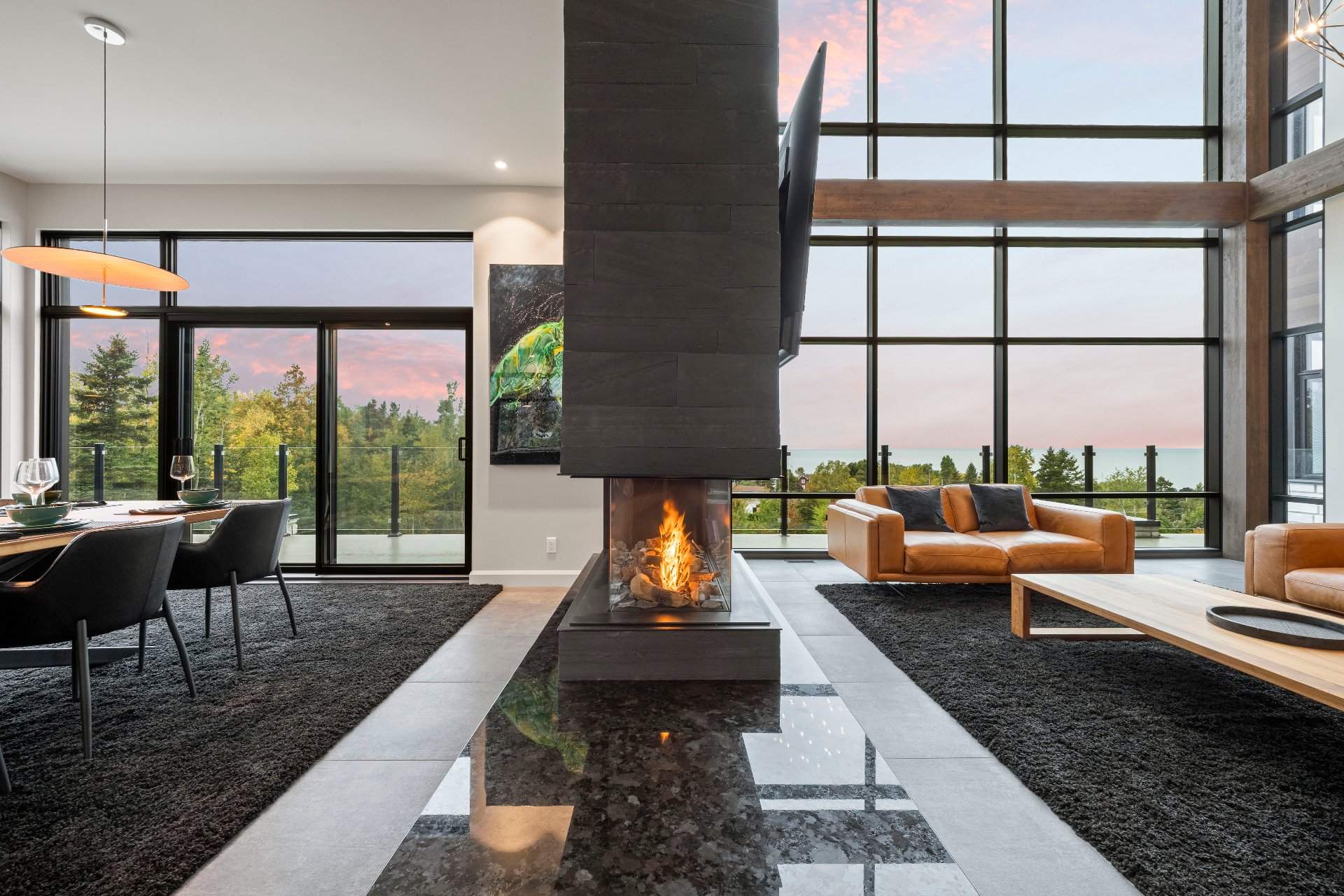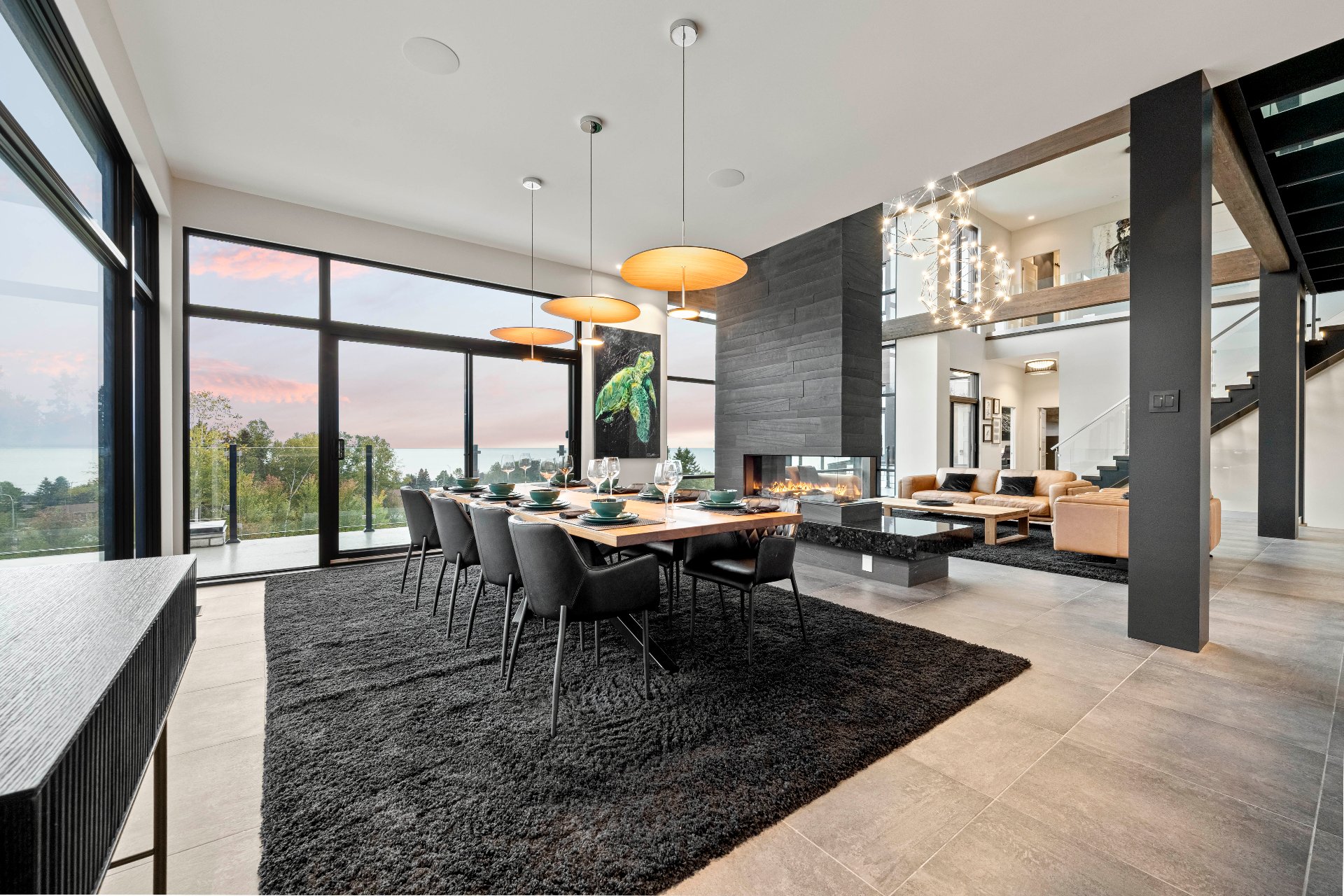 -From the moment you enter, 20-foot glass walls offer breathtaking views of the river, living room, and dining area, all enjoying daily sunsets. Exposed beams, a panoramic fireplace, Sonneman chandeliers, and a wine cellar complete the space.