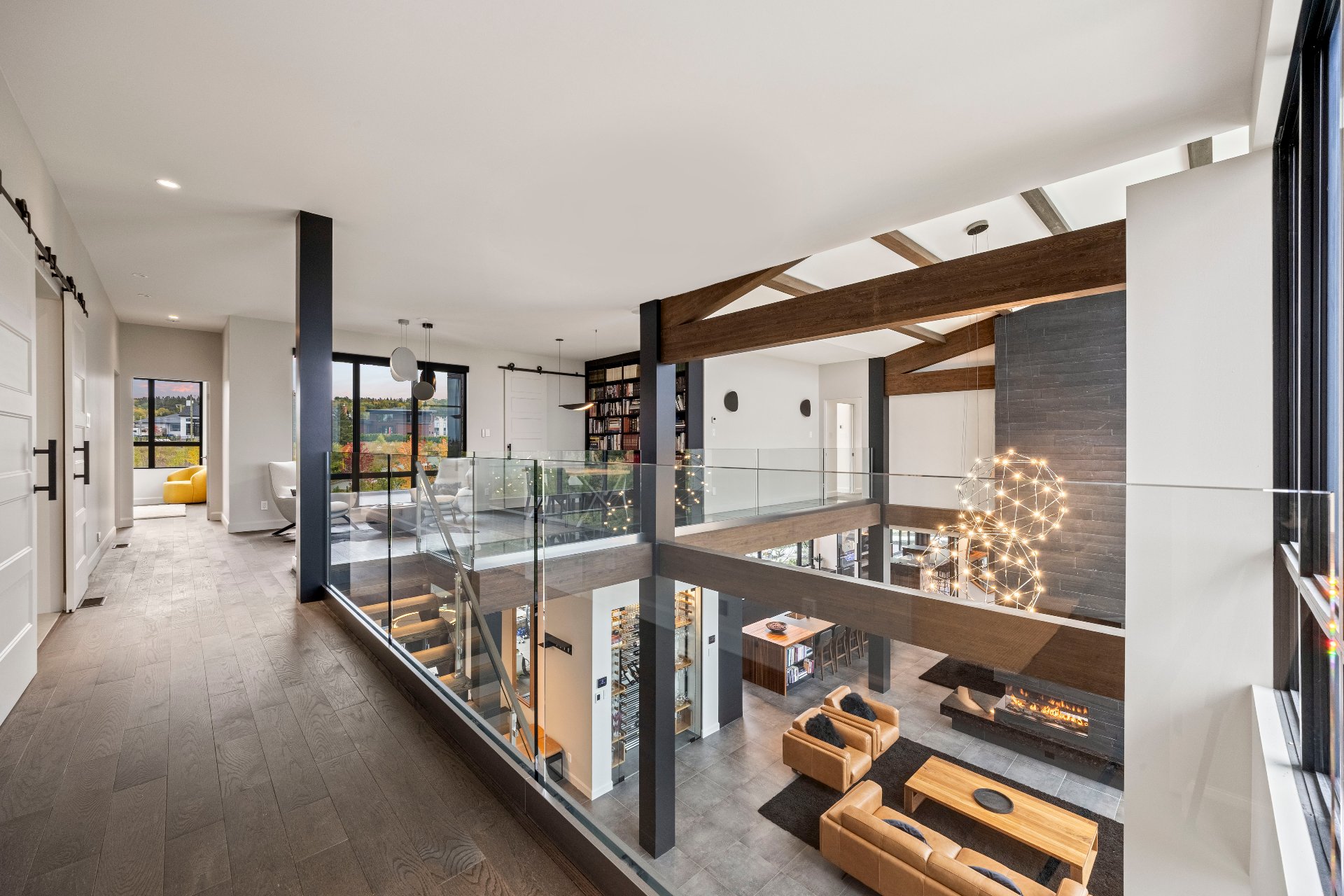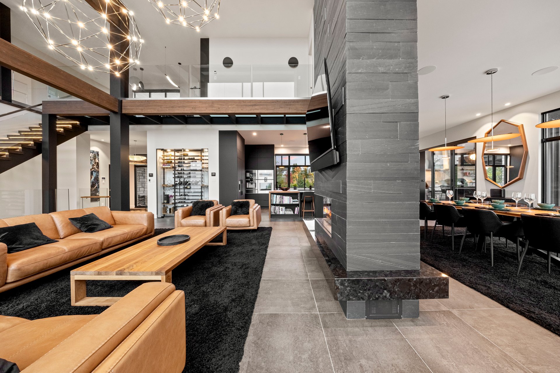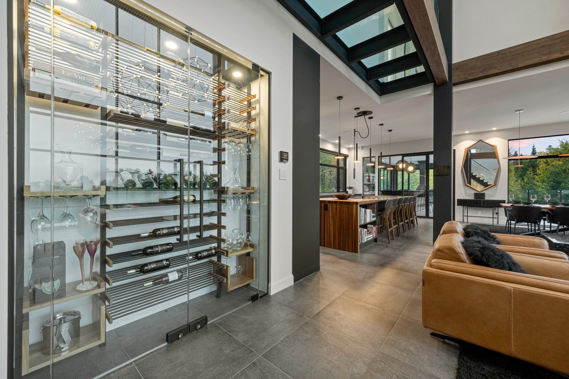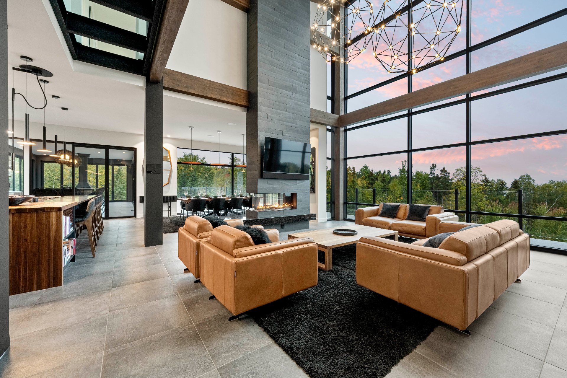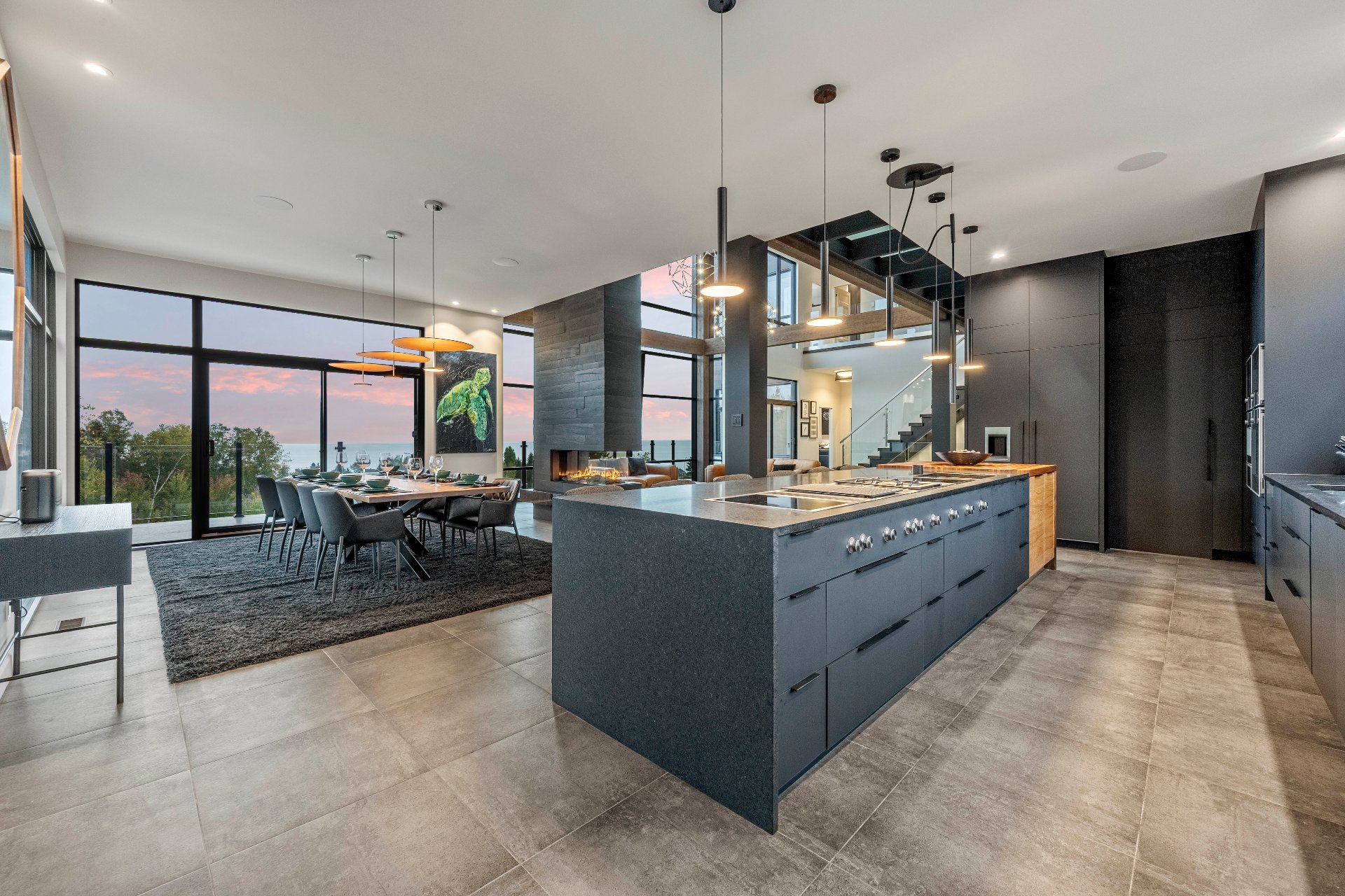 -From the moment you enter, 20-foot glass walls offer breathtaking views of the river, living room, and dining area, all enjoying daily sunsets. Exposed beams, a panoramic fireplace, Sonneman chandeliers, and a wine cellar complete the space.