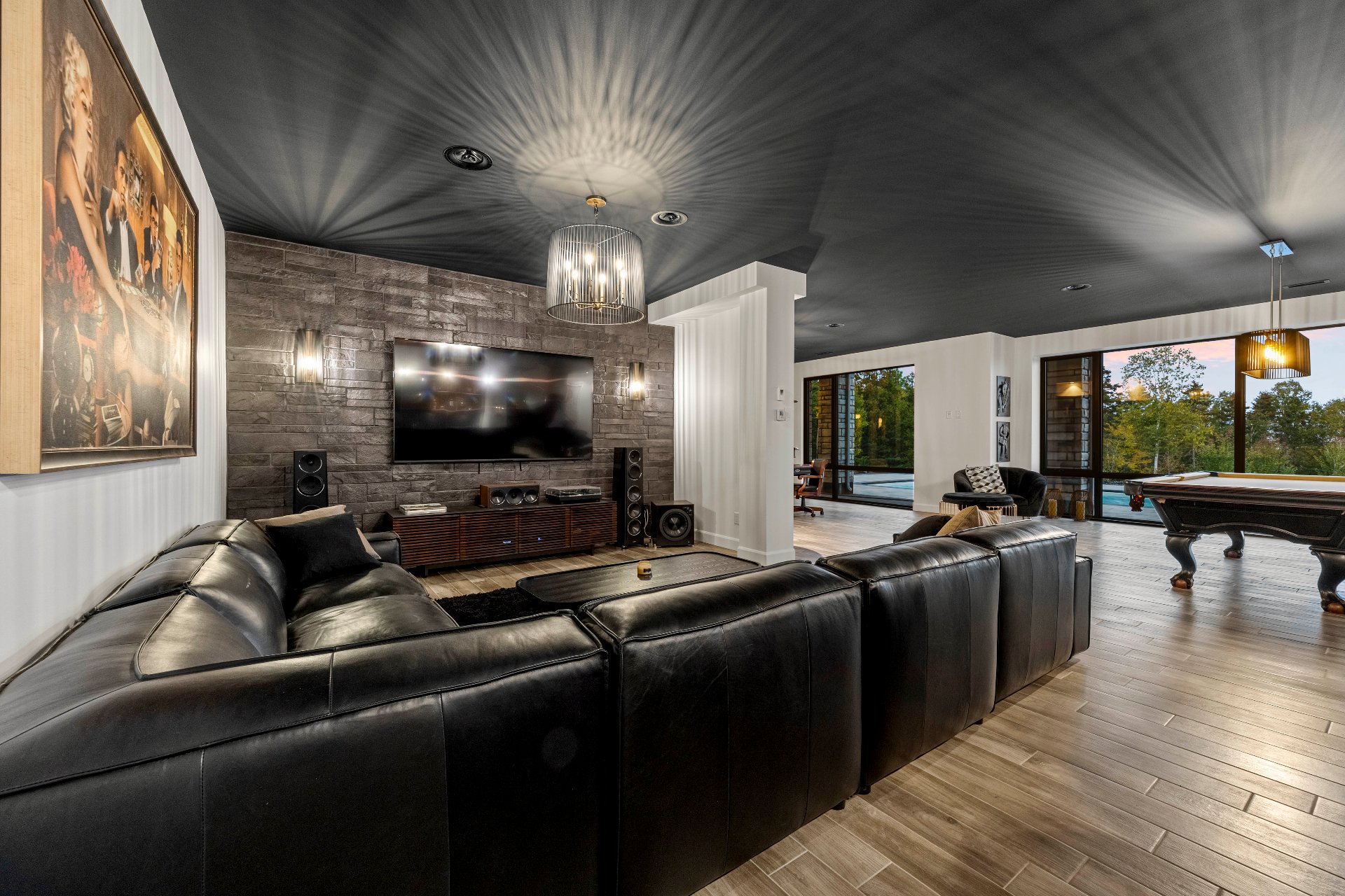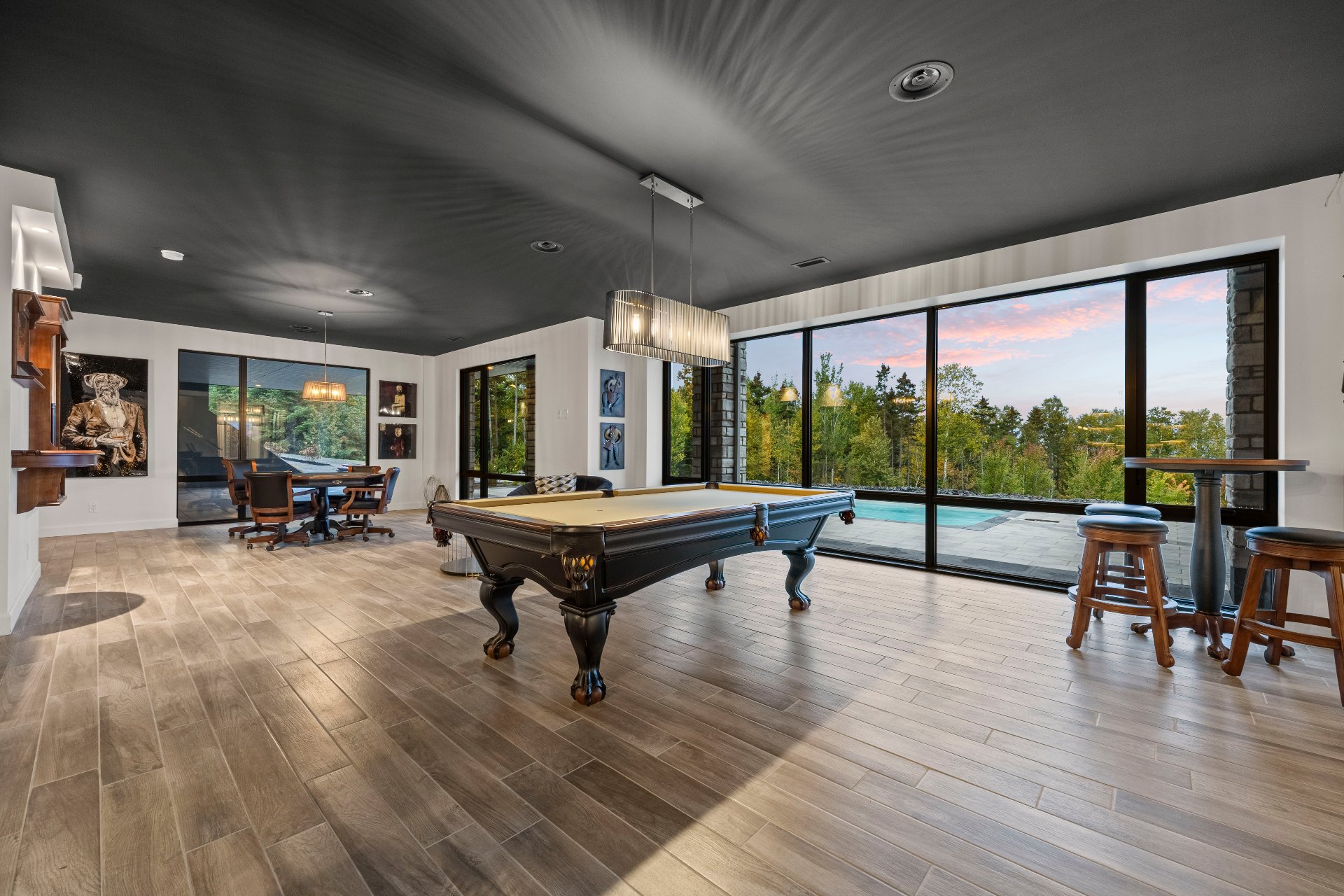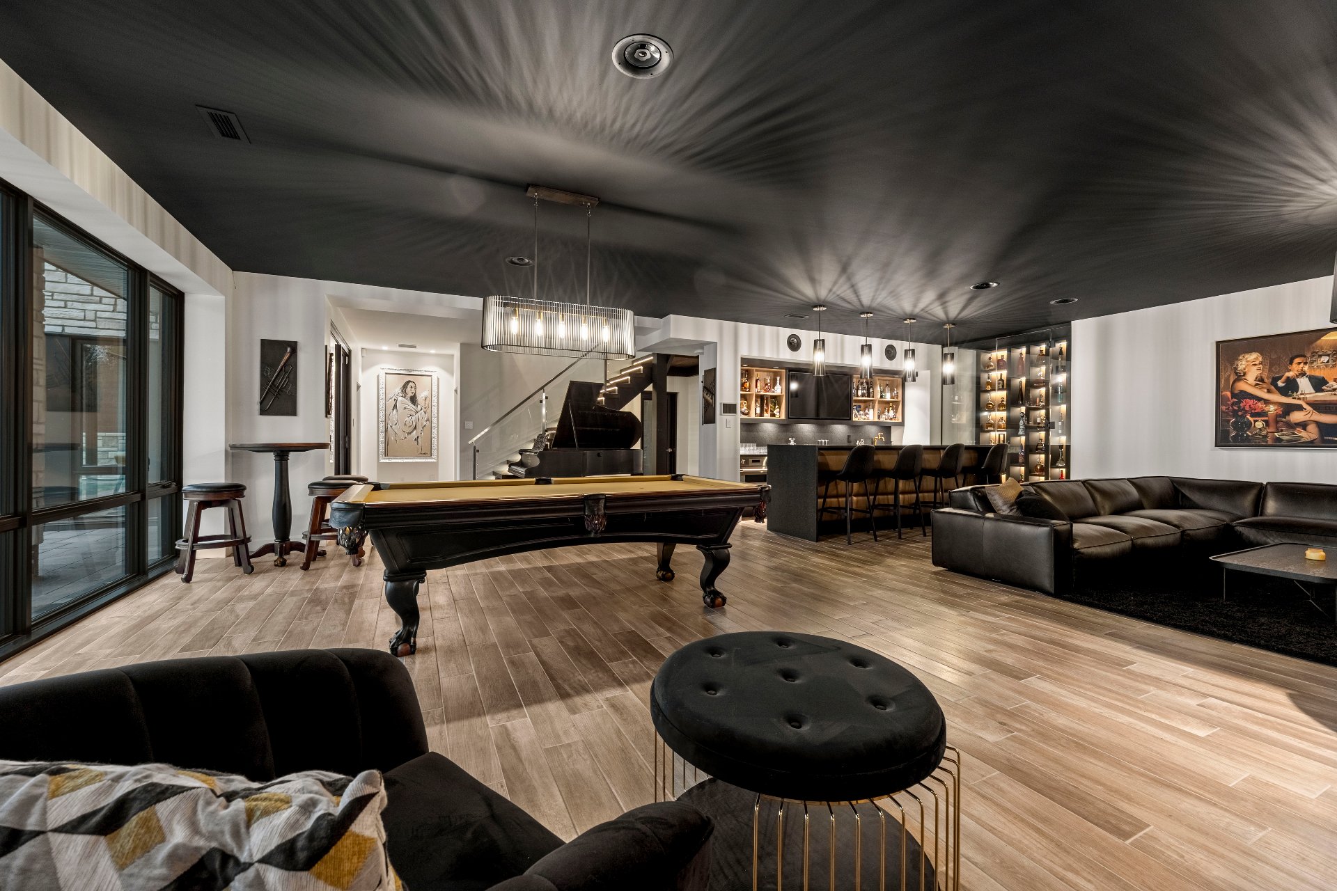 -The garden level, with floor-to-ceiling windows overlooking the pool, fire pit, and river, includes a living area, billiards space, poker area, and piano.