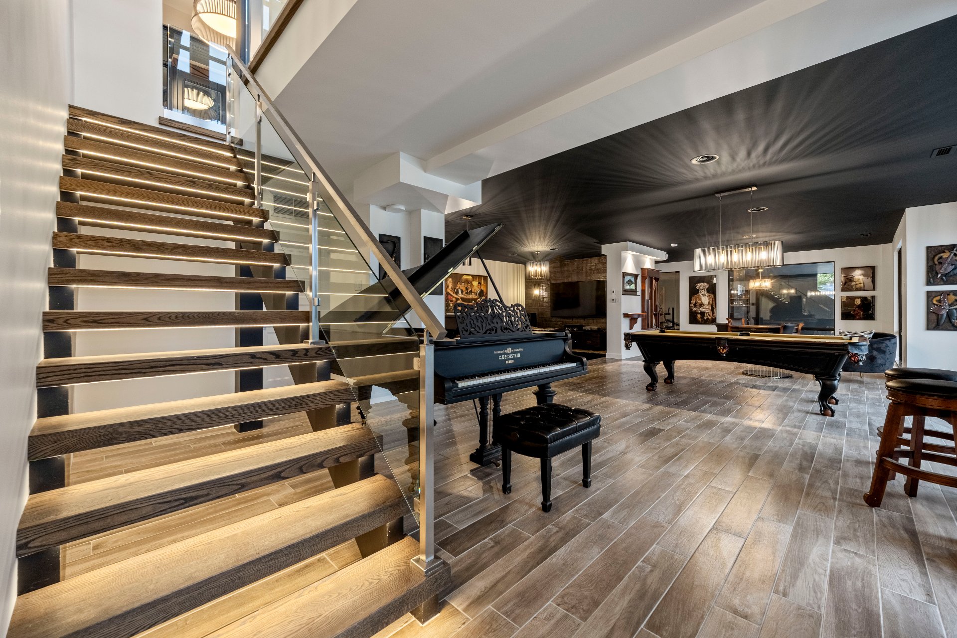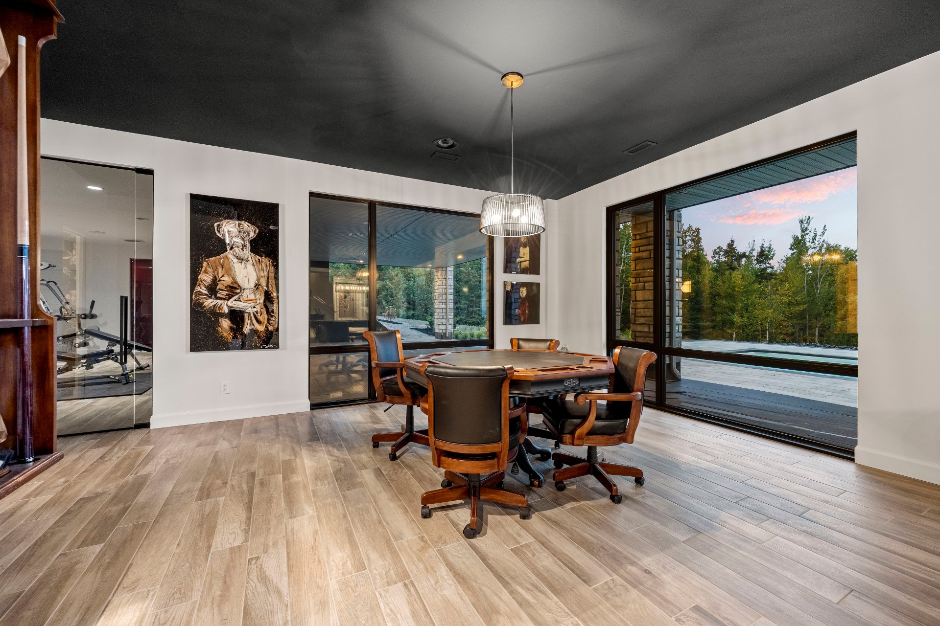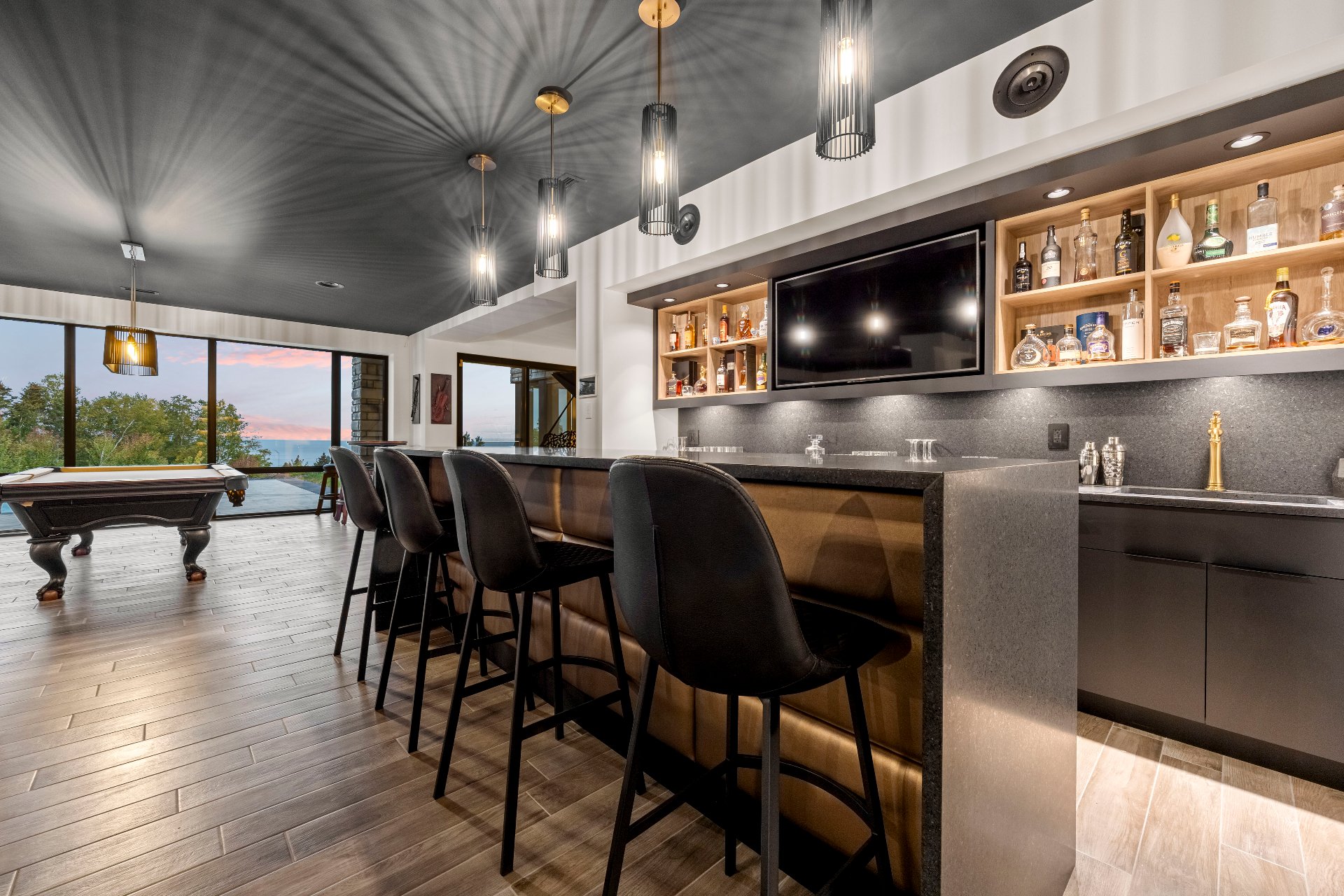 -The garden level, with floor-to-ceiling windows overlooking the pool, fire pit, and river, includes a living area, billiards space, poker area, and piano.