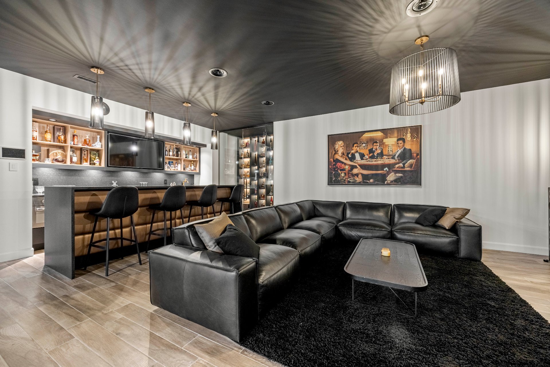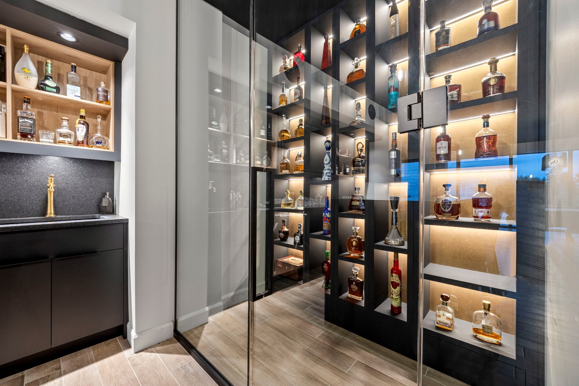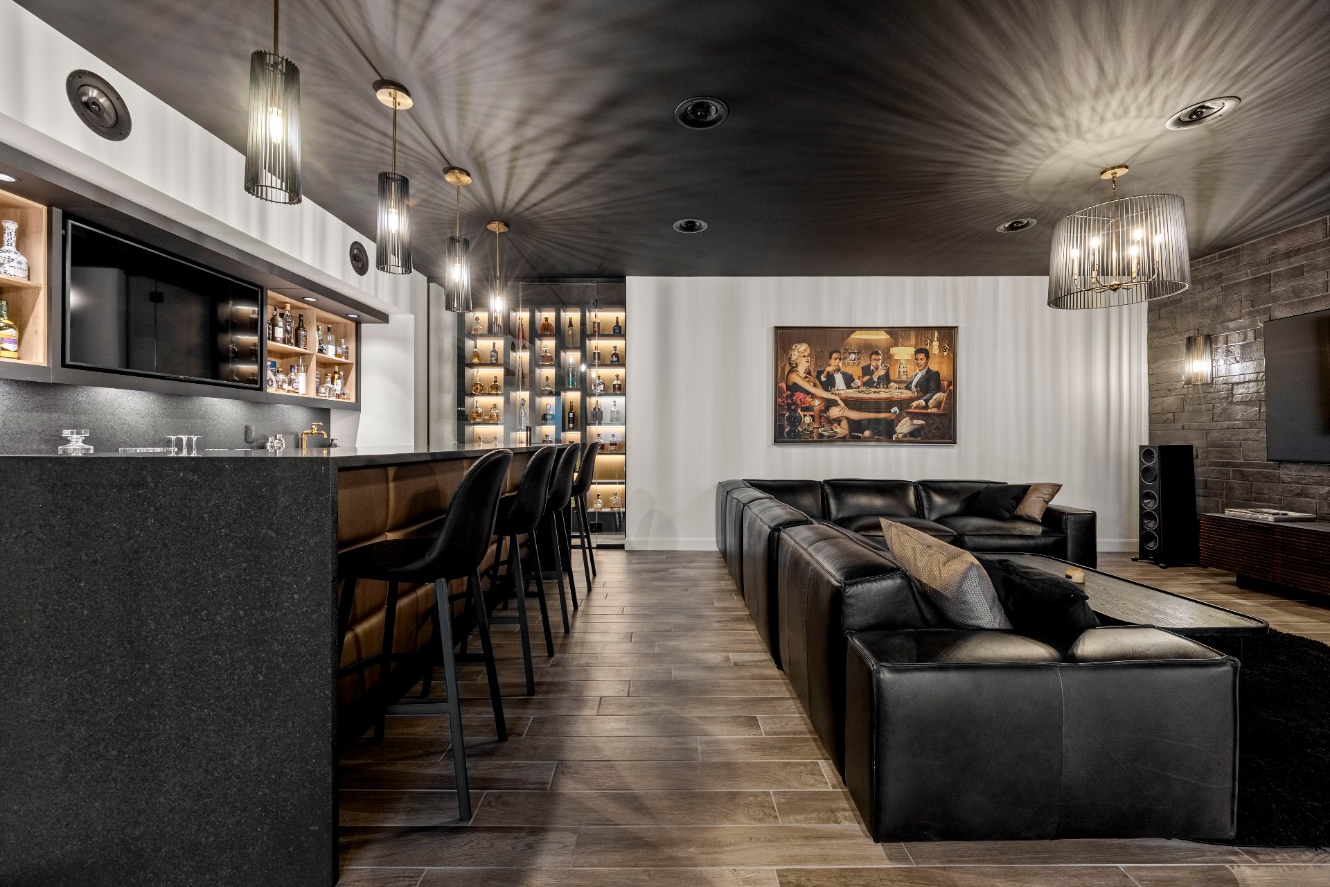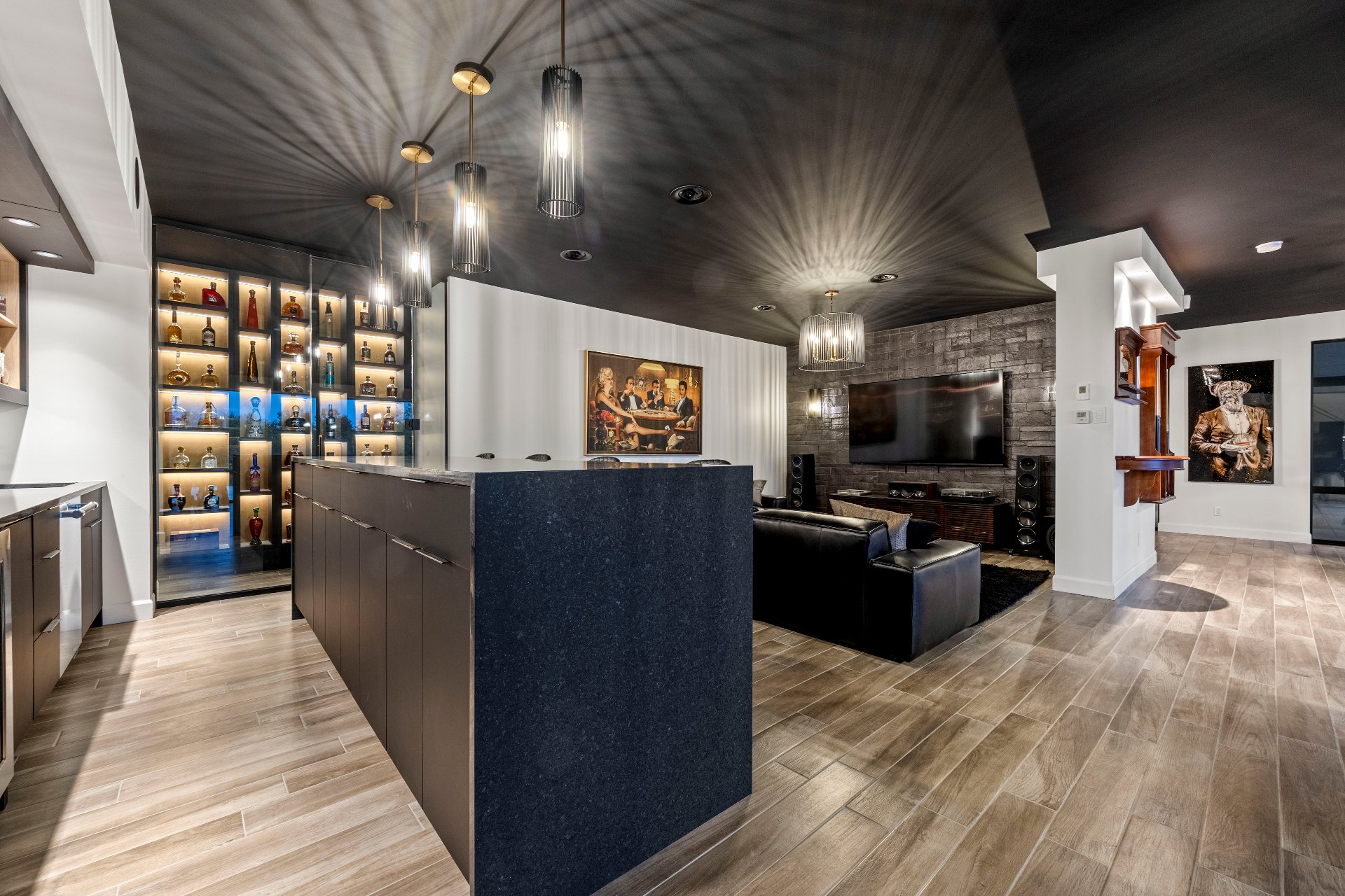 -The lounge bar with granite countertops, Thermador appliances, and a spirits wine cellar completes the space.
