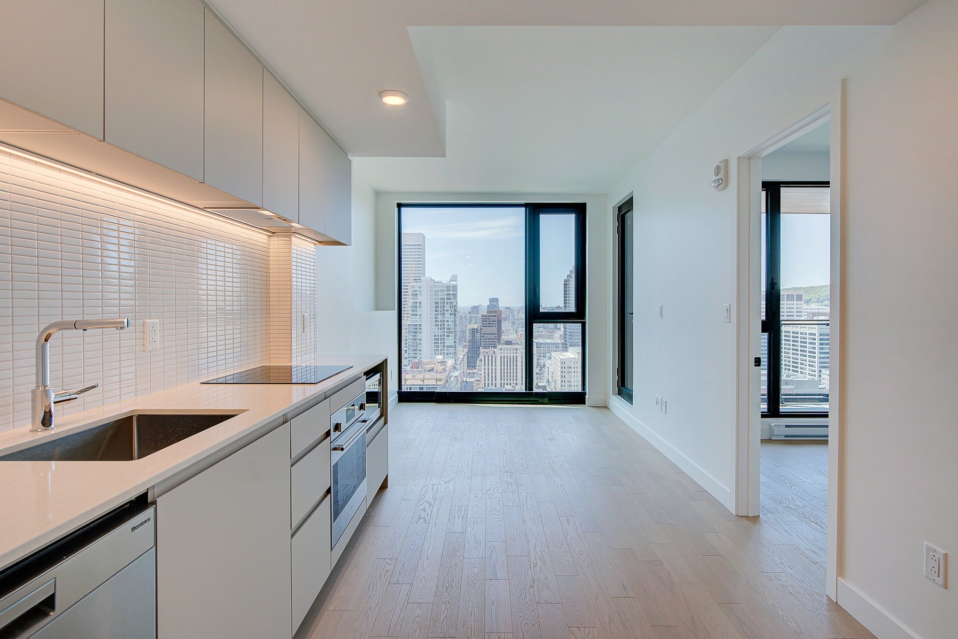 Welcome to this luxurious unit on the 34th floor of the prestigious Maestria Condominiums in Quartier des Spectacles. This exquisite one-bedroom condo offers breathtaking southwest-facing views of downtown Montreal through floor-to-ceiling windows. Enjoy a private covered balcony, perfect for watching the sunset over the city. This elegant unit provides access to top-notch amenities and activities. Enjoy a full spa with a steam room and sauna, an indoor/outdoor pool, a fully equipped gym, virtual golf, a private theater, an arcade, lounges, terraces and an impressive skybridge walkway. Experience refined luxury amidst vibrant city life.