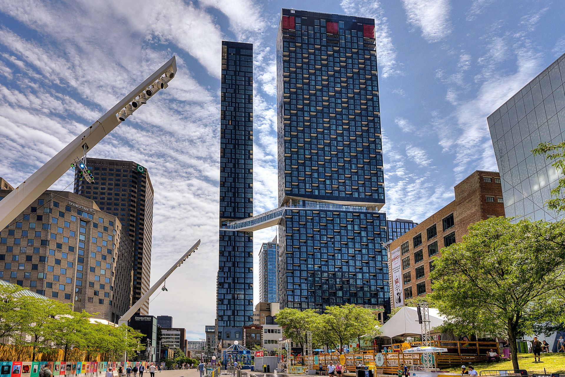 -26th floor glass walkway exclusive to private condos, library and business area, 7,700 square feet lounge with view of Place des Arts, roof terrace of the walkway