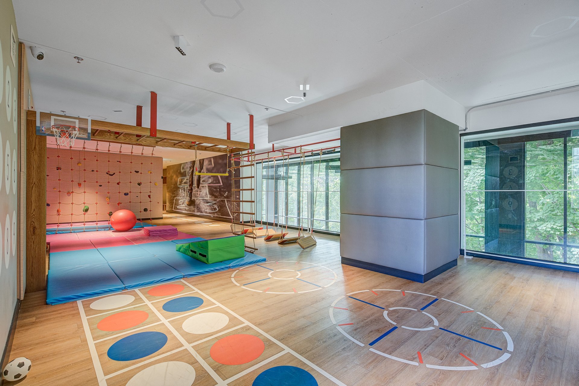 - Fitness center spanning over 6,800 square feet on two floors, consisting of a training room, a yoga room, and a complete children's playroom.