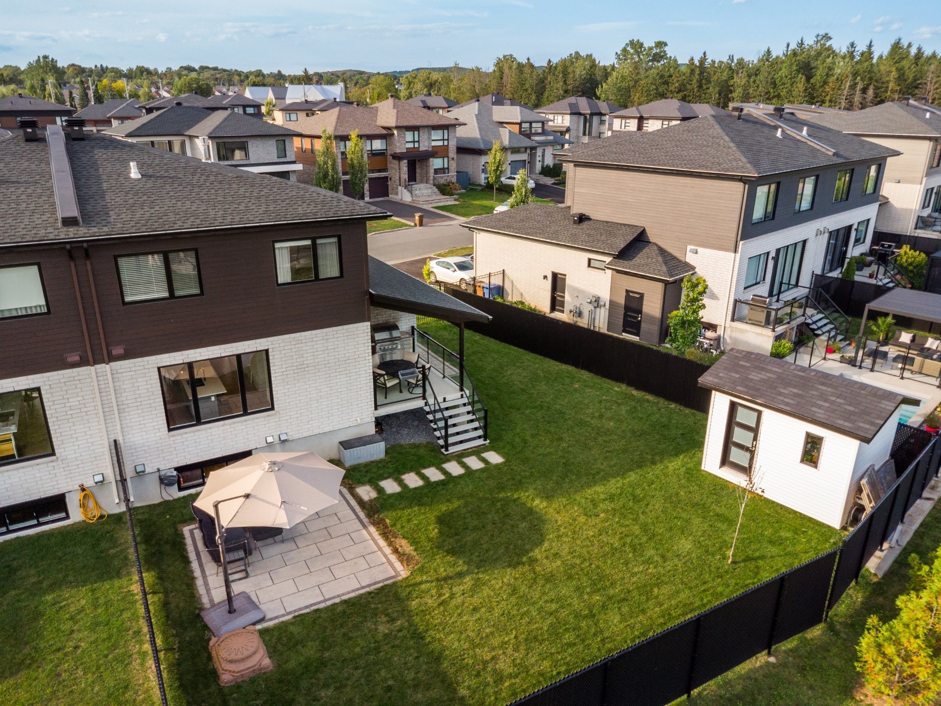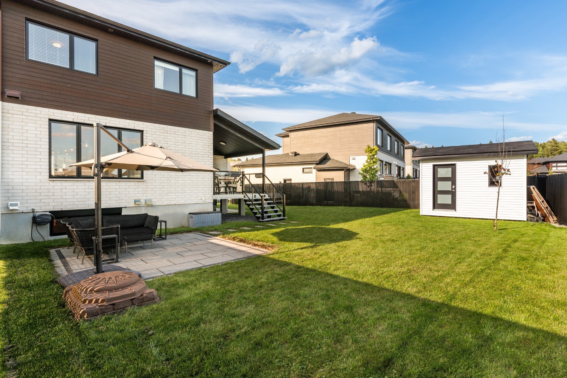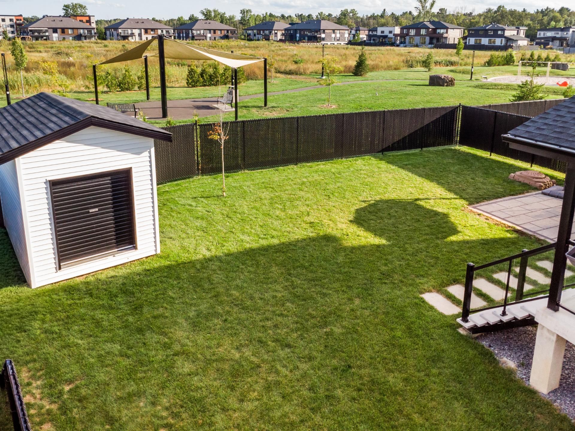 Enjoy a large backyard with no rear neighbors, offering privacy and views of a vast park. Two separate terraces and a garden shed complete the layout.