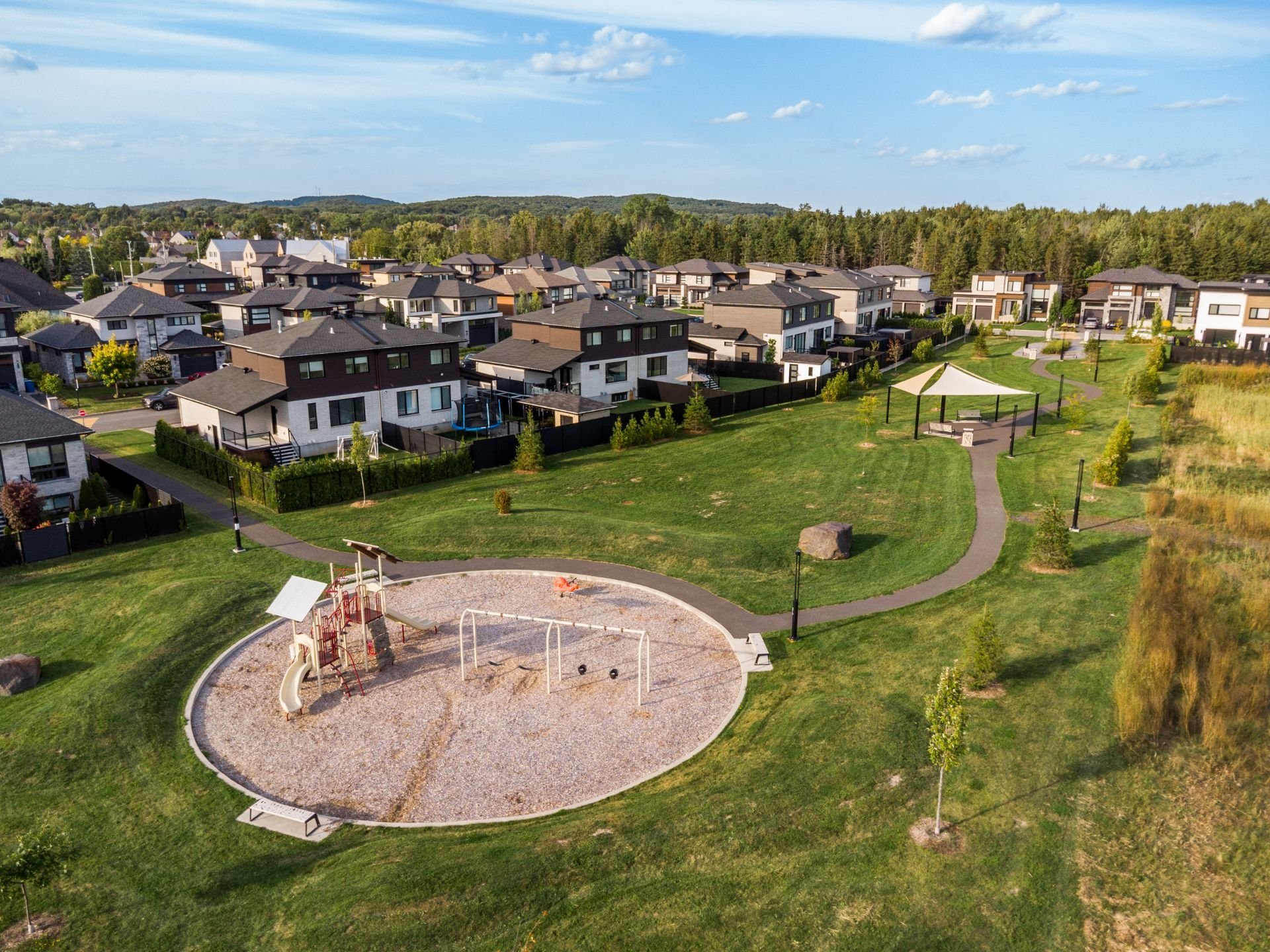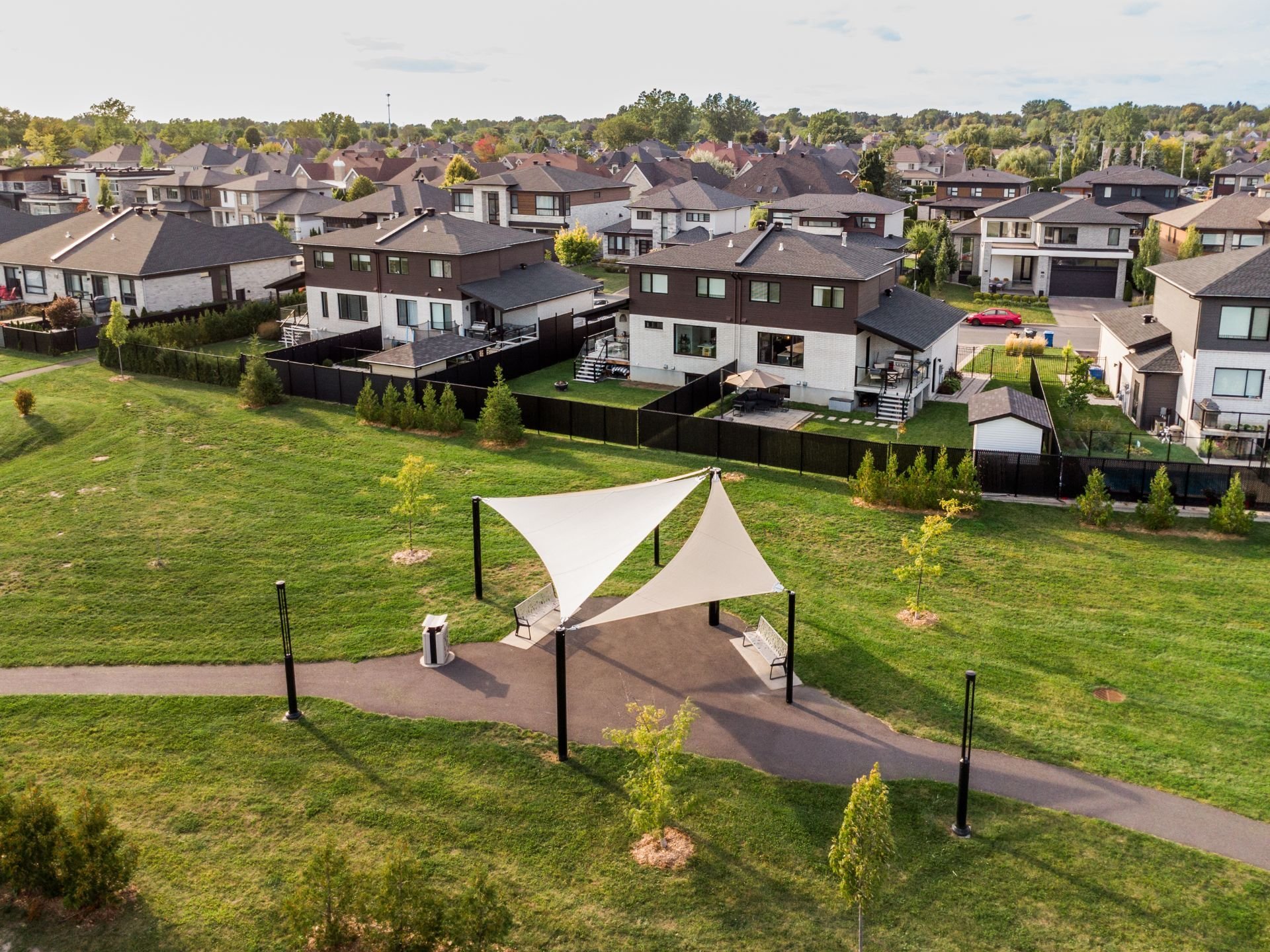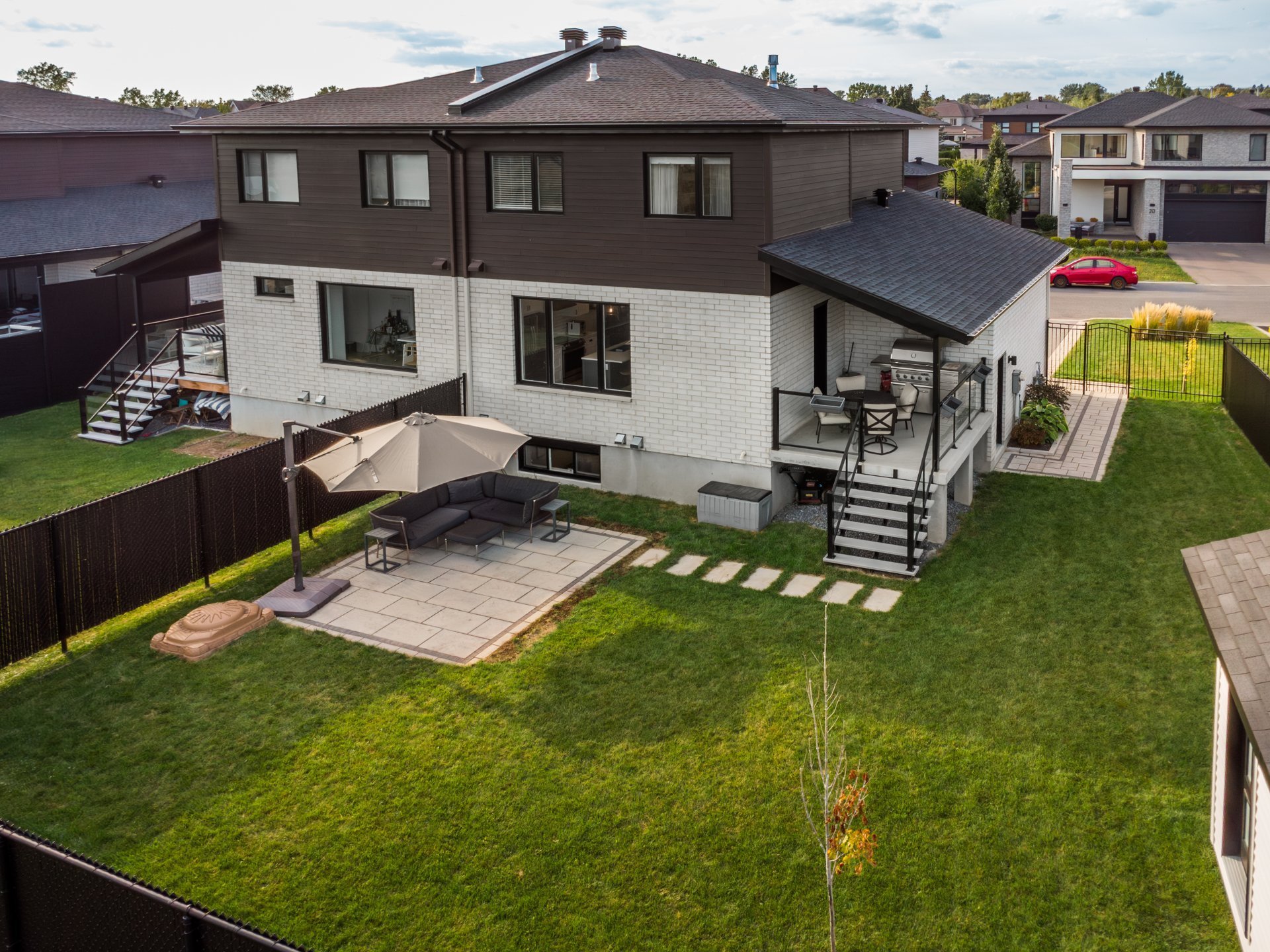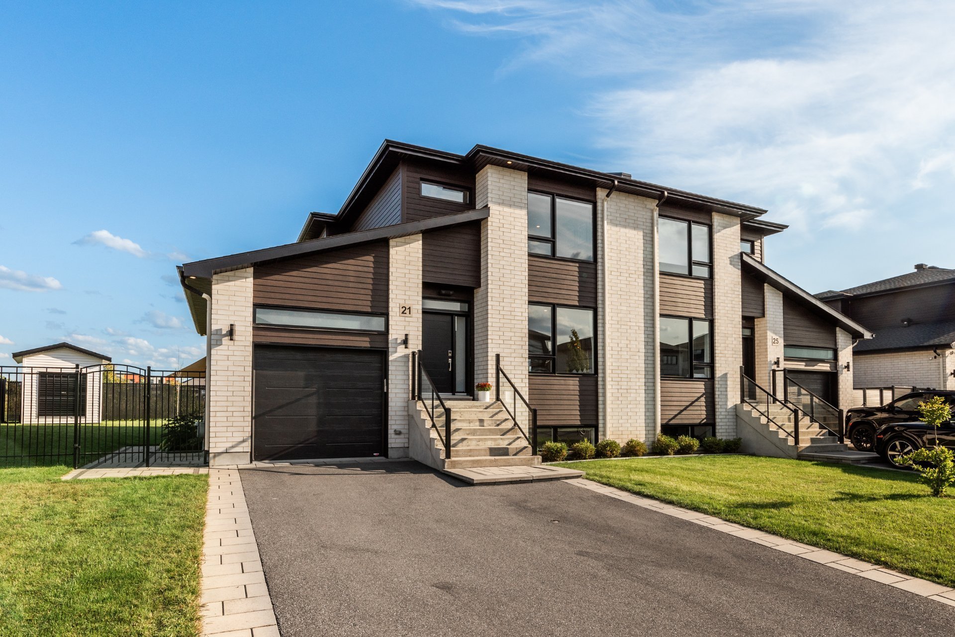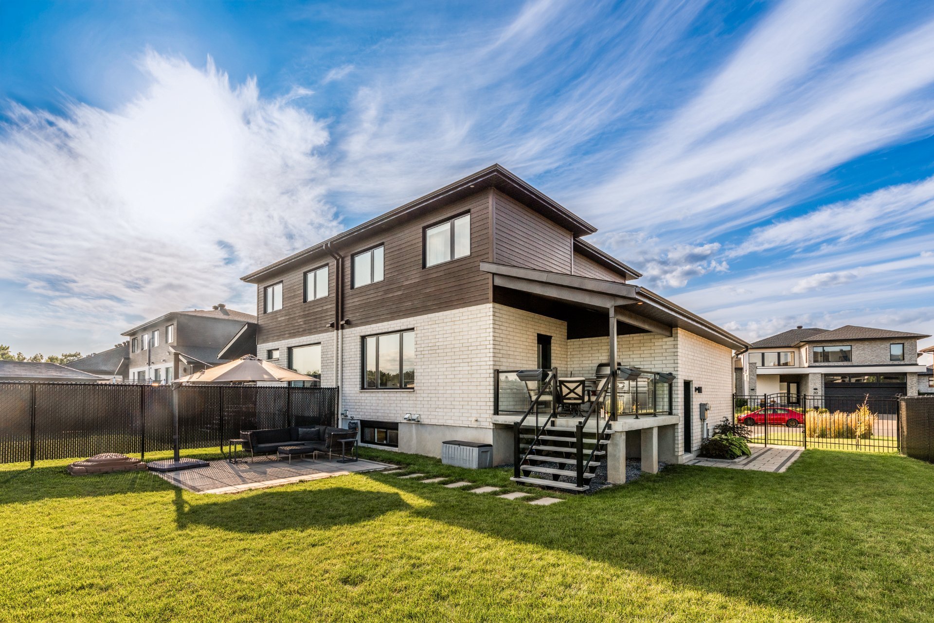 Projet Riviera : Superb contemporary-style property offering space, elegance and brightness. Open-plan first floor with 9' ceilings, large windows, warm living room with gas fireplace and high-end kitchen with quartz countertops, appliances and back kitchen. Three spacious bedrooms upstairs, including a master suite with walk-in closet. Finished basement with full bathroom and bright office. Large backyard with no rear neighbors and park views.