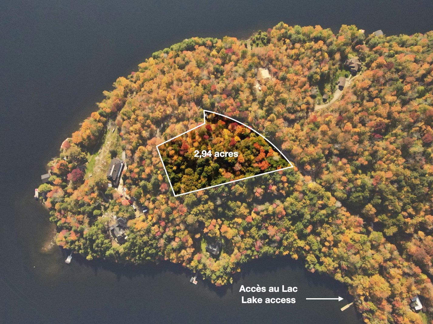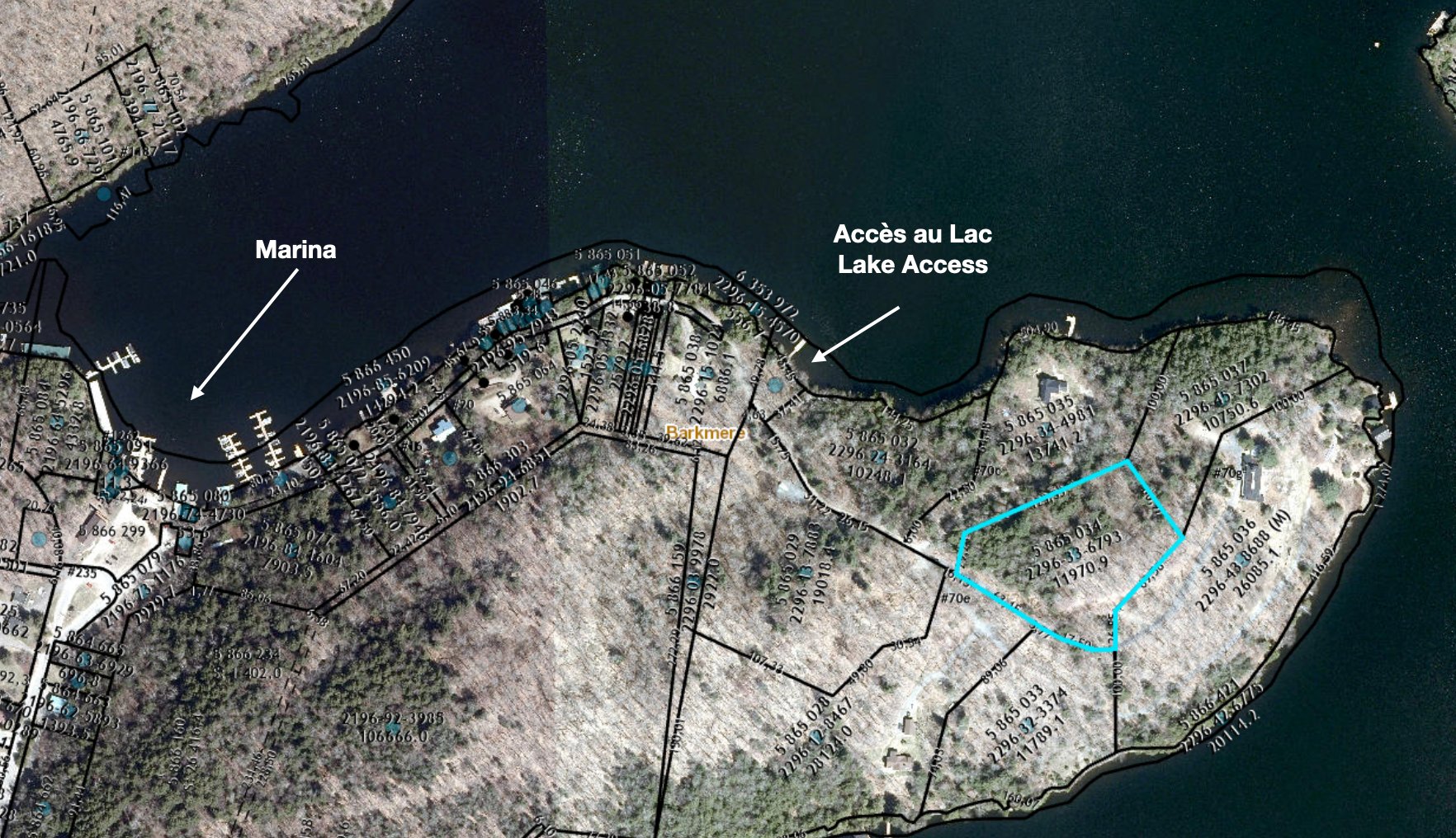 The seller has obtained a building permit, and can remit all relevant documents to the buyer. The buyer is responsible for making all appropriate verifications regarding the realization of his project. The access to the dock is made through lot # 5865030 Cadastre du Québec. As a resident of Barkmere, it is possible to rent a dock space at the marina to dock a boat.
