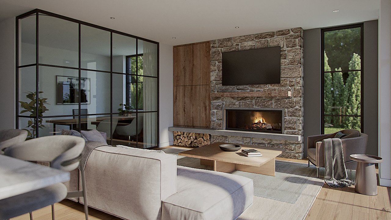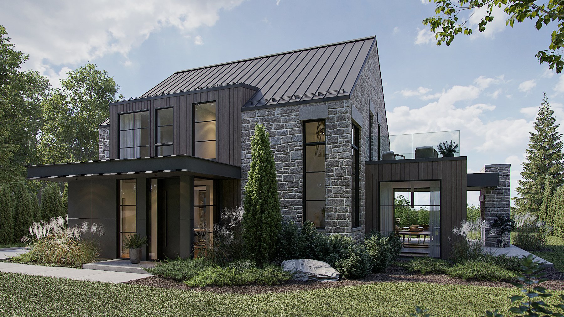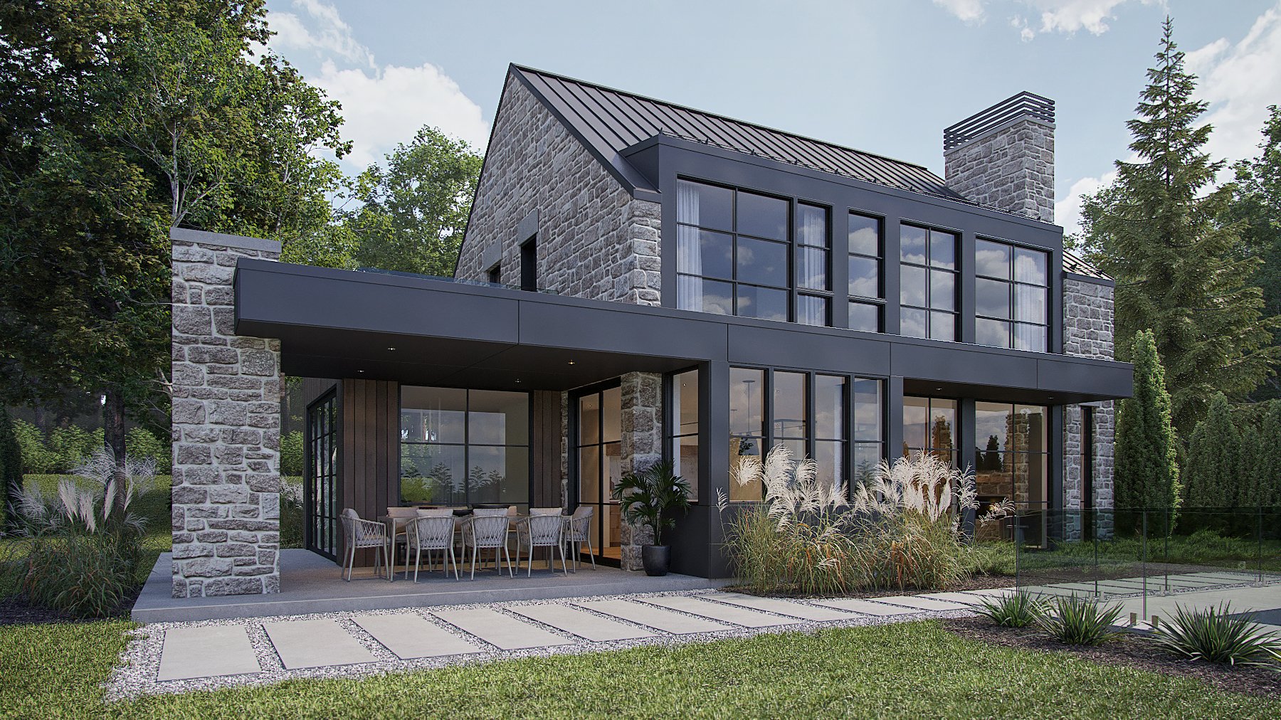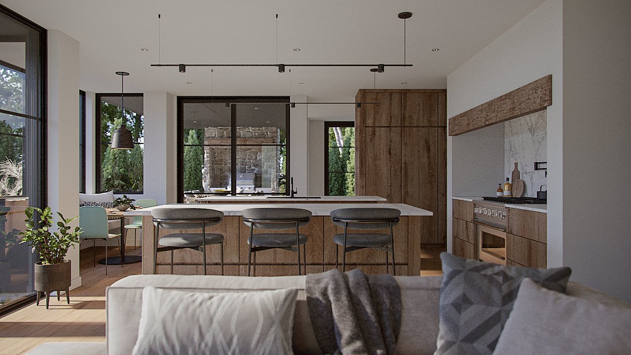 Stunning transitional-style home combining classic elegance with contemporary flair. Inspired by the charm of modern farmhouses, this residence features natural materials in soft, soothing tones that create a warm, inviting atmosphere. The main floor promotes convivial living with open, light-filled spaces, including a spectacular glass-walled dining area. An integrated office adds function and flexibility--perfect for working while staying connected to daily life. Conception by Talo