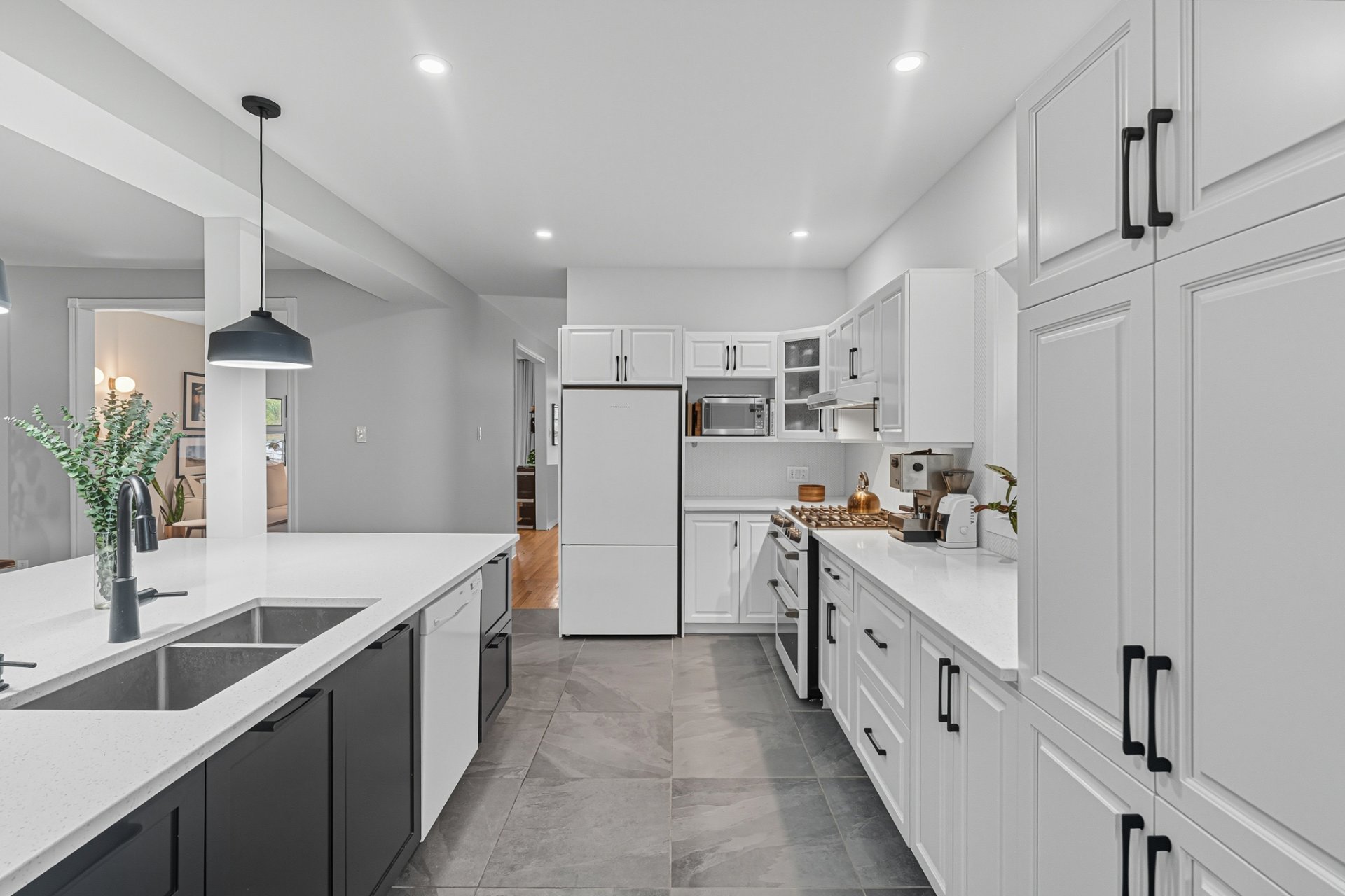 + Beautifully renovated kitchen with large lunch counter island, gas stove, and plenty of storage