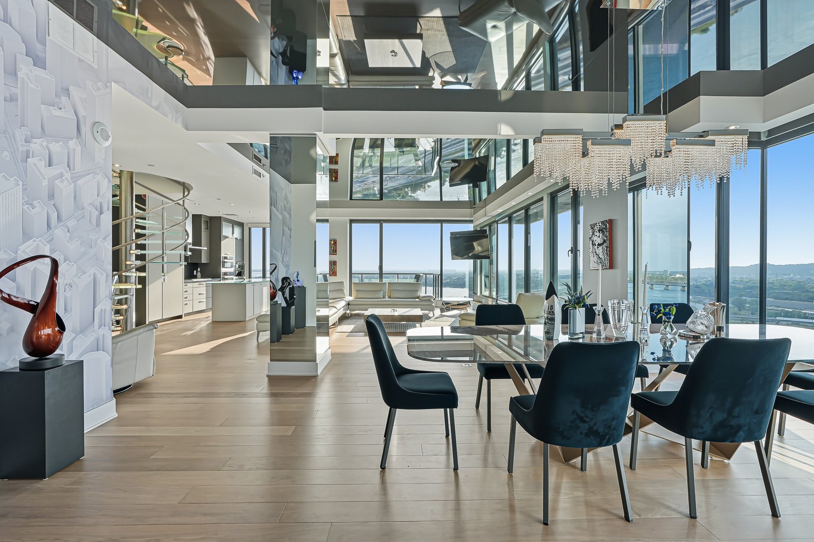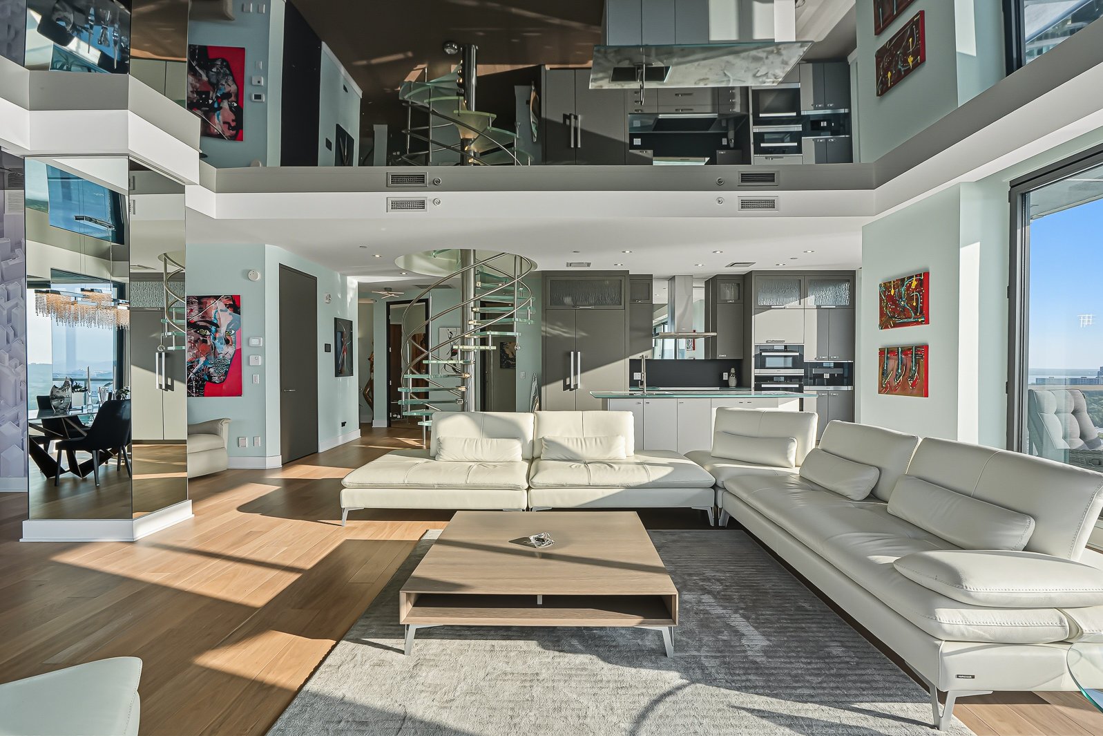 The units include two fully equipped kitchens plus a kitchenette; five luxurious private bathrooms + one powder room; and a unique glass spiral staircase.