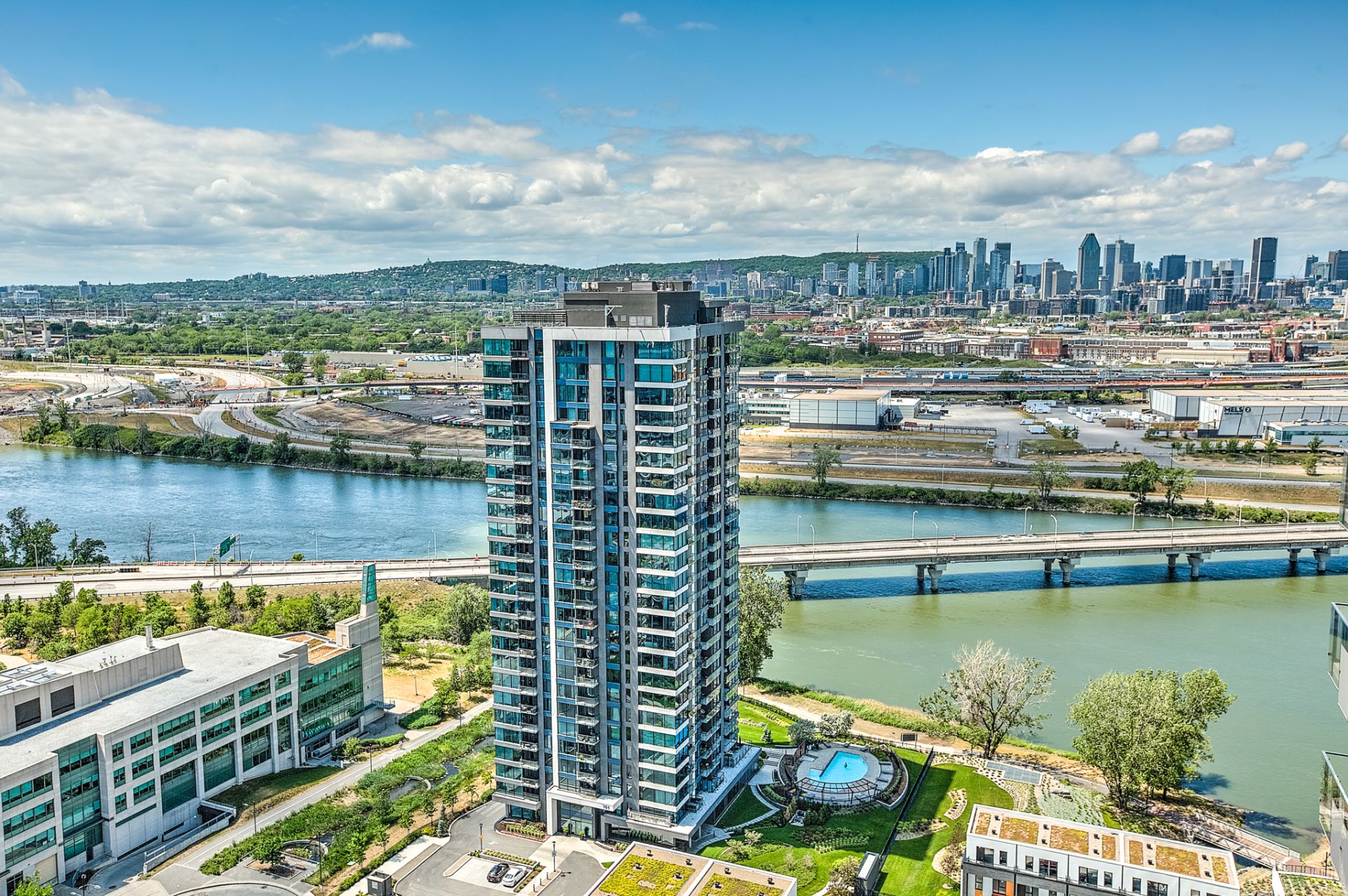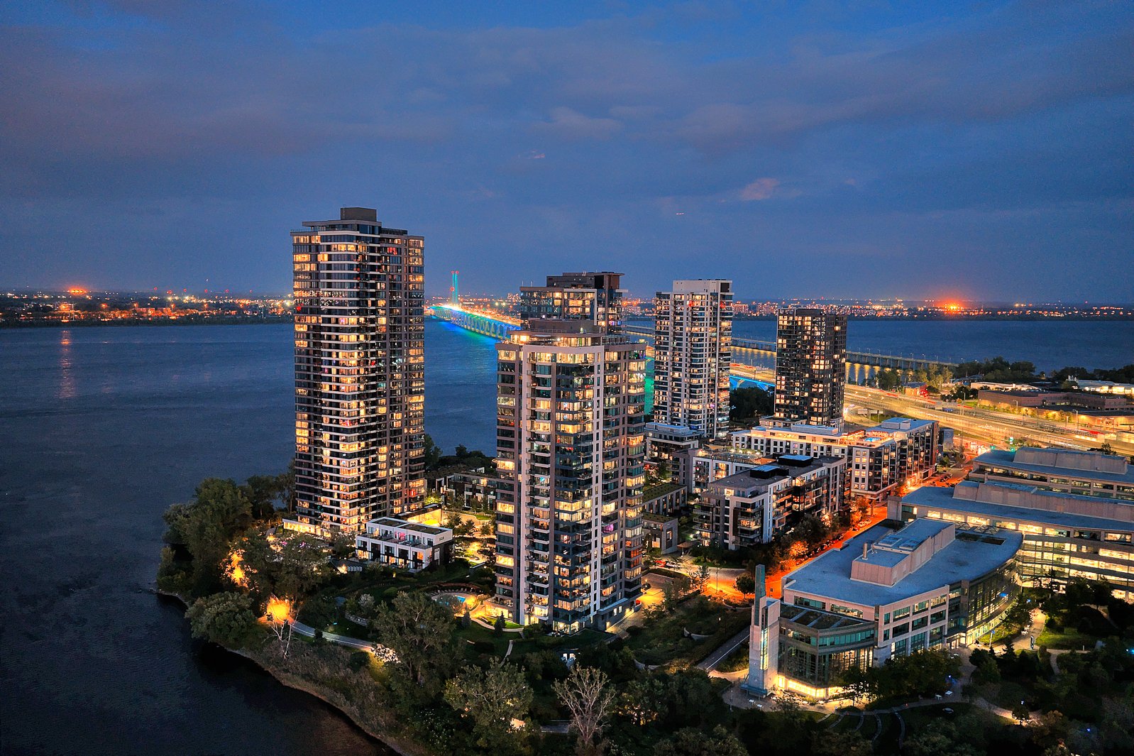 Ideally located, this property enjoys stunning, unobstructed views year-round of the Champlain Bridge, the South Shore, downtown Montreal, the St. Lawrence River, and magnificent sunsets.