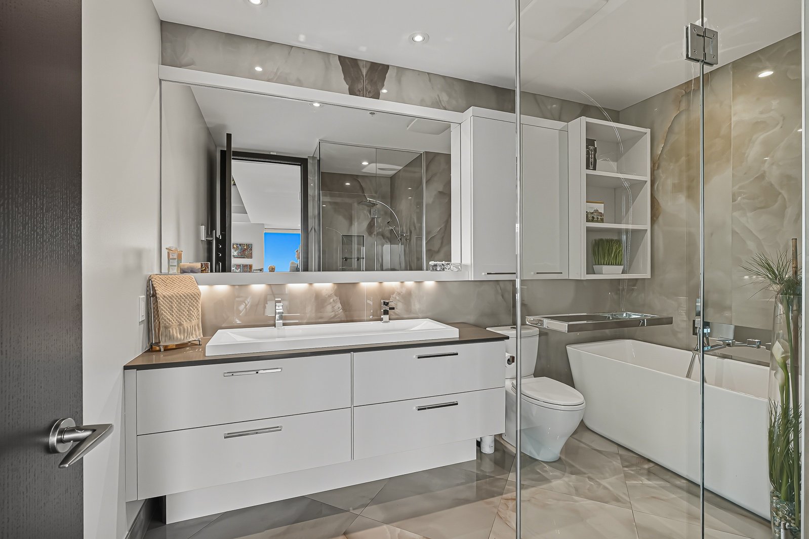 The secondary bathrooms are equally elegant, offering glass showers, heated floors, and premium finishes.