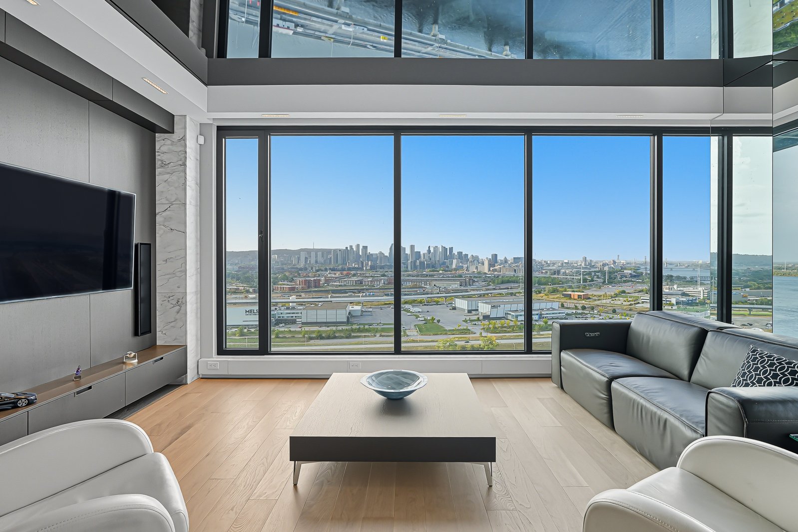 The property offers a spectacular 360° panorama, showcasing breathtaking views of Montreal through abundant windows on three sides of the unit.