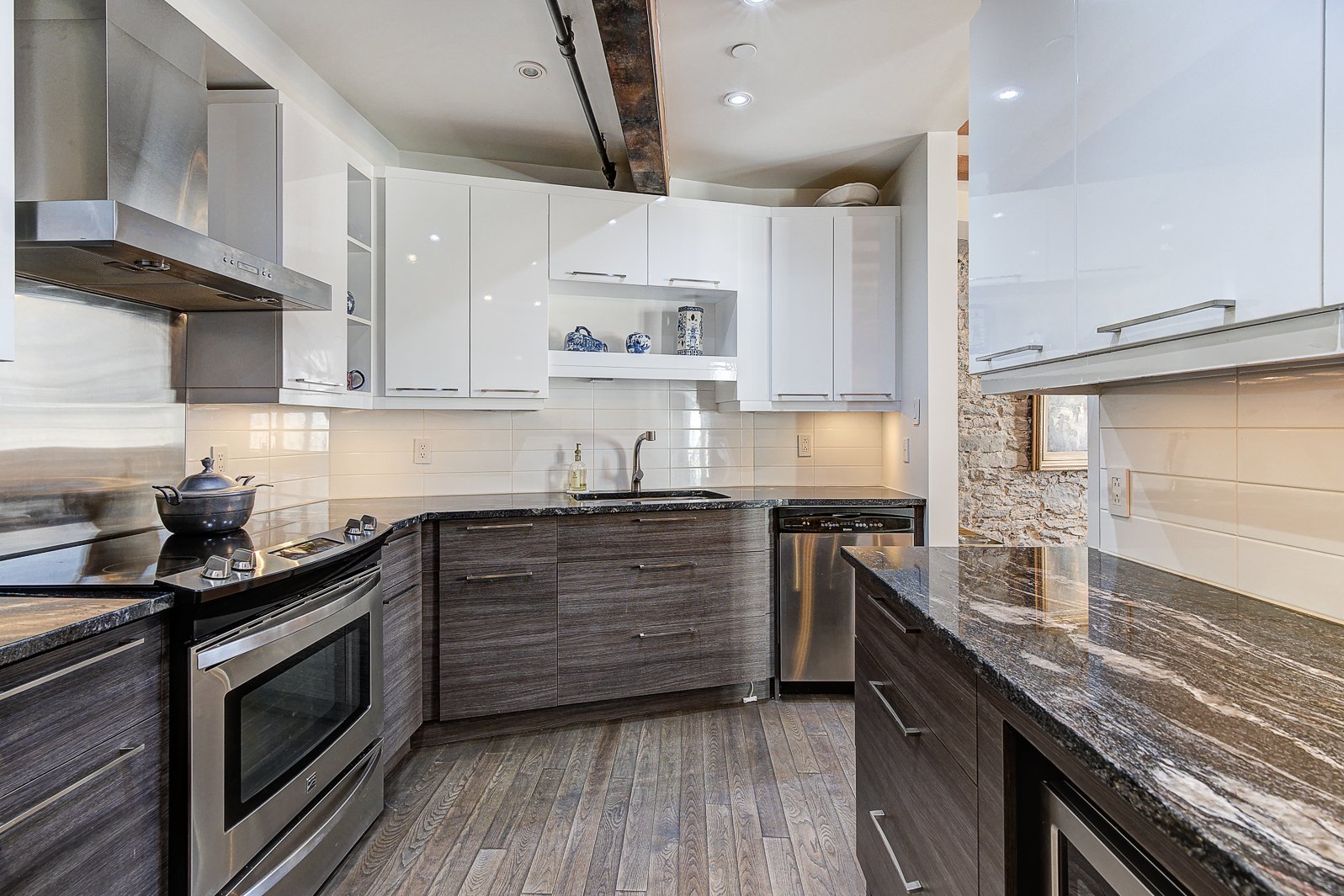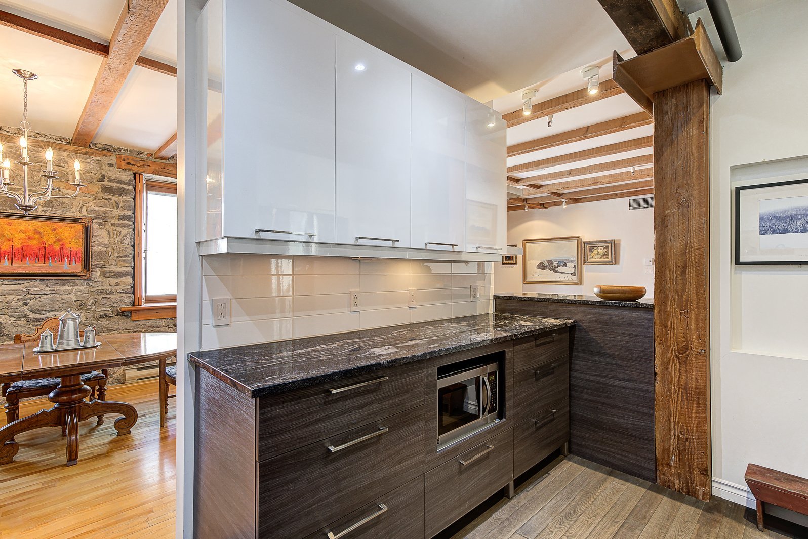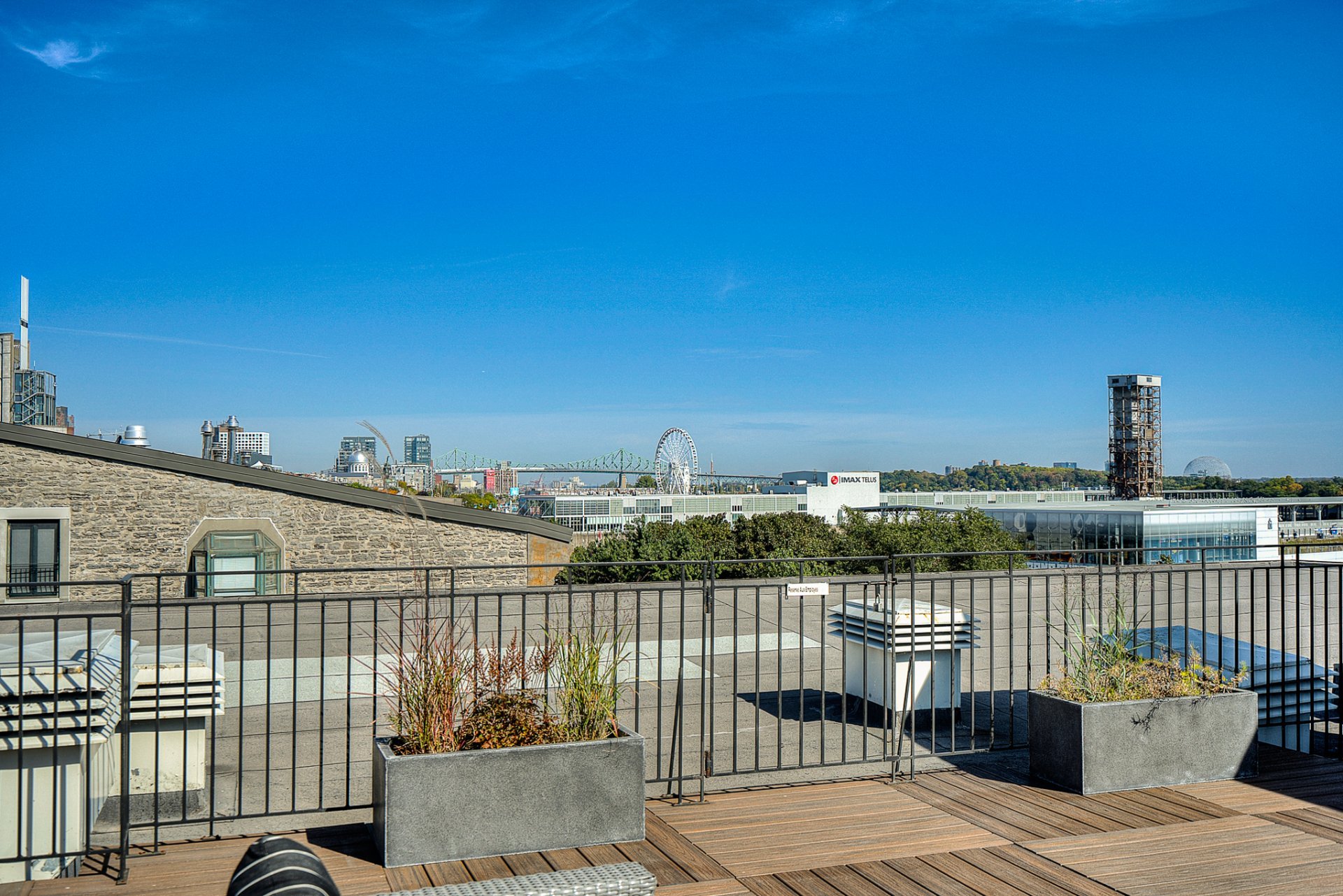 'The Youville' Gardens' Prestigious address, prime location facing the St-Lawrence River and The Old Port of Montreal. Wonderful 3 bedroom condominium bodes original cachet, beamed ceiling, stone walls, French windows and hardwood floors throughout. Open concept LVR/DNR, equipped kitchen, in-unit laundry within bathroom, ensuite bathroom and walk-in closet, 2 additional and spacious bedrooms. Common rooftop terrace, steps to bike path, museum, CentrePhi, restos, cafés, boutiques, hotels, transport & services...Garage & locker. Must see! A unique opportunity !