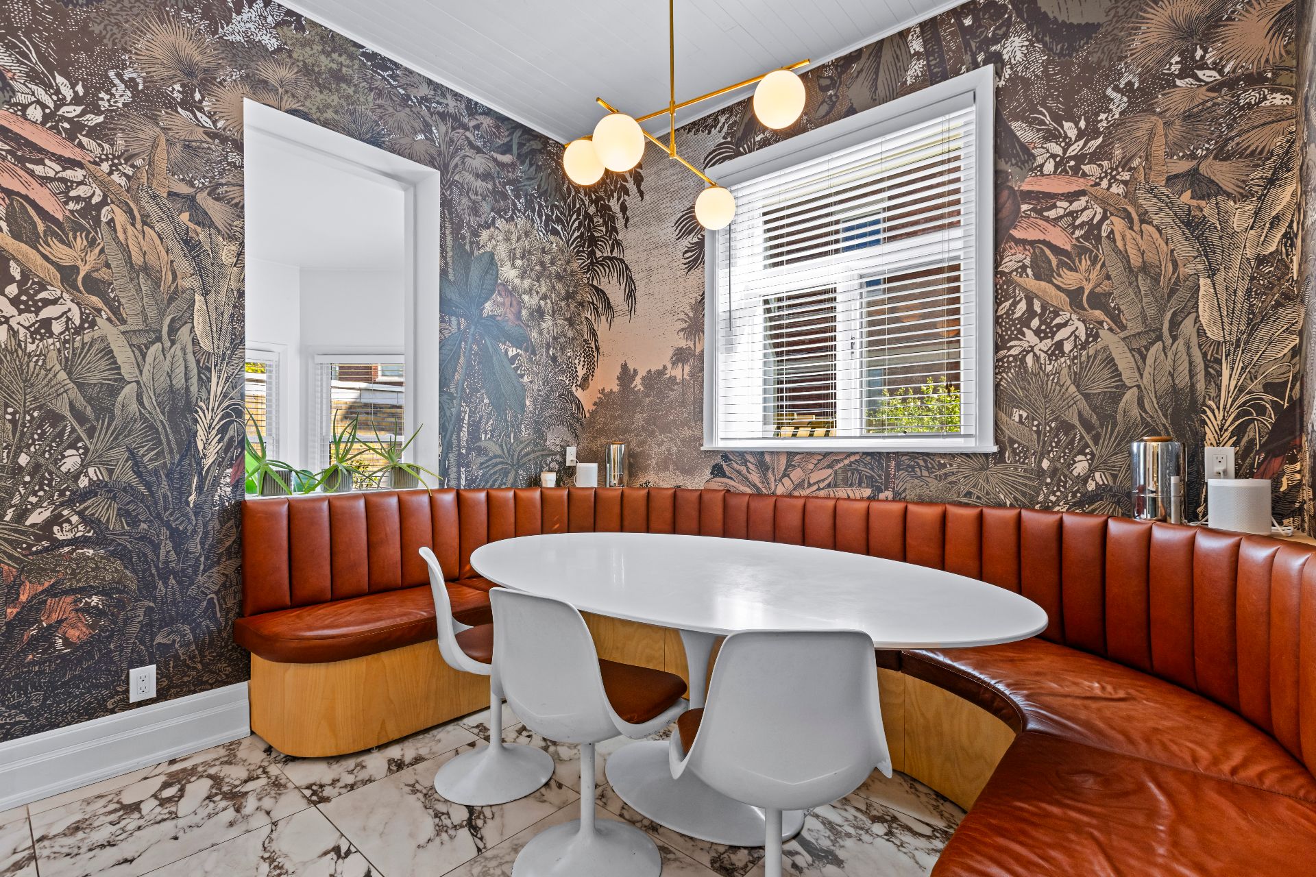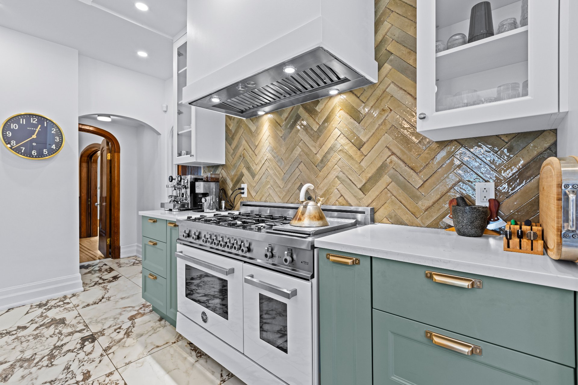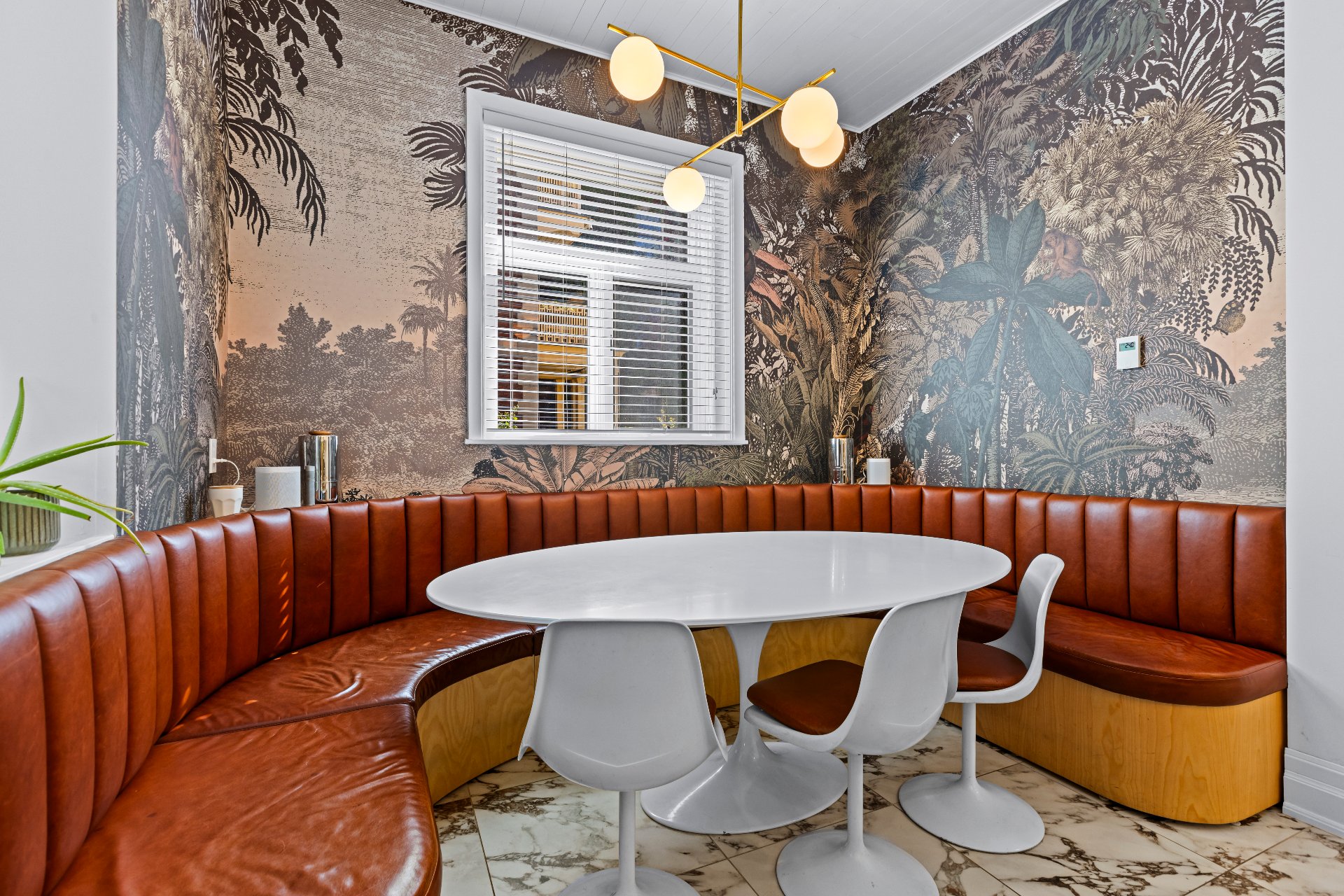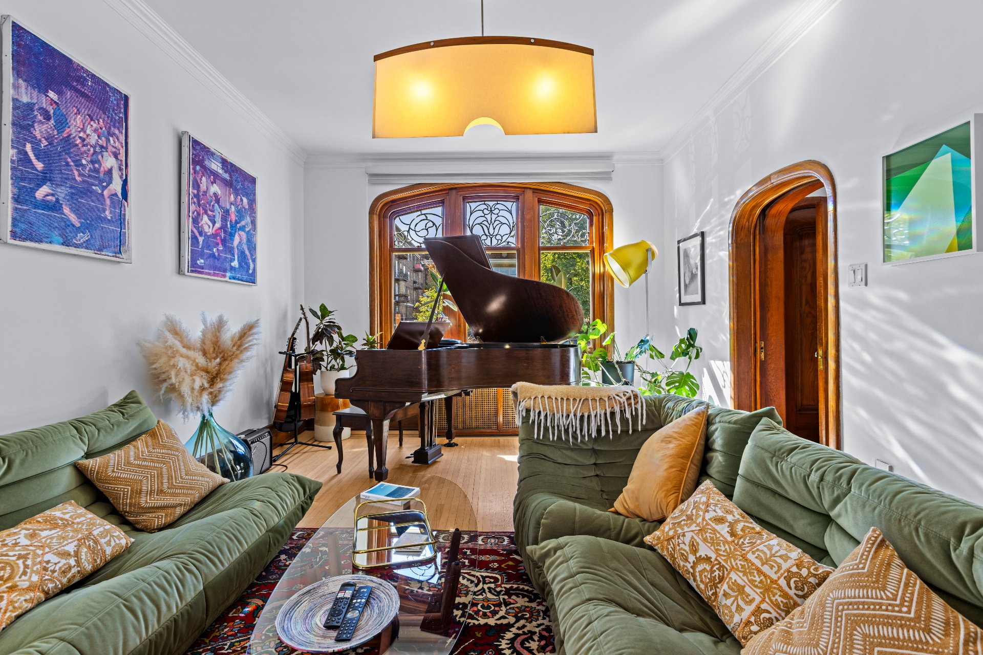 Step through the door into a majestic hall, where a circular wrought-iron staircase-a hand-sculpted work of art-rises gracefully under natural light, instantly revealing the home's noble character. To the left, the main living room unfolds, bathed in sunlight through exquisite stained glass and framed by a marble fireplace surround, with doors and windows meticulously restored in pure Art Nouveau style. The dining room, worthy of the grandest residences, invites refined entertaining before leading to the chef's kitchen, fully renovated in 2021: a vast central island, banquette seating for ten, a discreet office corner, and a veranda overlooking the garden-an ideal setting to gather, celebrate, and create memories. A second living room, piano corner, and family space complete this floor, blending elegance and functionality for everyday life and special occasions alike.