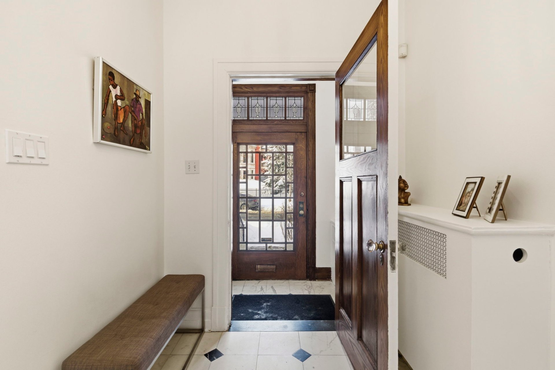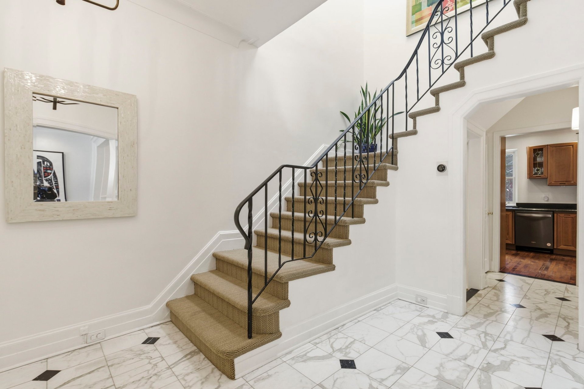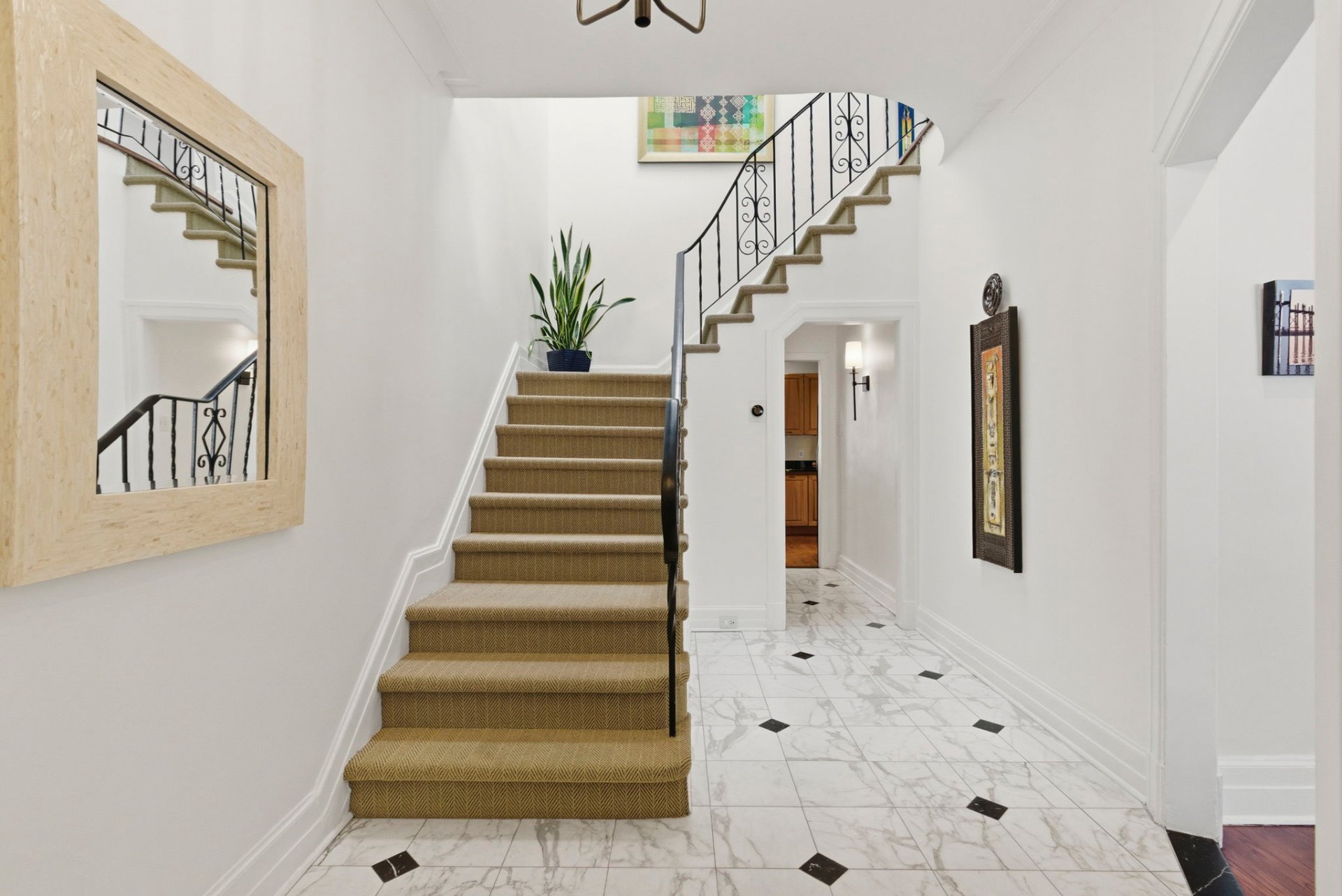 - Entrance vestibule with marble flooring and a central staircase illuminated by a large skylight