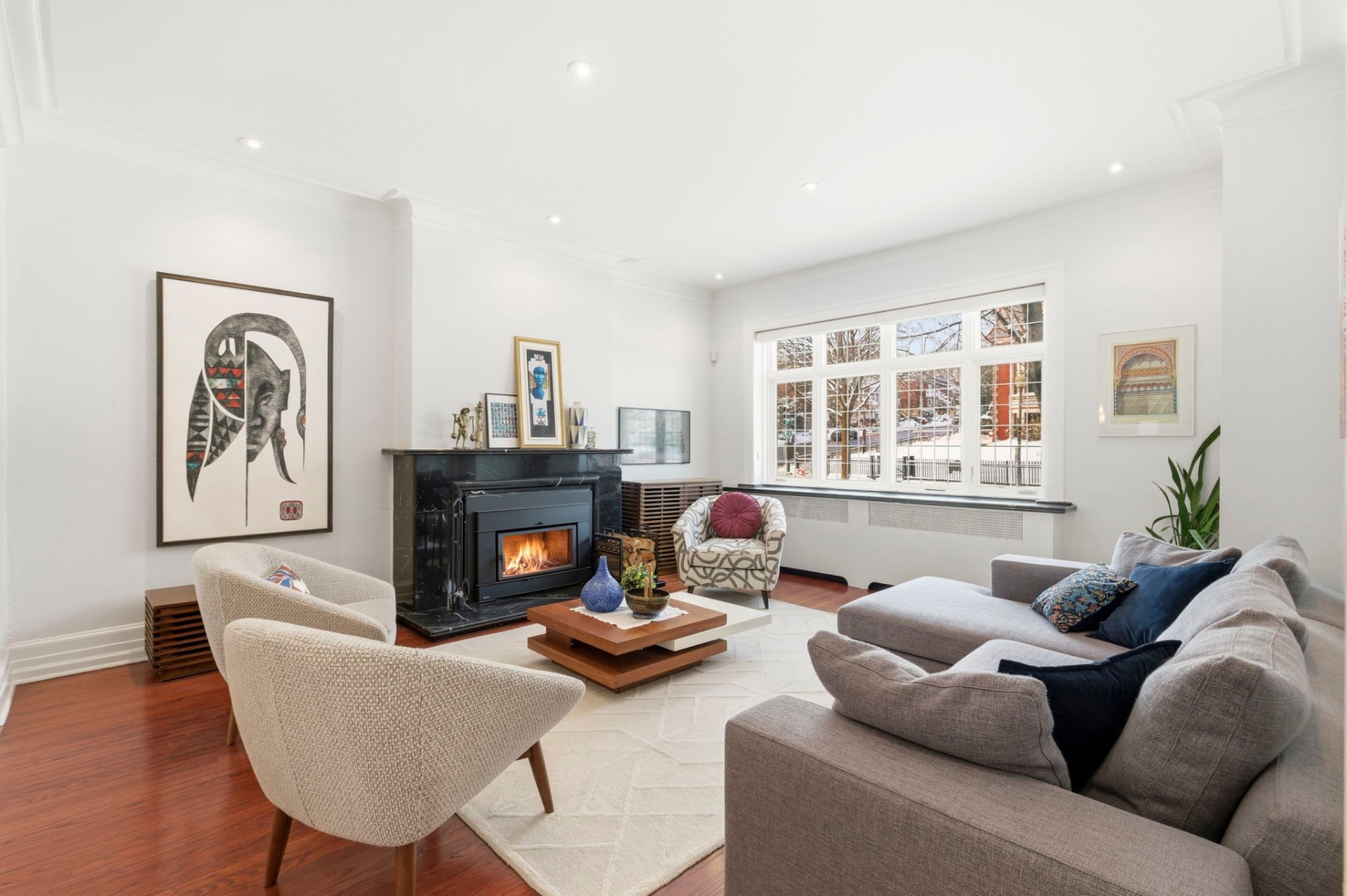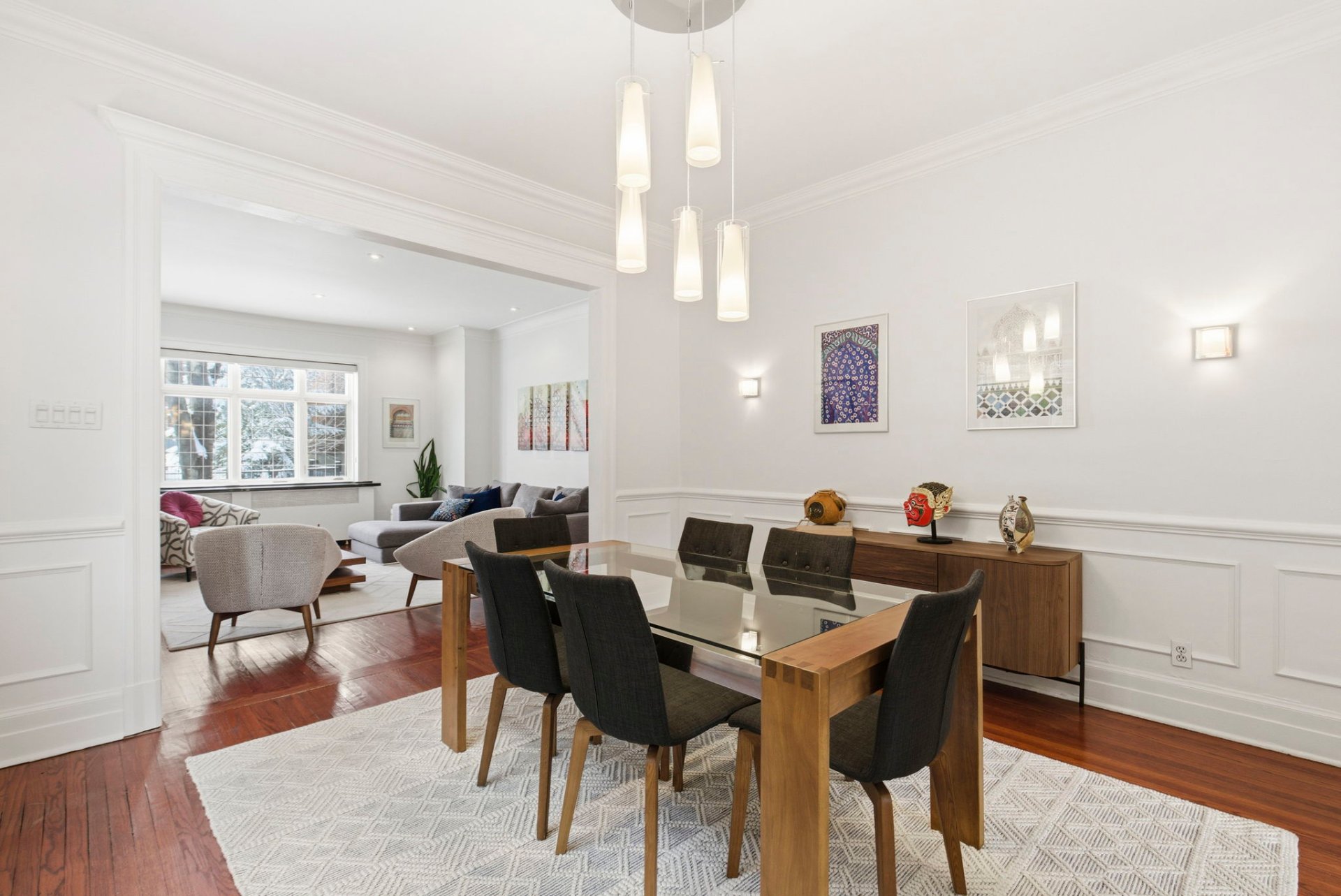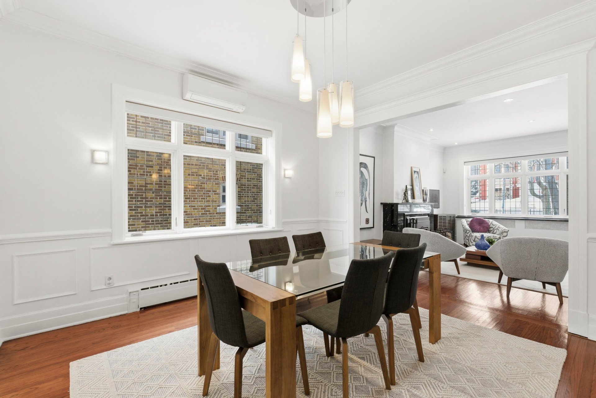 - Bright and spacious living room with fireplace, opening onto a formal dining room