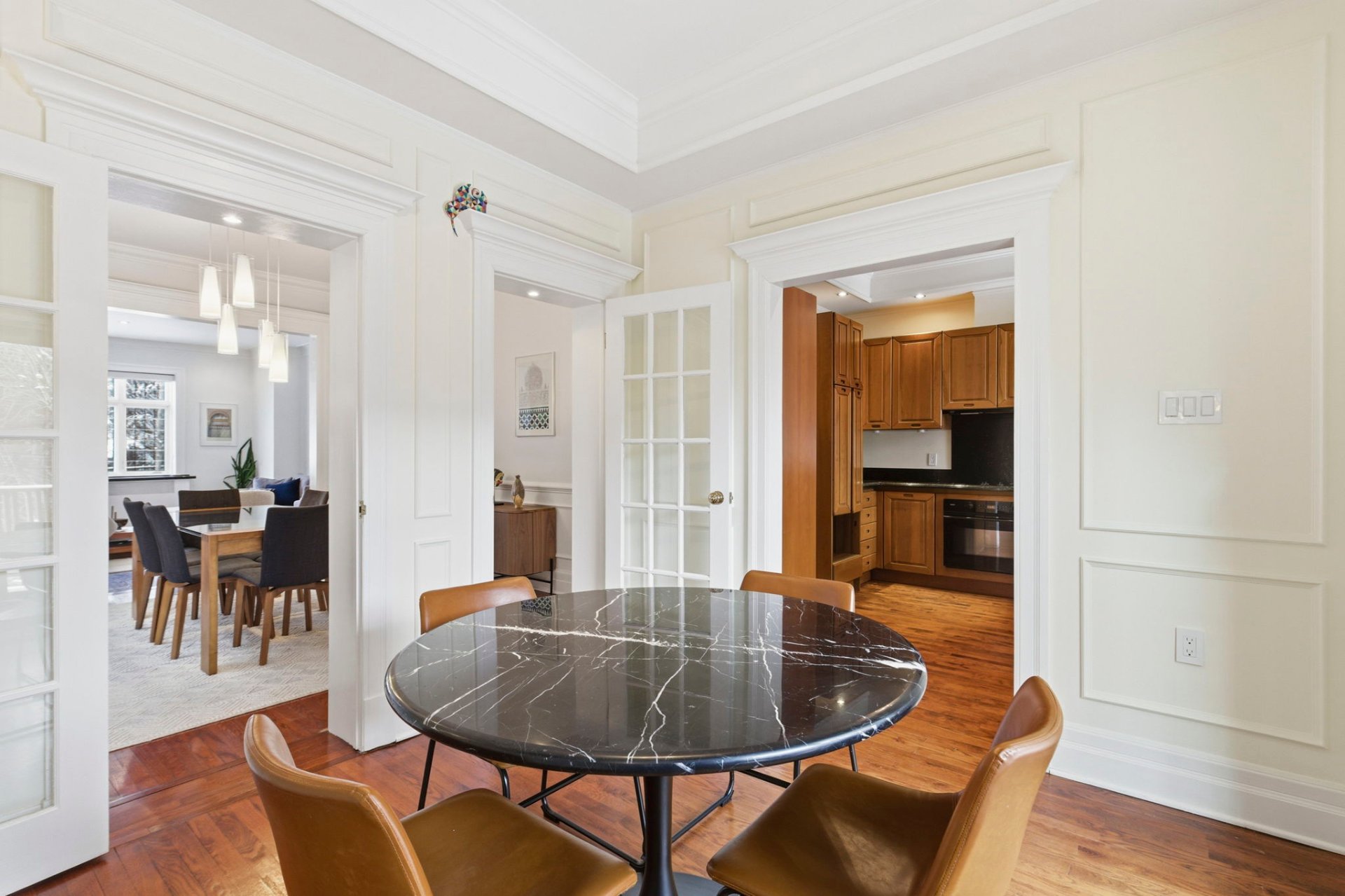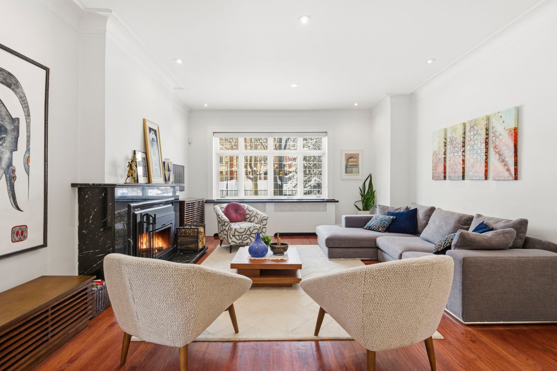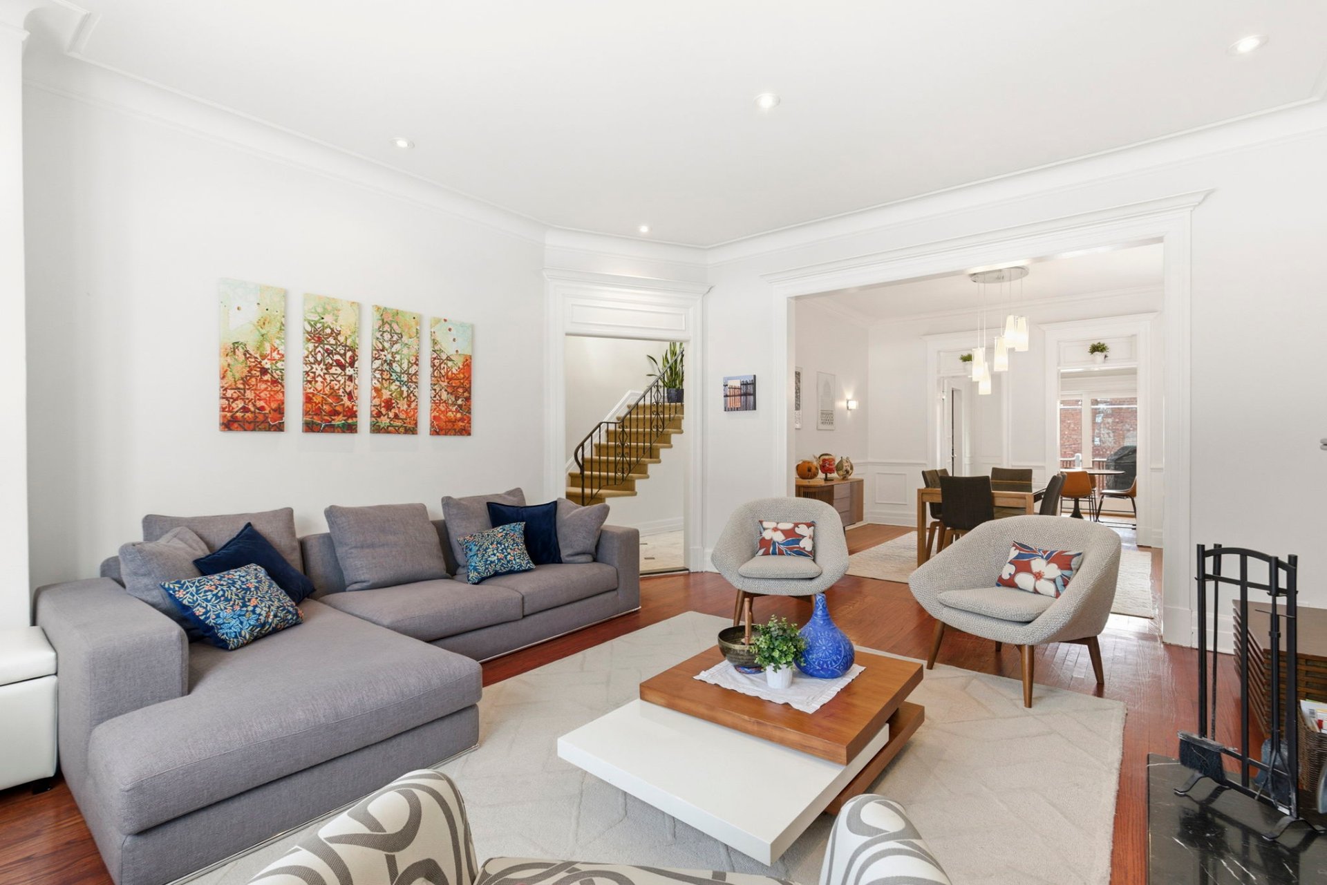 - Bright and spacious living room with fireplace, opening onto a formal dining room