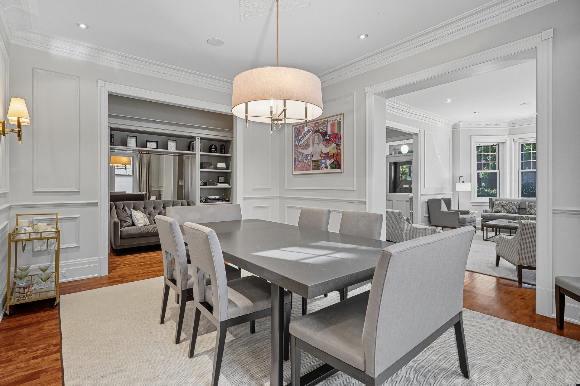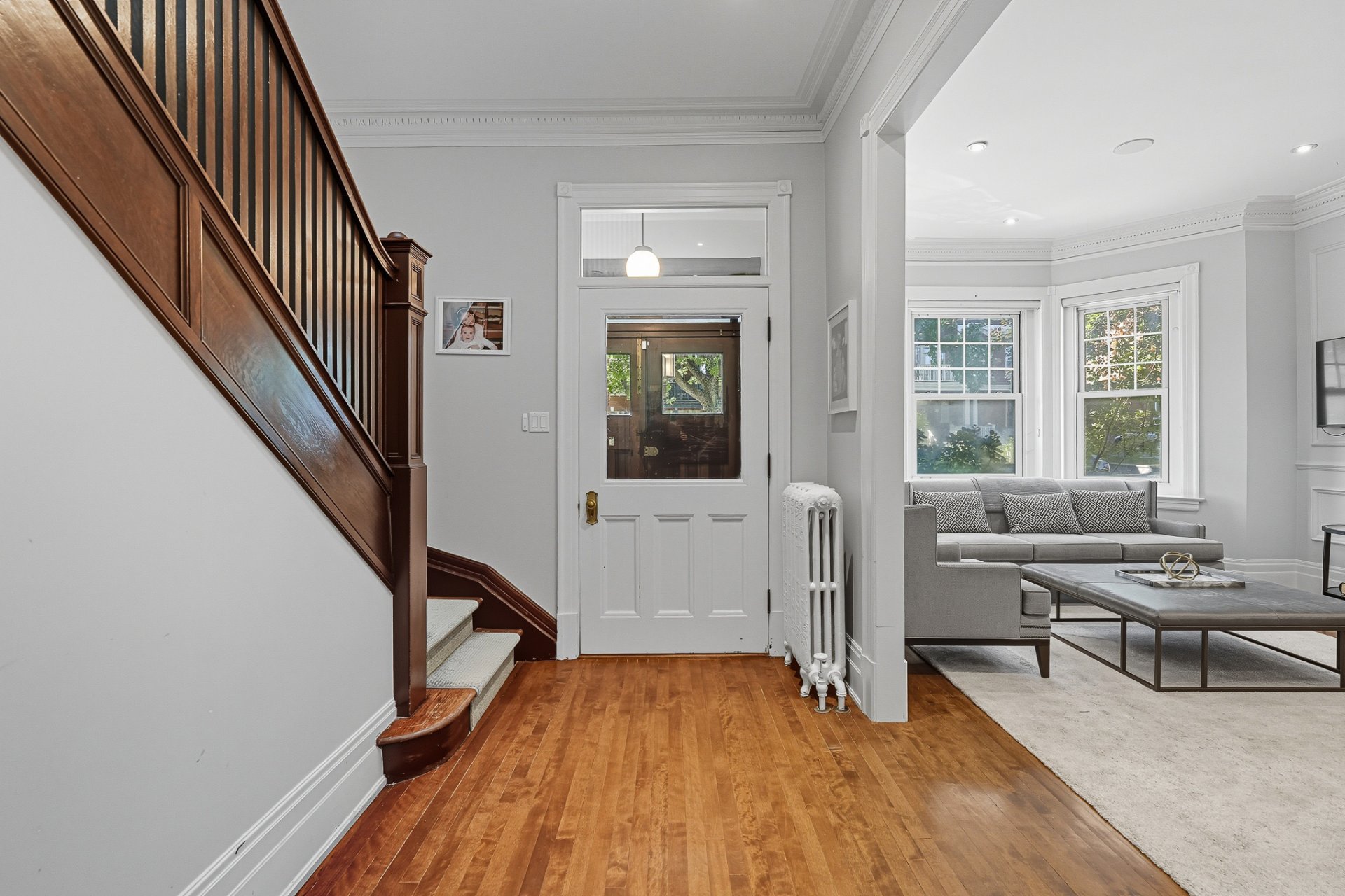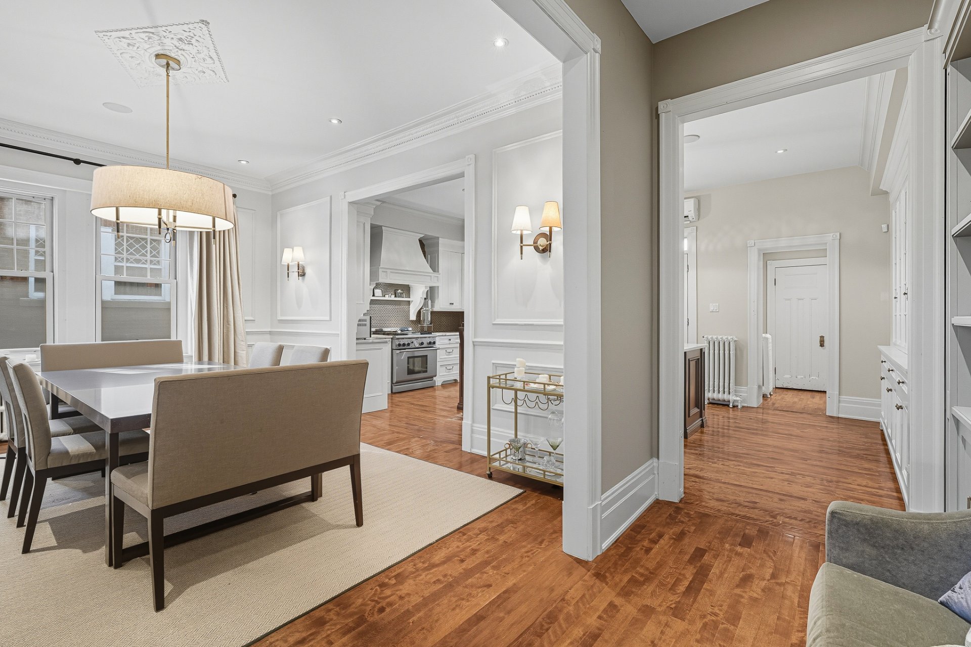 A gracious entrance reveals refined interiors with rich hardwood floors and timeless architectural detail. The formal living room, anchored by a gas fireplace, flows into a sophisticated dining room, ideal for entertaining. The gourmet eat-in kitchen offers generous workspace and opens onto a private terrace and landscaped garden for seamless indoor-outdoor living.