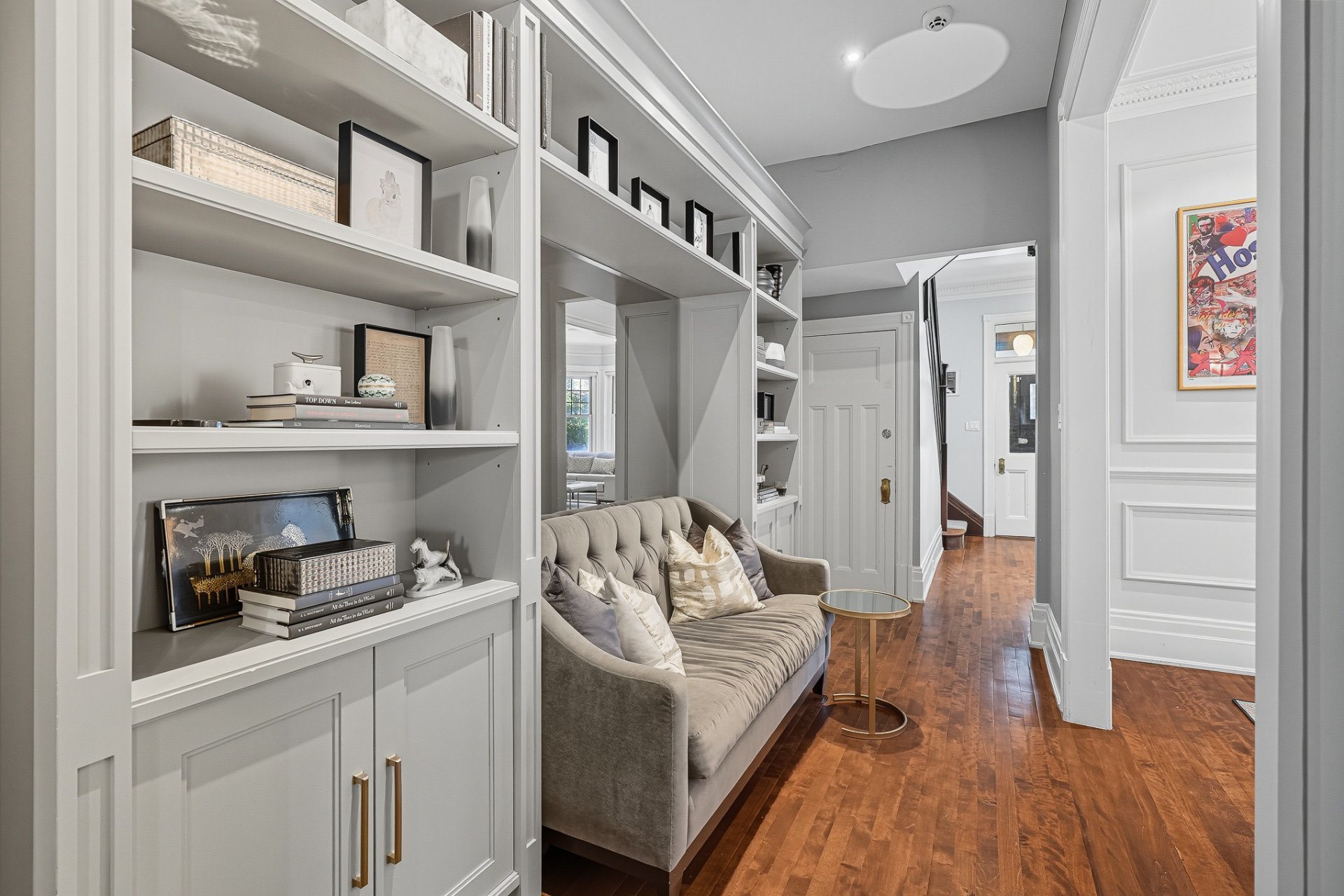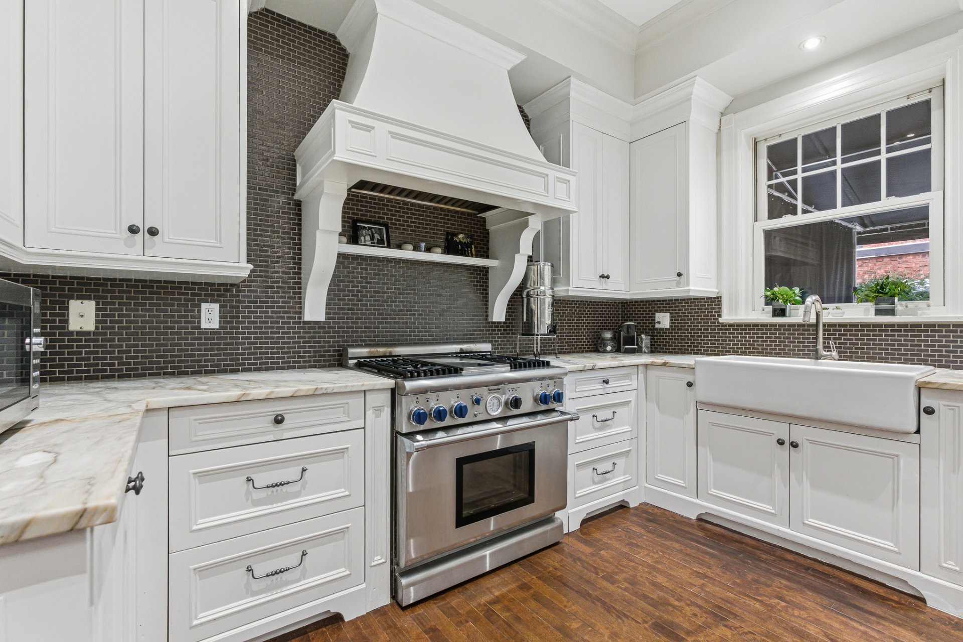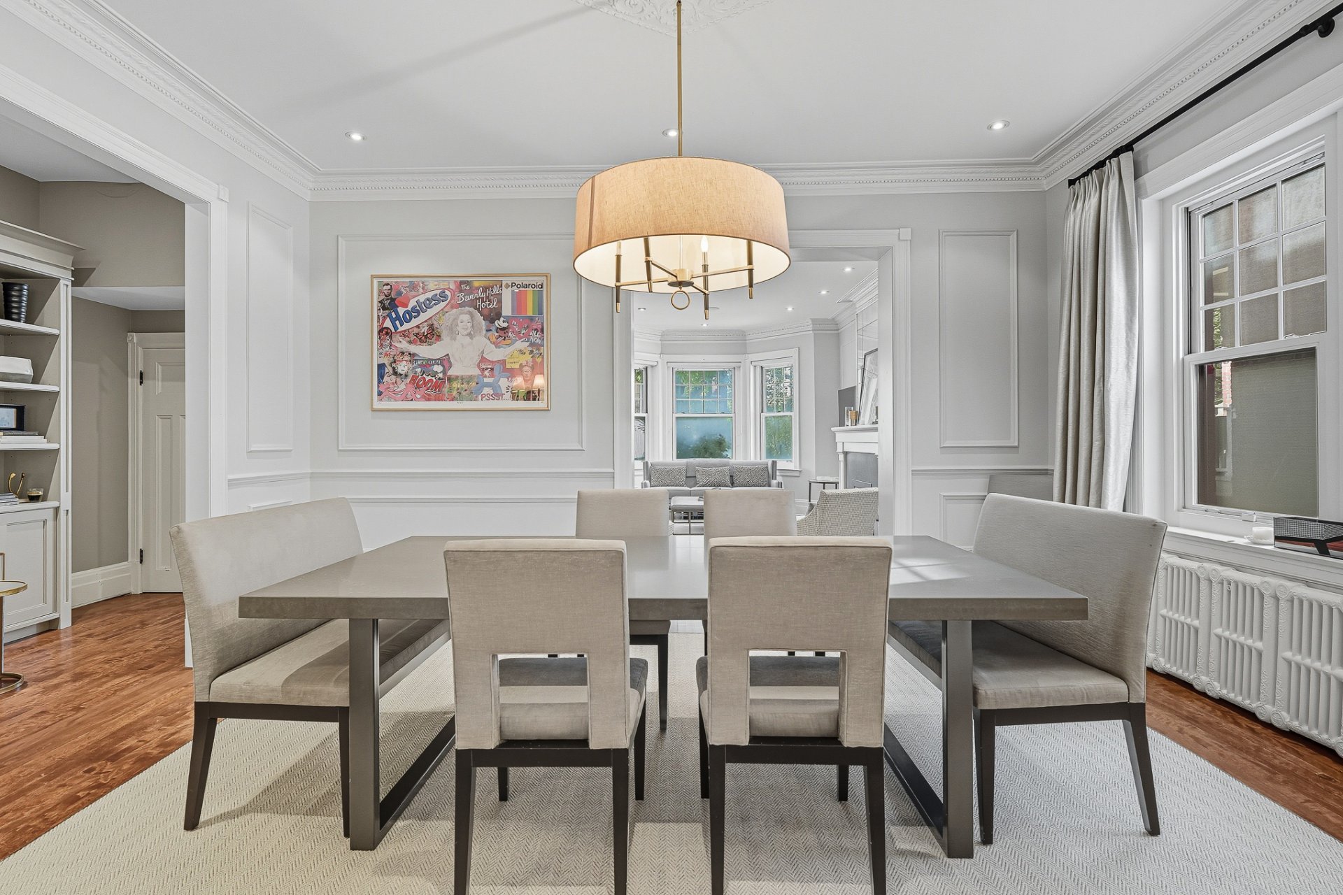 A gracious entrance reveals refined interiors with rich hardwood floors and timeless architectural detail. The formal living room, anchored by a gas fireplace, flows into a sophisticated dining room, ideal for entertaining. The gourmet eat-in kitchen offers generous workspace and opens onto a private terrace and landscaped garden for seamless indoor-outdoor living.