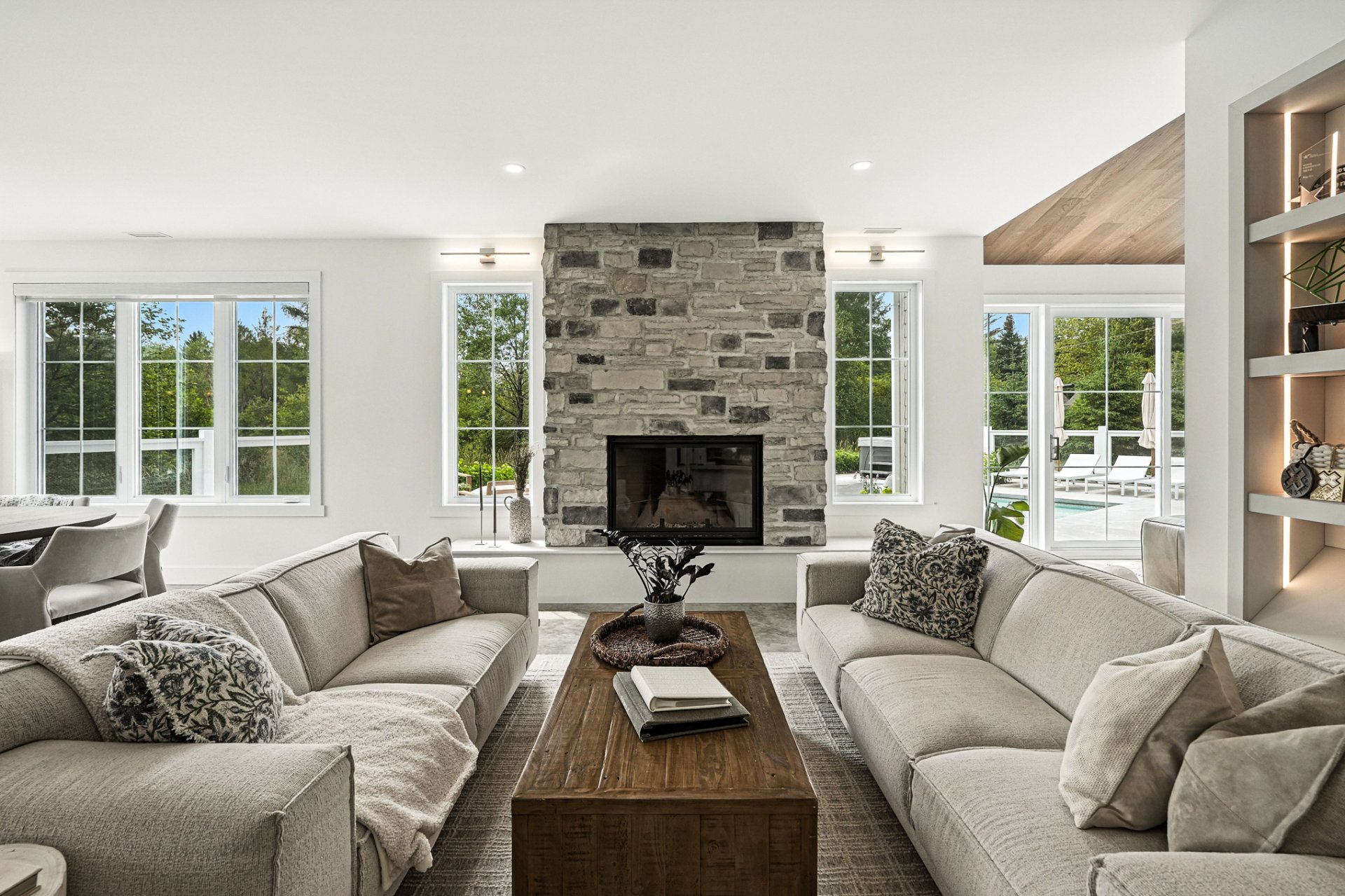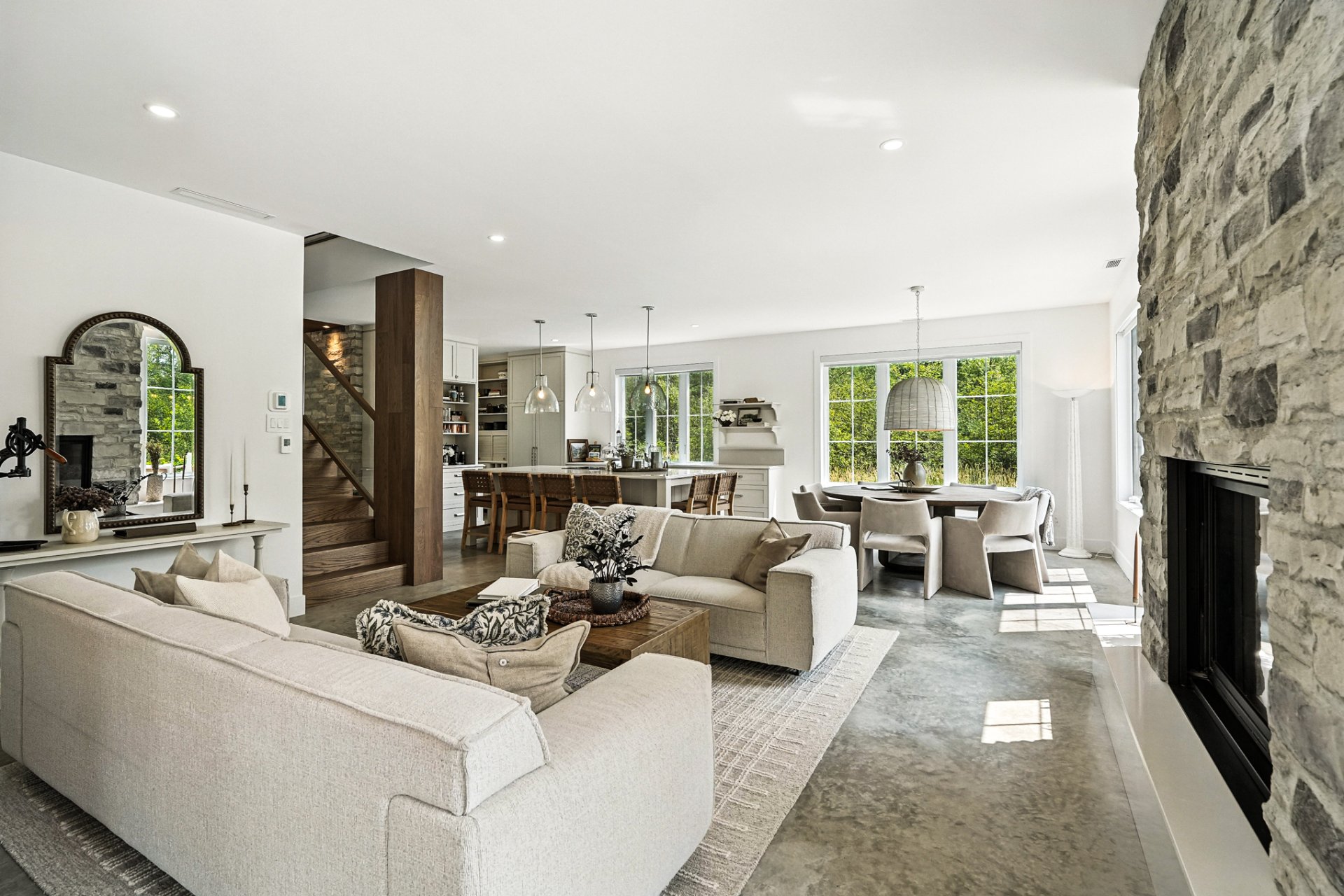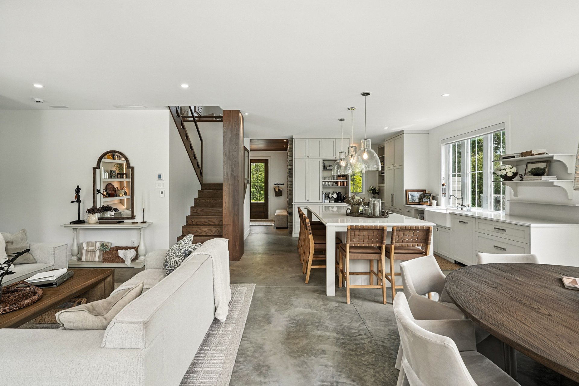 With an East Coast flair, this elegantly styled residence blends cedar shingles, stone, wood, and concrete in a warm, neutral palette. Carefully chosen lighting helps create a cozy, enveloping atmosphere. The kitchen, a true centerpiece, will delight culinary enthusiasts. The dining room, bathed in natural light, opens seamlessly onto an inviting living room enhanced by a wood-burning fireplace. Every detail of the decor has been meticulously thought out, and the transition from one room to another flows naturally in this space where one instantly feels at home. A private haven where nature and refinement come together.