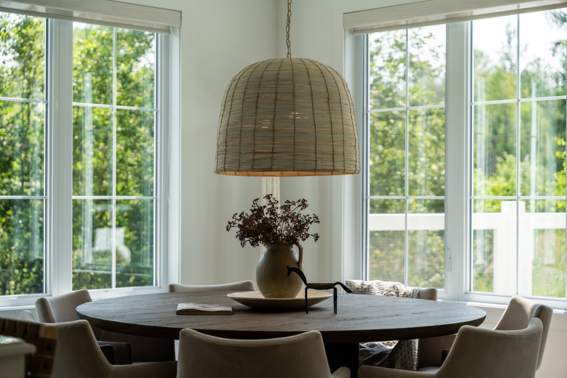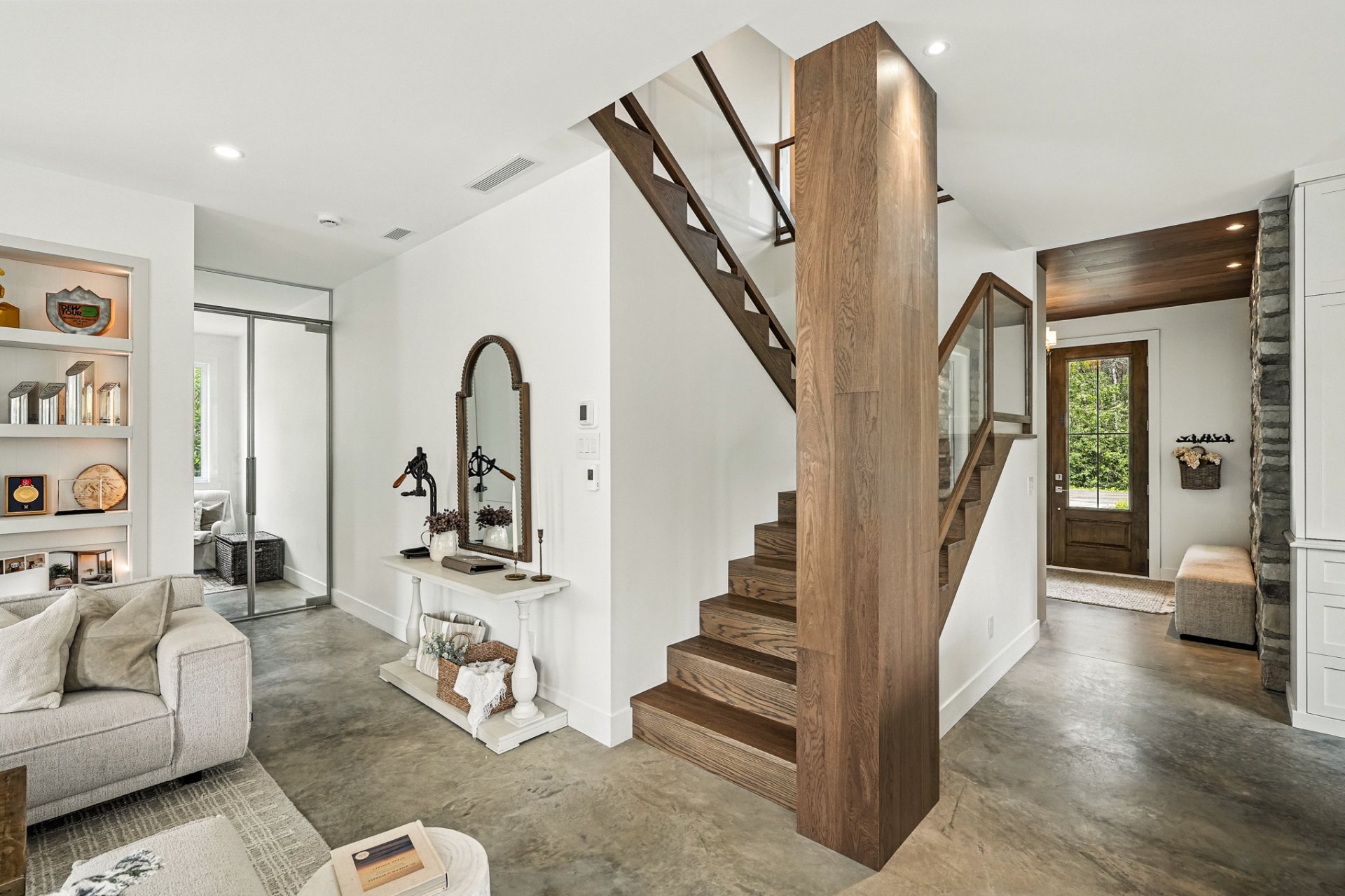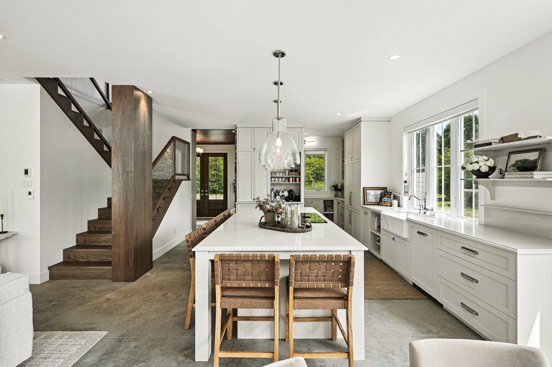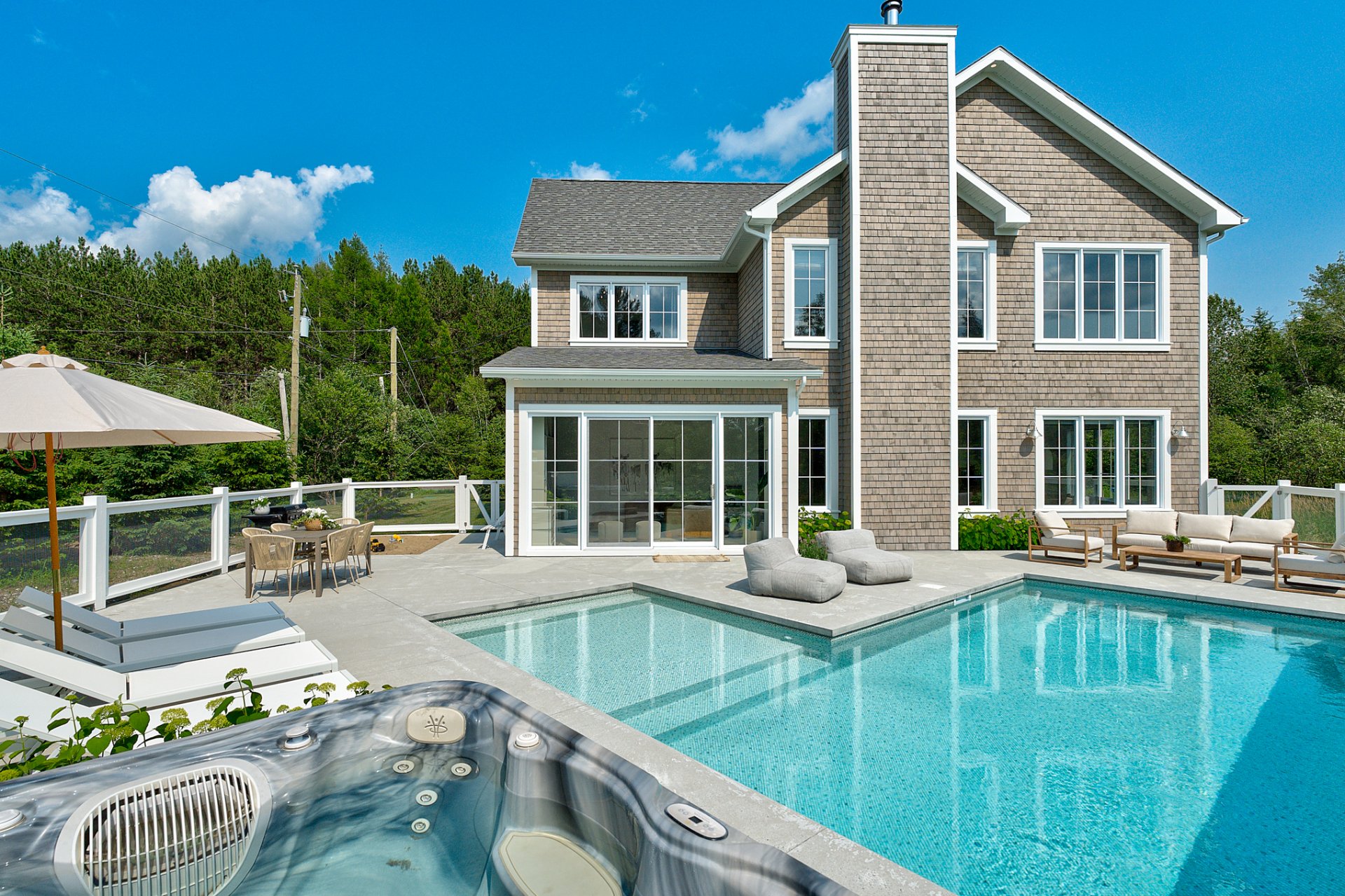With an East Coast flair, this elegantly styled residence blends cedar shingles, stone, wood, and concrete in a warm, neutral palette. Carefully chosen lighting helps create a cozy, enveloping atmosphere. The kitchen, a true centerpiece, will delight culinary enthusiasts. The dining room, bathed in natural light, opens seamlessly onto an inviting living room enhanced by a wood-burning fireplace. Every detail of the decor has been meticulously thought out, and the transition from one room to another flows naturally in this space where one instantly feels at home. A private haven where nature and refinement come together.
