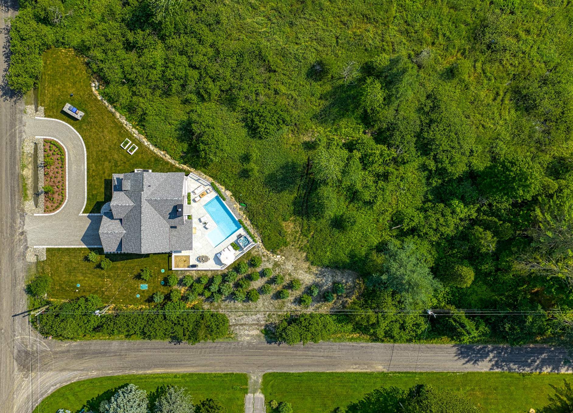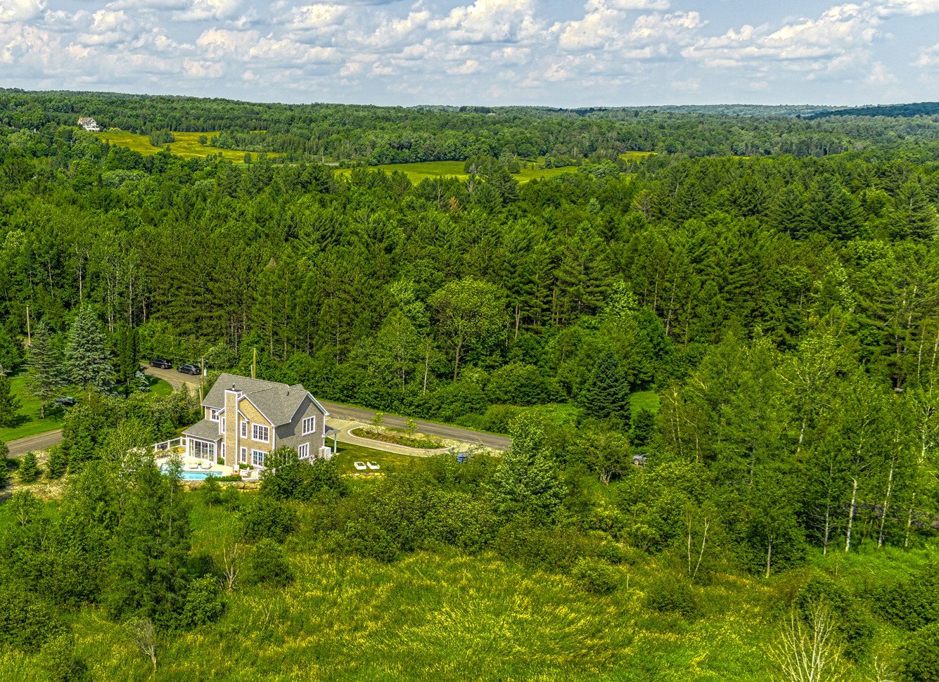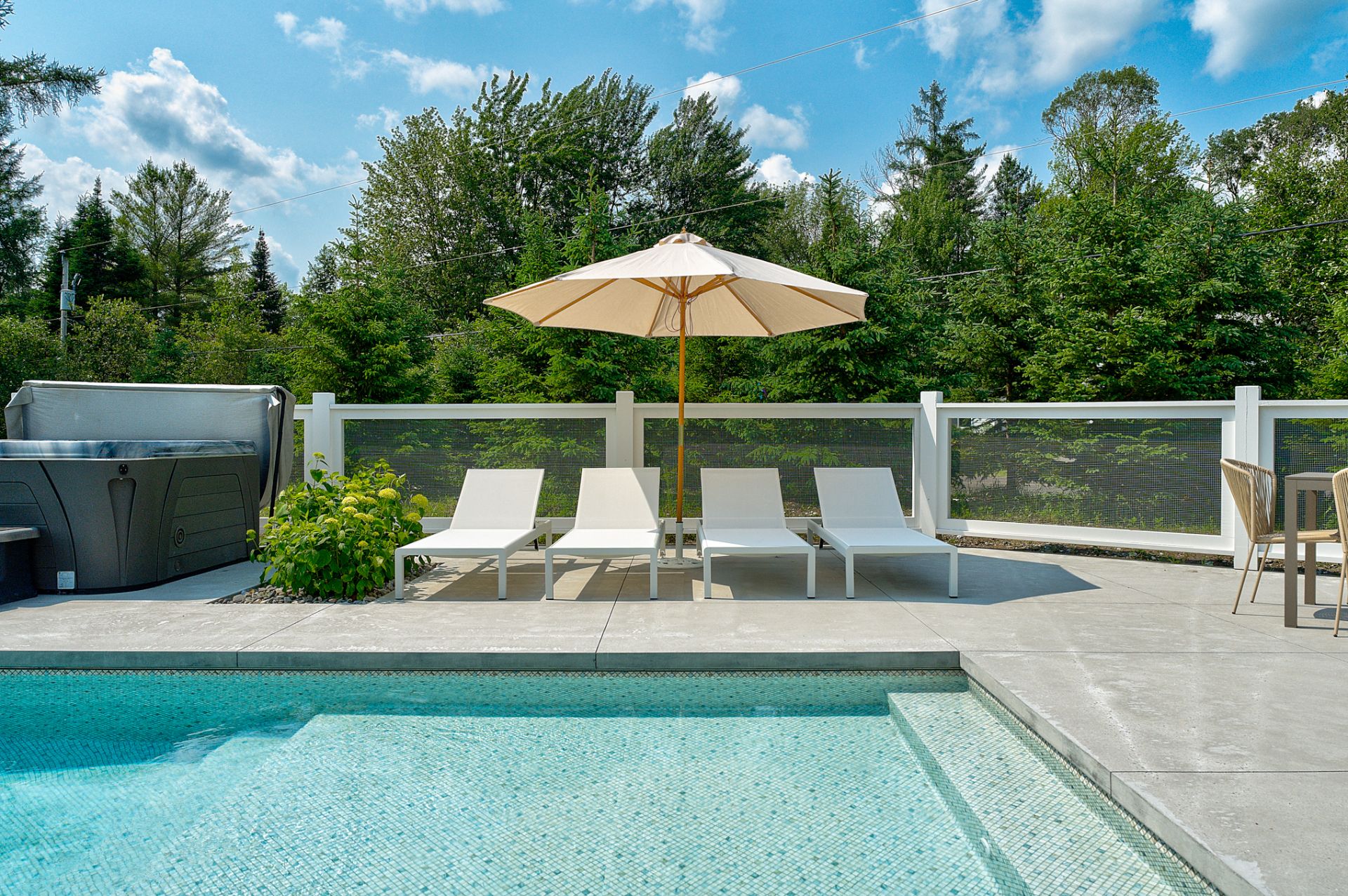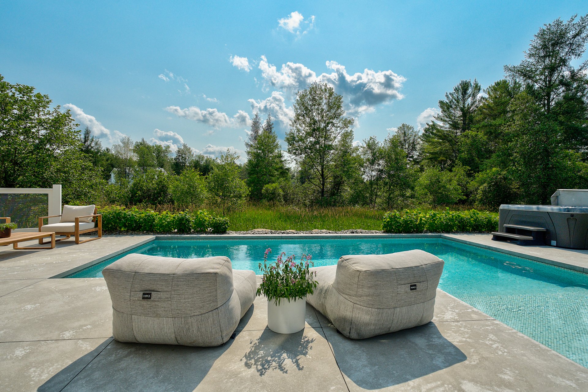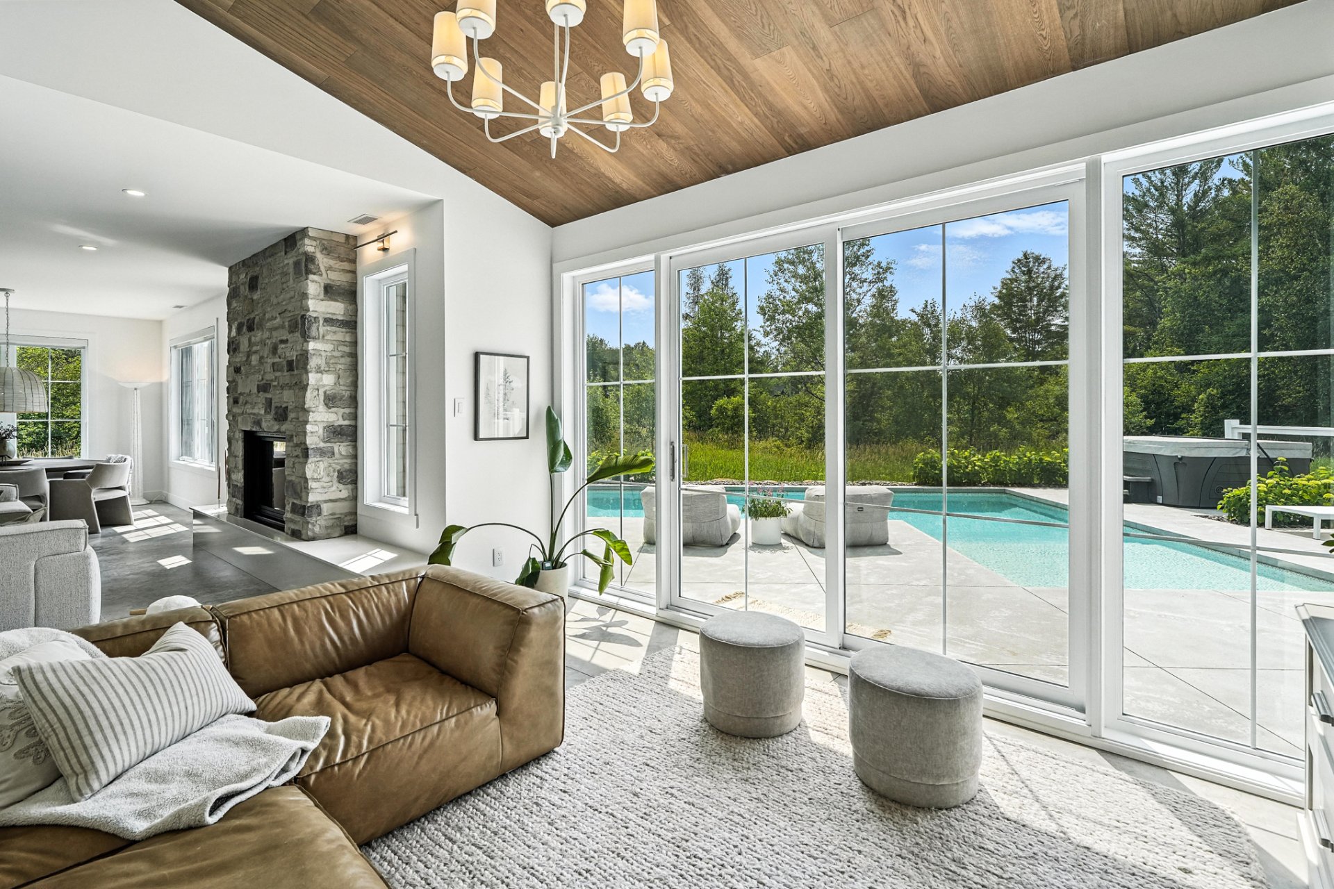 Set on a 2.25-acre lot on a quiet cul-de-sac, the home enjoys full western exposure, allowing the backyard to bask in sunlight until sunset and offering seasonal views of Bromont Mountain. A beautiful in-ground, heated saltwater pool, integrated spa, and meticulous landscaping create a refined and inviting outdoor living space.