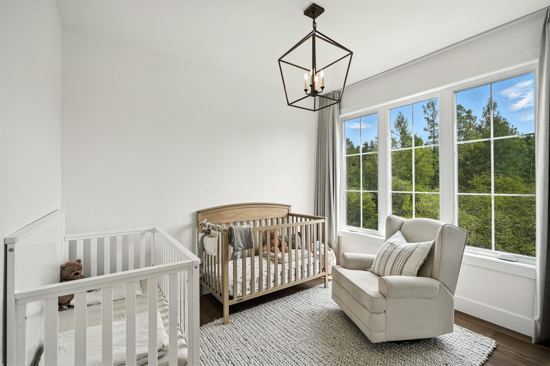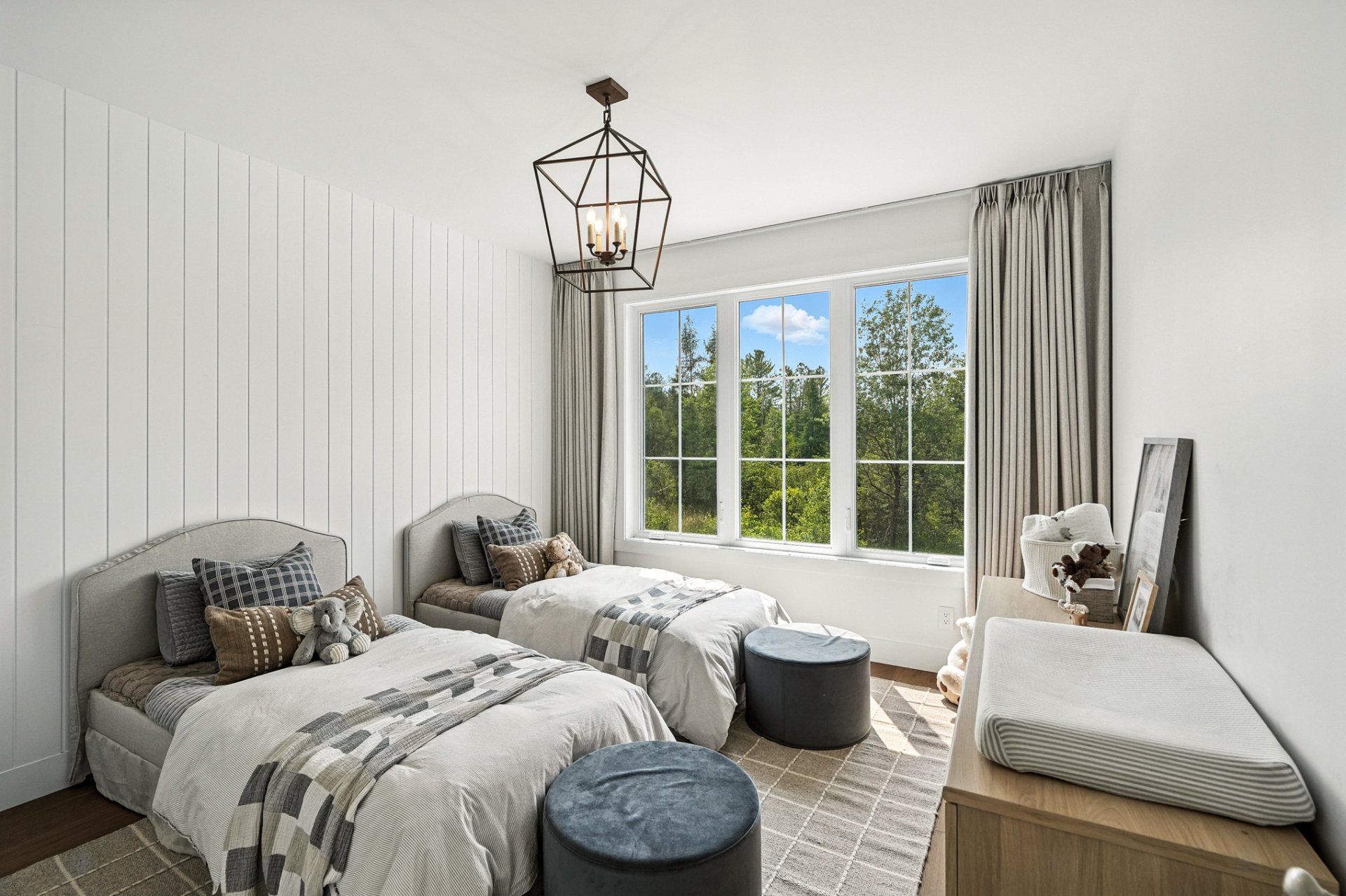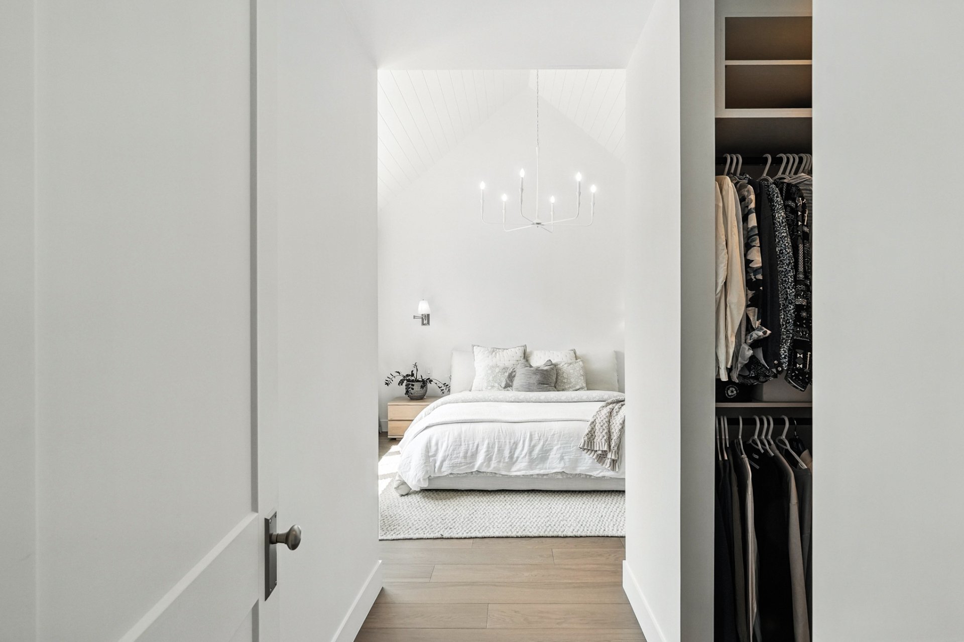 Upstairs, the fluid architectural design continues with a wooden staircase and glass railing. The floor plan includes four bedrooms. The primary suite, with its cathedral ceiling clad in wood paneling, features a luxurious ensuite bathroom and a built-in walk-in closet, creating a peaceful retreat ideal for rest and relaxation. There's also a spacious guest room with a cathedral ceiling, two children's bedrooms with a shared central closet, and a second elegantly designed bathroom.