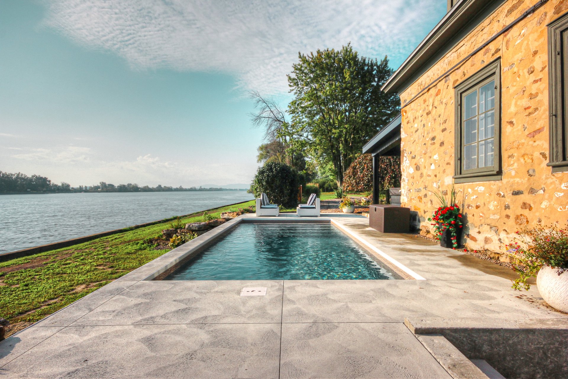 Inside, the kitchen with cathedral ceilings combines noble materials and impressive stone walls. A spectacular ground floor suite with a wood-burning fireplace and abundant windows offers unforgettable sunrises over the river.
