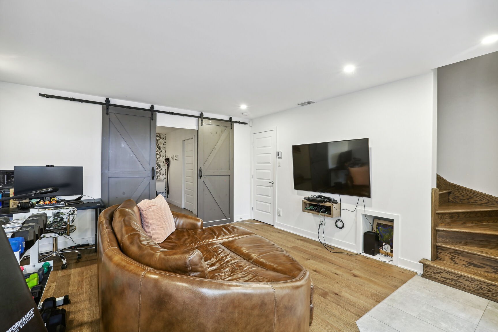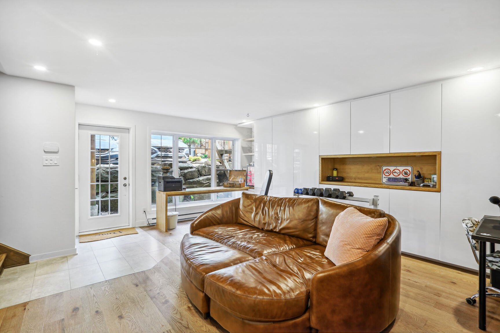 You will find the family room with a large storage wall and a custom-made desk that dresses the room beautifully. Separated by two large sliding doors is the 4th bedroom adjoining the bathroom and the 2nd washer/dryer area. The basement offers great potential for use with its independent exit, high ceilings, and large windows.
