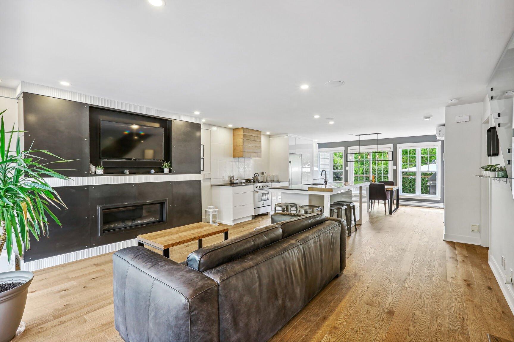 A beautiful open living space, living room, kitchen, and dining room. A powder room with a smart Toto toilet, a large pantry, and a gas fireplace.