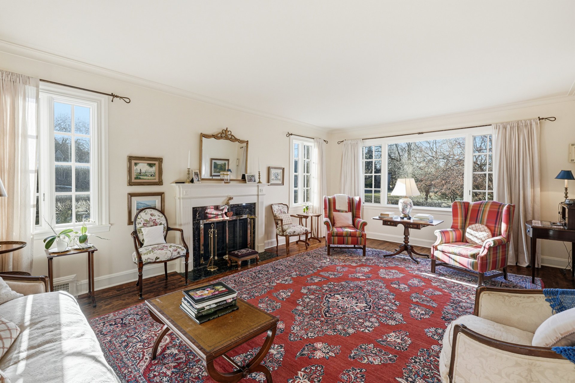 * Elegant living room with large windows and a fireplace, ideal for entertaining.