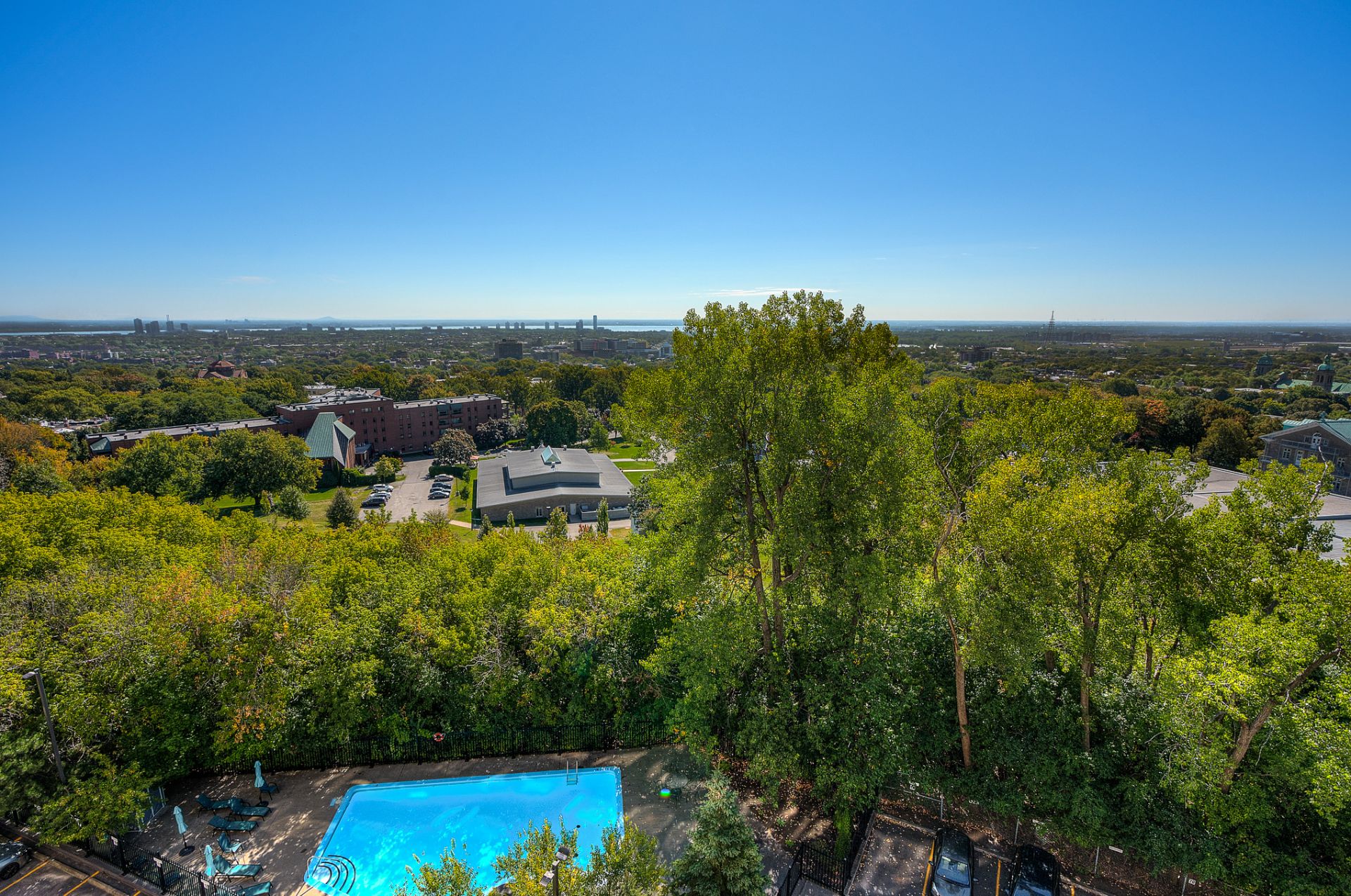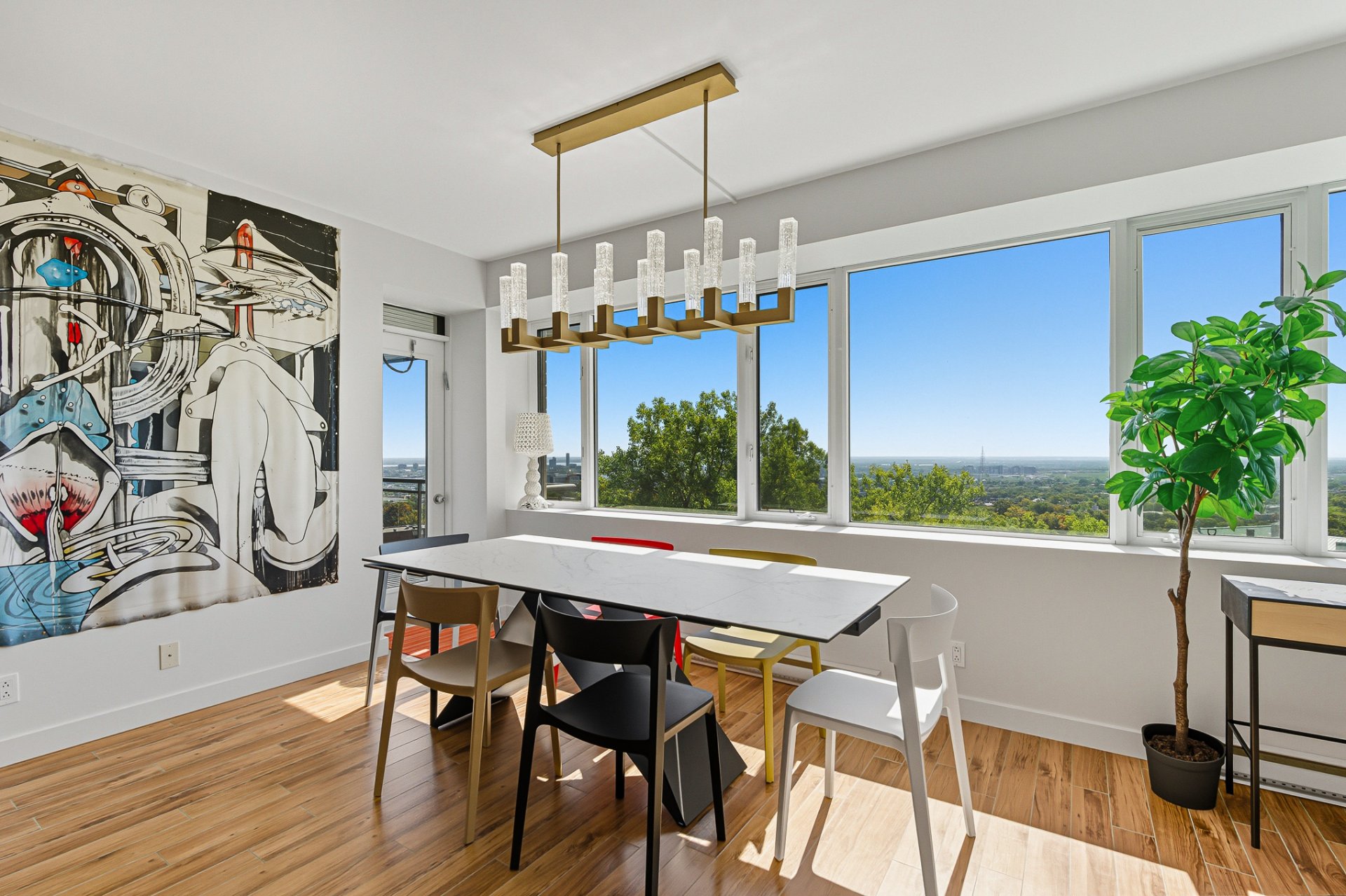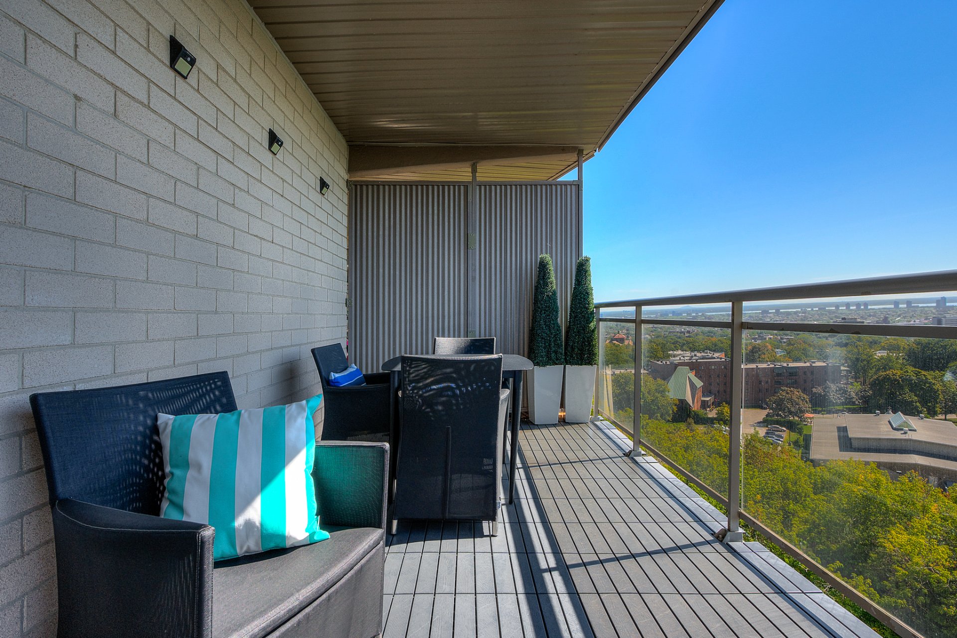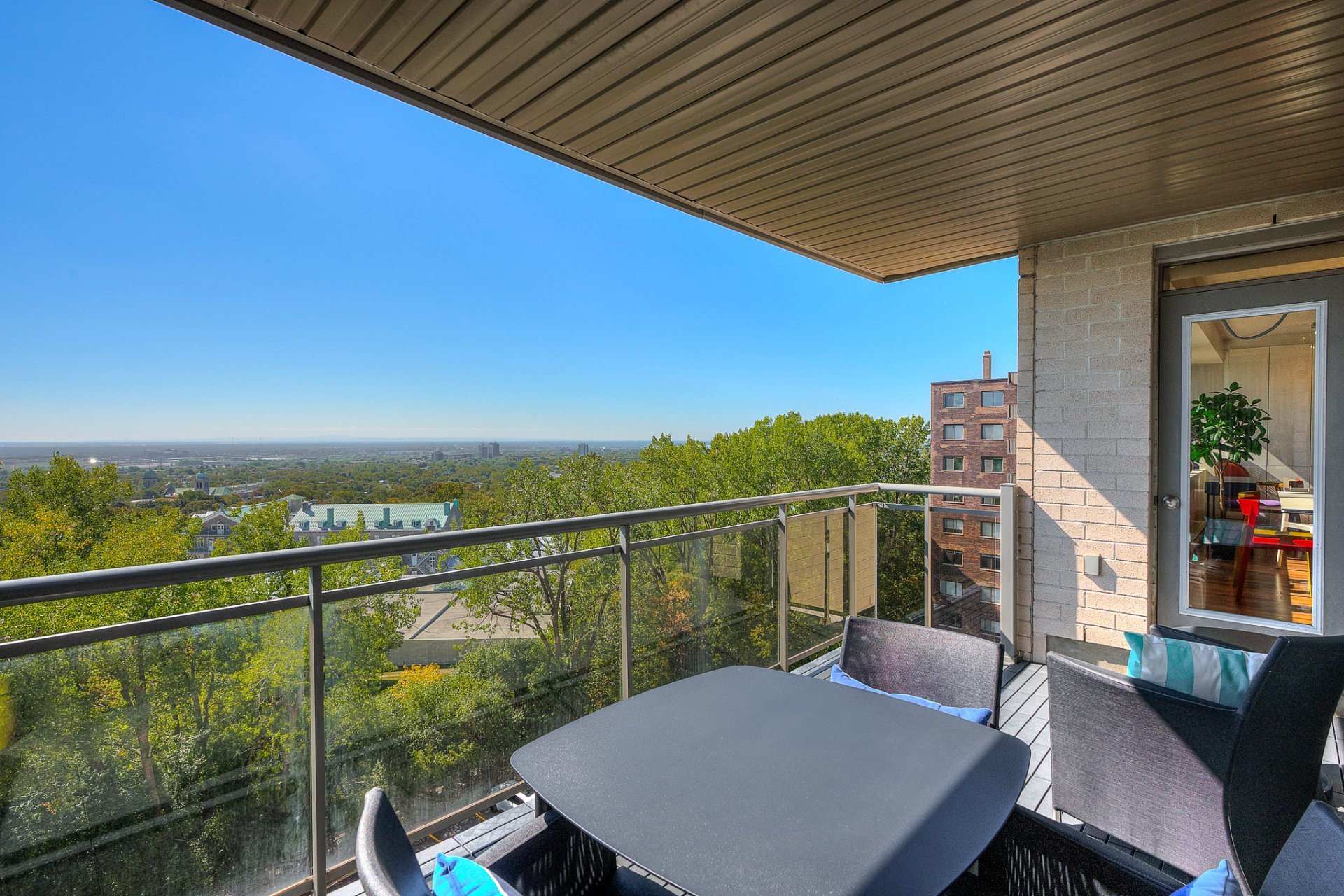 Welcome to the Montebello! Stunning 1-bedroom condo on the 8th floor, south-facing and filled with natural light. Open-concept layout with living room, dining area, and modern kitchen featuring quartz countertops. Elegant bathroom with granite finishes, ventless washer/dryer, and central air conditioning. Enjoy a large private balcony with unobstructed views and one exterior parking space. Ideally located near Westmount, Downtown, Mount Royal Park, Villa-Maria metro, and top-rated schools. Undivided co-ownership (no Welcome Tax).