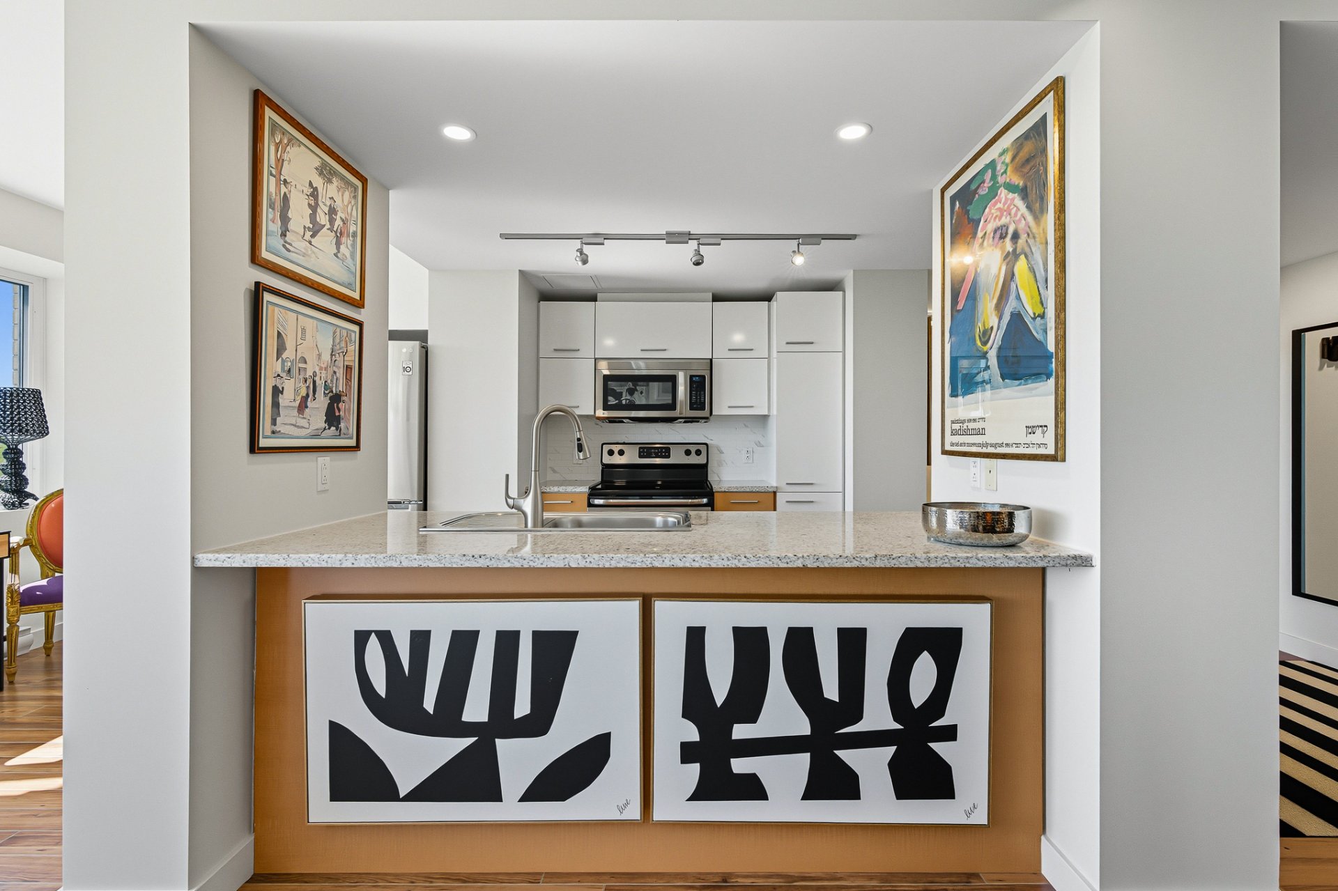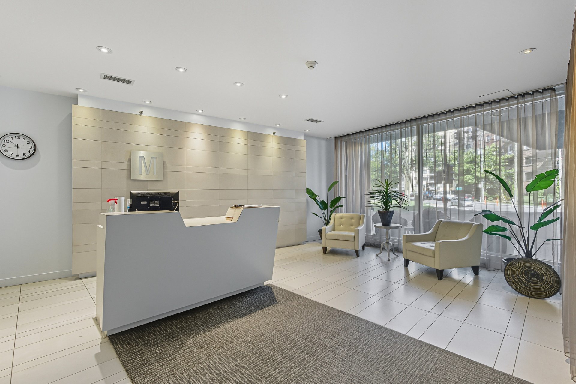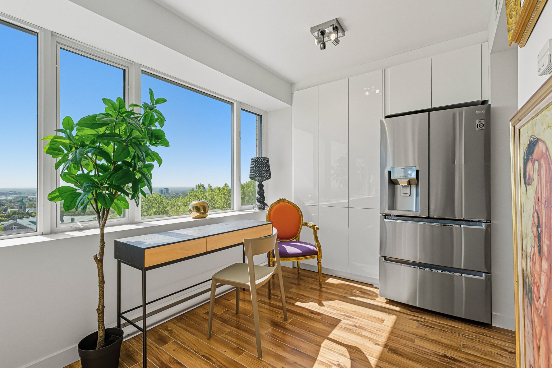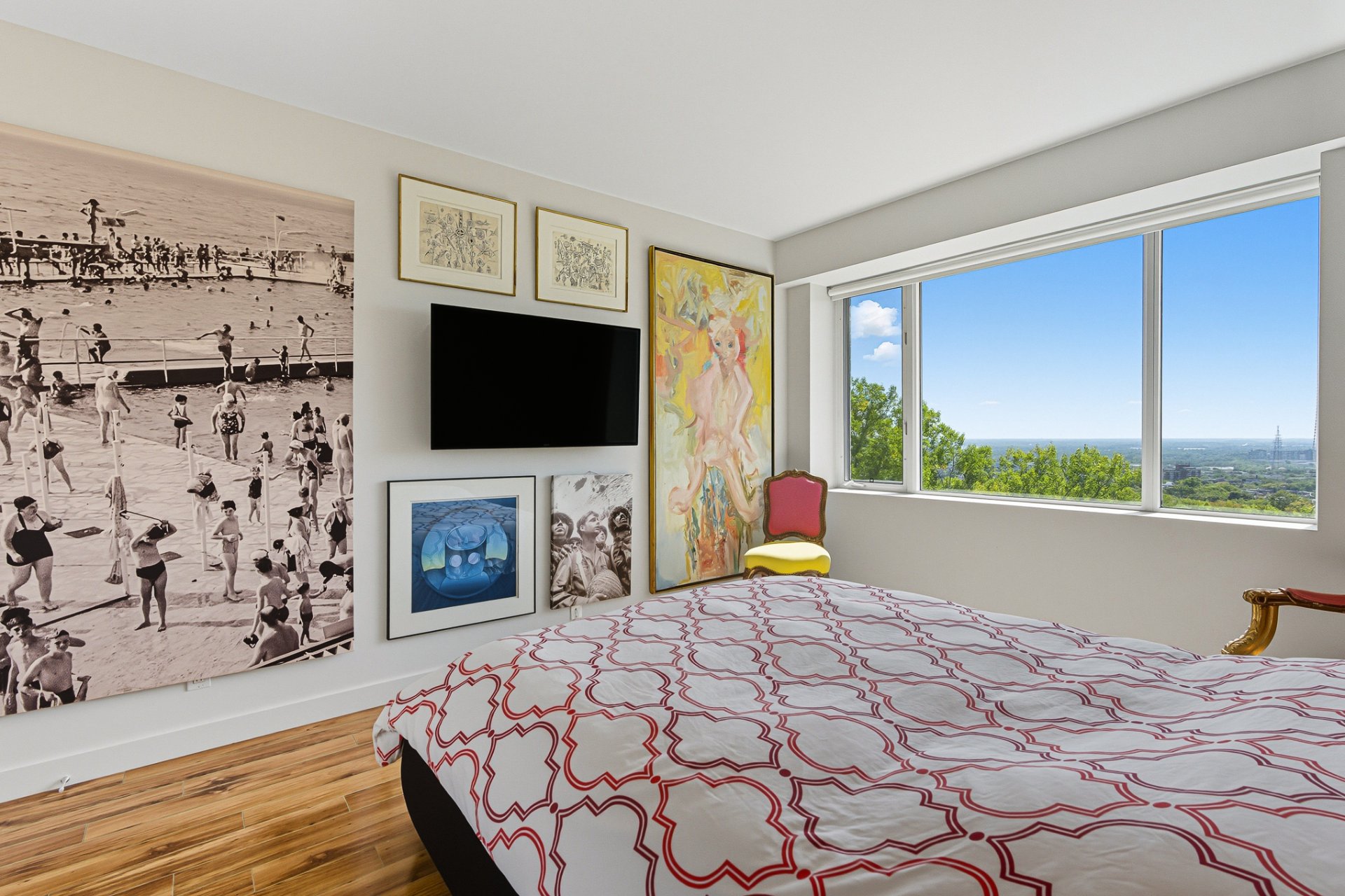 Welcome to the Montebello! Stunning 1-bedroom condo on the 8th floor, south-facing and filled with natural light. Open-concept layout with living room, dining area, and modern kitchen featuring quartz countertops. Elegant bathroom with granite finishes, ventless washer/dryer, and central air conditioning. Enjoy a large private balcony with unobstructed views and one exterior parking space. Ideally located near Westmount, Downtown, Mount Royal Park, Villa-Maria metro, and top-rated schools. Undivided co-ownership (no Welcome Tax).