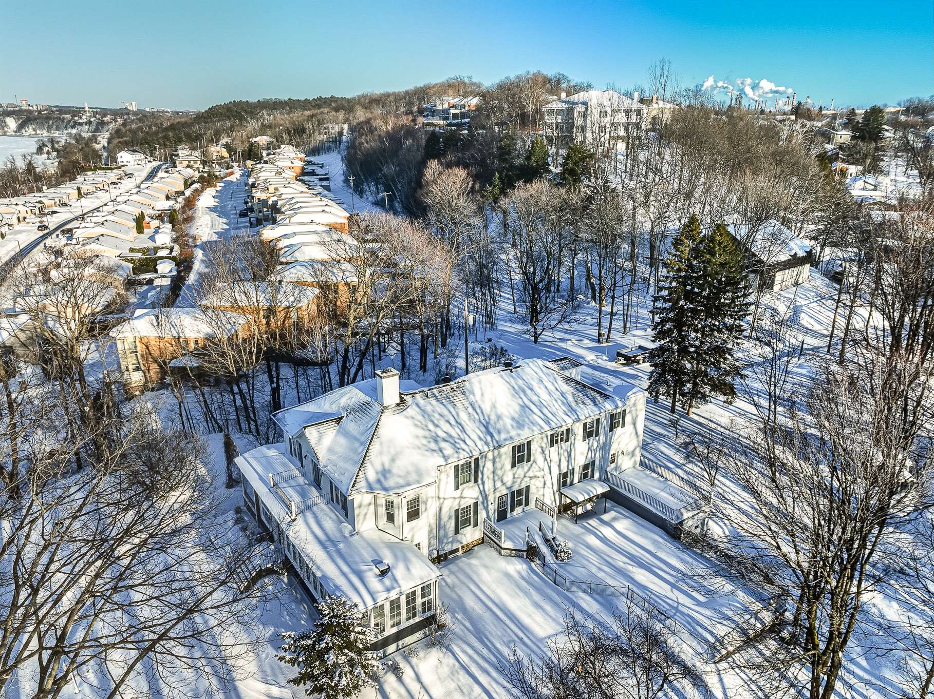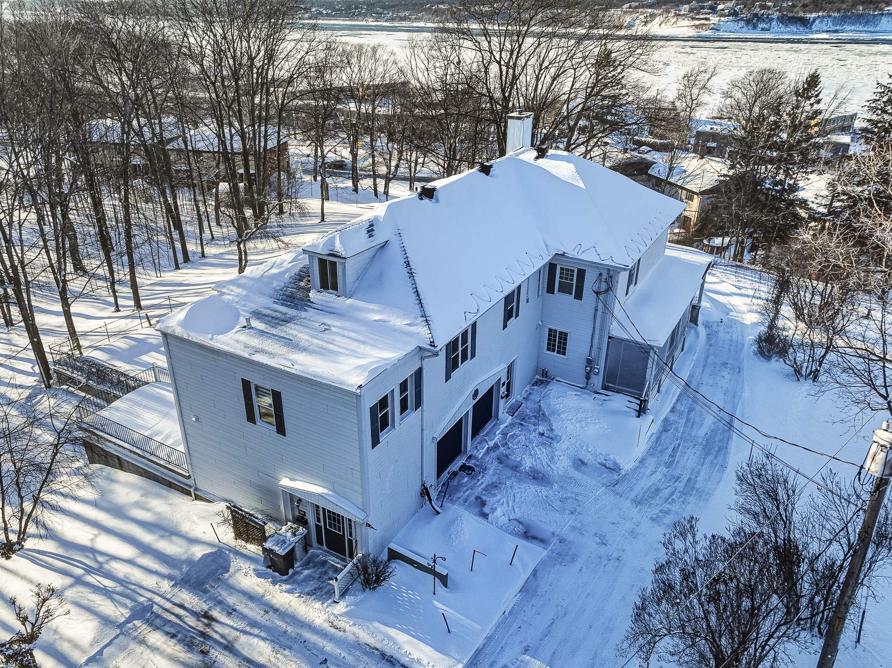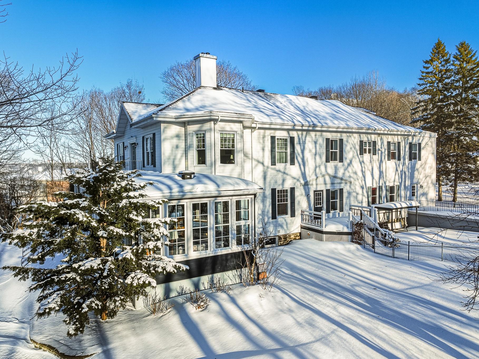 Le Grand Prieuré de Lévis (1890) - A rare heritage estate in the heart of Lévis, just 15 minutes from the bridges. Nestled in an exceptional setting surrounded by mature trees and accessed by a majestic tree-lined driveway, this remarkable ancestral residence will appeal to lovers of character and expansive living spaces. Offering 6,549 sq. ft. of living area: 4 bedrooms, office, boudoir, sun-filled solarium and a spacious attic with great potential. River views in summer. In-ground pool, attached double garage, basement garage and a 5½ apartment (available March 2026). Private road with gatehouse.